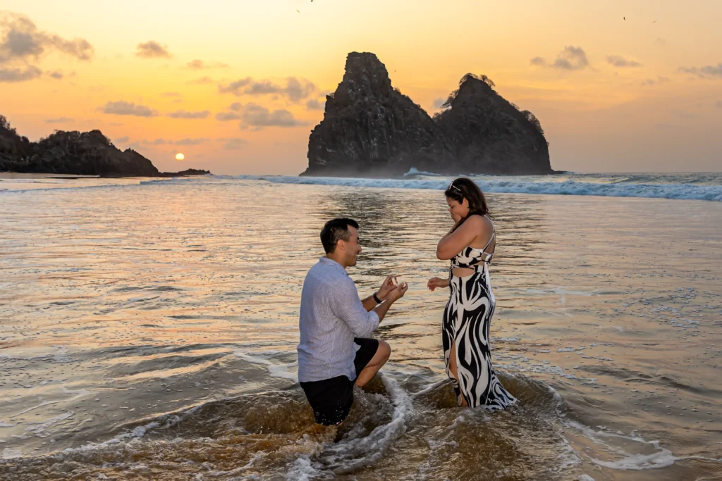 Ensaio fotográfico em Fernando de Noronha – Renata e Gustavo As fotos estão em baixa resolução para garantir uma navegação mais rápida e leve* Ensaio fotográfico em Fernando de Noronha – Renata e Gustavo: Onde o sol abraça o amor Você provavelmente concorda que Fernando de Noronha não é apenas um destino, mas um estado de espírito. Quem viaja para a ilha busca desconexão do caos e uma conexão profunda com o que é essencial. Para muitos casais, esse é o cenário ideal para celebrar uma história a dois, mas surge a dúvida: como transformar esse sentimento em imagens que não pareçam apenas fotos de viagem, mas sim arte? Neste artigo, você vai descobrir como planejamos e executamos o ensaio fotográfico em Fernando de Noronha – Renata e Gustavo. Vou te guiar pelo roteiro estratégico que escolhemos — da Pedra do Bode ao pôr do sol épico — para que você possa visualizar como o seu próprio registro pode ser inesquecível. O ponto de partida: A imponente Pedra do Bode O ensaio começou em um dos pontos mais estratégicos e, por vezes, subestimados da ilha. A Pedra do Bode fica situada exatamente entre a Praia do Bode e a Praia do Americano, oferecendo uma vista panorâmica que é de tirar o fôlego. Para um ensaio fotográfico para casais, esse local é perfeito porque proporciona: Uma perspectiva elevada do Morro do Pico; Contraste entre as rochas escuras e o azul infinito do mar; Privacidade para que o casal se solte logo nos primeiros cliques. Renata e Gustavo começaram aqui, aproveitando a brisa e a imensidão do cenário para entrar no clima do ensaio de forma leve e espontânea. A fenda instagramável da Praia do Americano Seguindo o nosso trajeto, descemos para a Praia do Americano. Esta é uma praia menor, mais selvagem e que guarda um dos segredos favoritos dos fotógrafos em Noronha: uma fenda entre as pedras que cria uma moldura natural perfeita. Essa “fenda instagramável” permite um jogo de luz e sombra único, ideal para fotos mais íntimas e artísticas. É o momento do ensaio em que o foco sai da paisagem ampla e se volta totalmente para a troca de olhares e a proximidade do casal. O resultado são registros com uma estética editorial, sem perder a naturalidade que a ilha exige. Pôr do sol na Praia do Bode: O encerramento inesquecível Para finalizar o ensaio fotográfico em Fernando de Noronha – Renata e Gustavo, retornamos à Praia do Bode. Se existe um lugar onde a “golden hour” (hora dourada) parece ter mais brilho, é ali. Enquanto o sol descia, tingindo o céu de tons de laranja e rosa, Renata e Gustavo puderam simplesmente aproveitar o momento. As fotos finais capturaram essa entrega: pés na areia, a espuma das ondas e o Morro do Irmãos ao fundo, servindo de testemunha para um amor que agora está devidamente eternizado. Planeje o seu registro em Noronha Um ensaio fotográfico para casais em um destino tão exclusivo exige sensibilidade e um olhar que entenda a dinâmica das marés e da luz da ilha. O roteiro de Renata e Gustavo é a prova de que, com o planejamento certo, cada minuto em Noronha vira uma obra de arte. Se você também quer guardar essas memórias com a mesma entrega e poesia, vamos conversar?