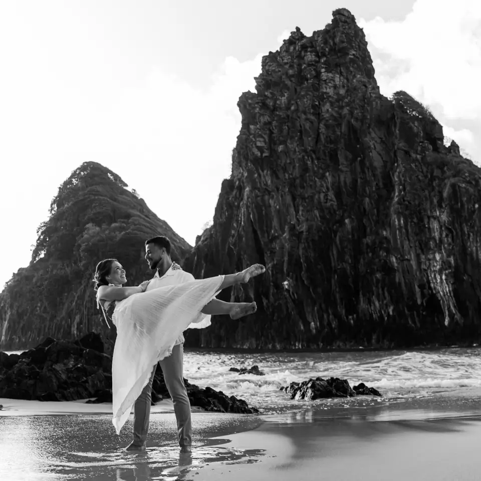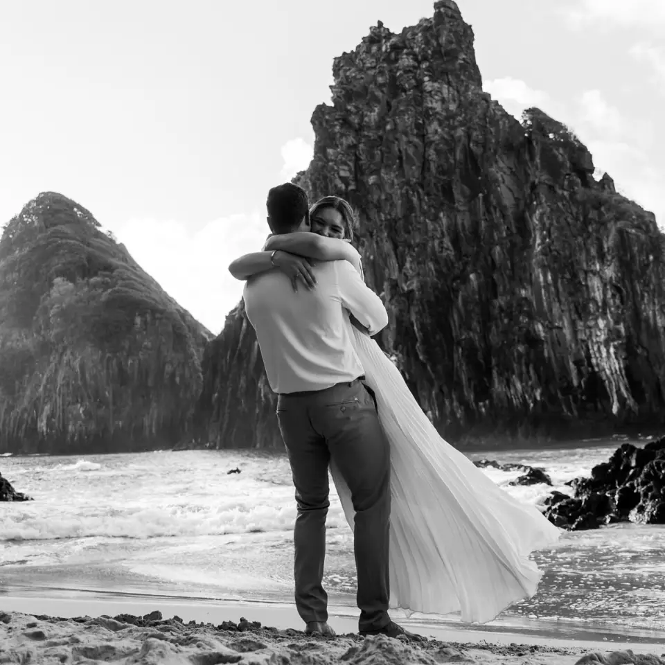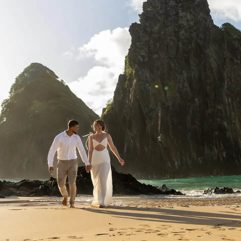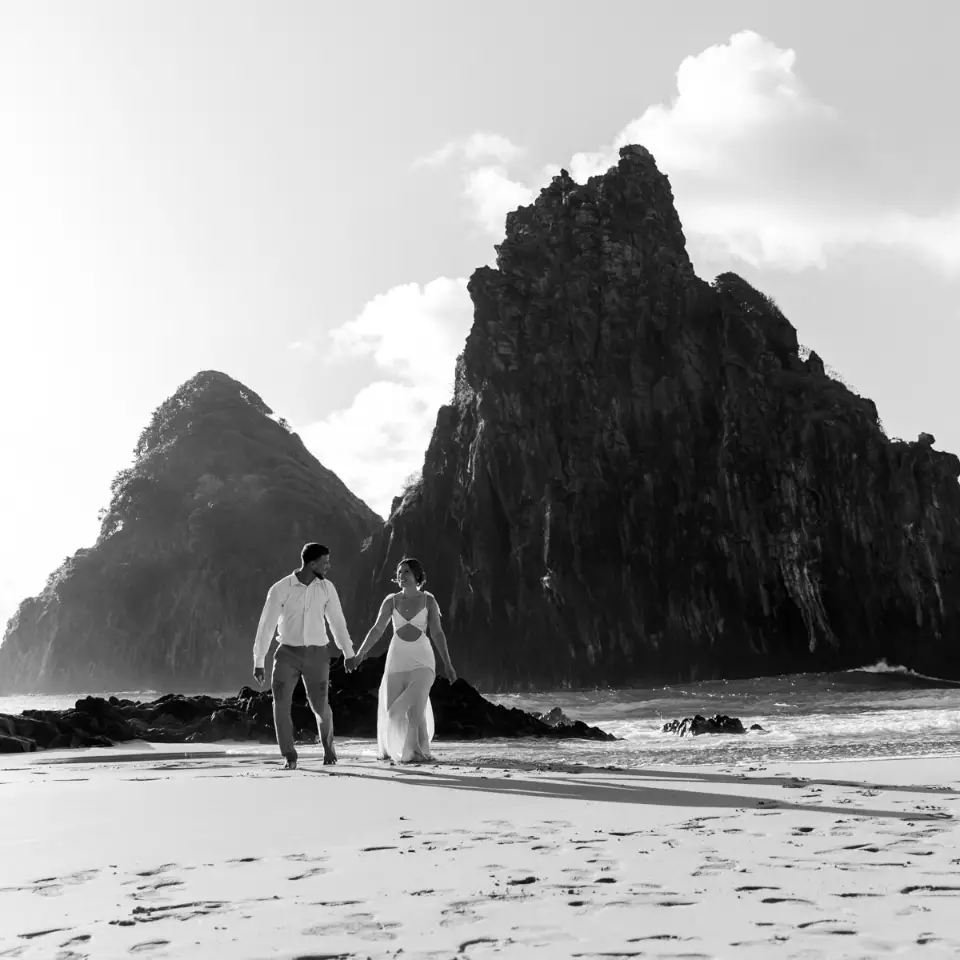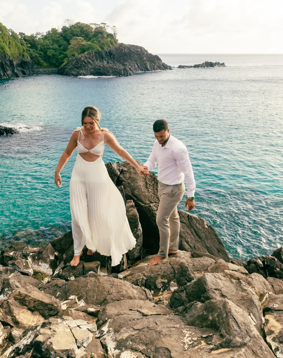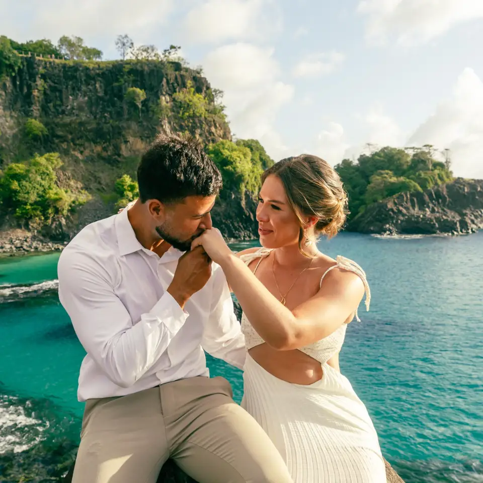 Logo após o “sim”, seguimos para o que chamamos de “escritório”: as paisagens deslumbrantes da ilha. Começamos pelo Mirante dos Dois Irmãos, que nos presenteou com aquela vista icônica que nunca cansa de surpreender. Ali, entre o azul do mar e a imensidão das rochas, a Adriele e o Silvio puderam relaxar e celebrar a nova fase.
