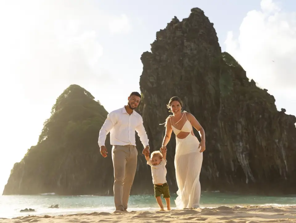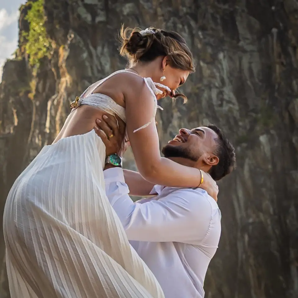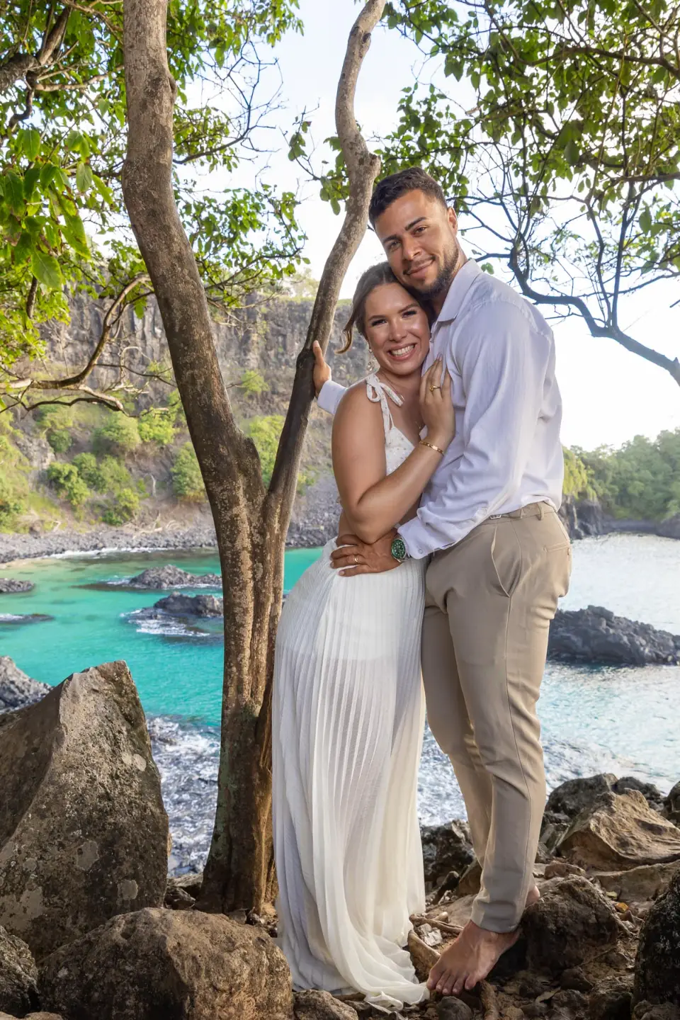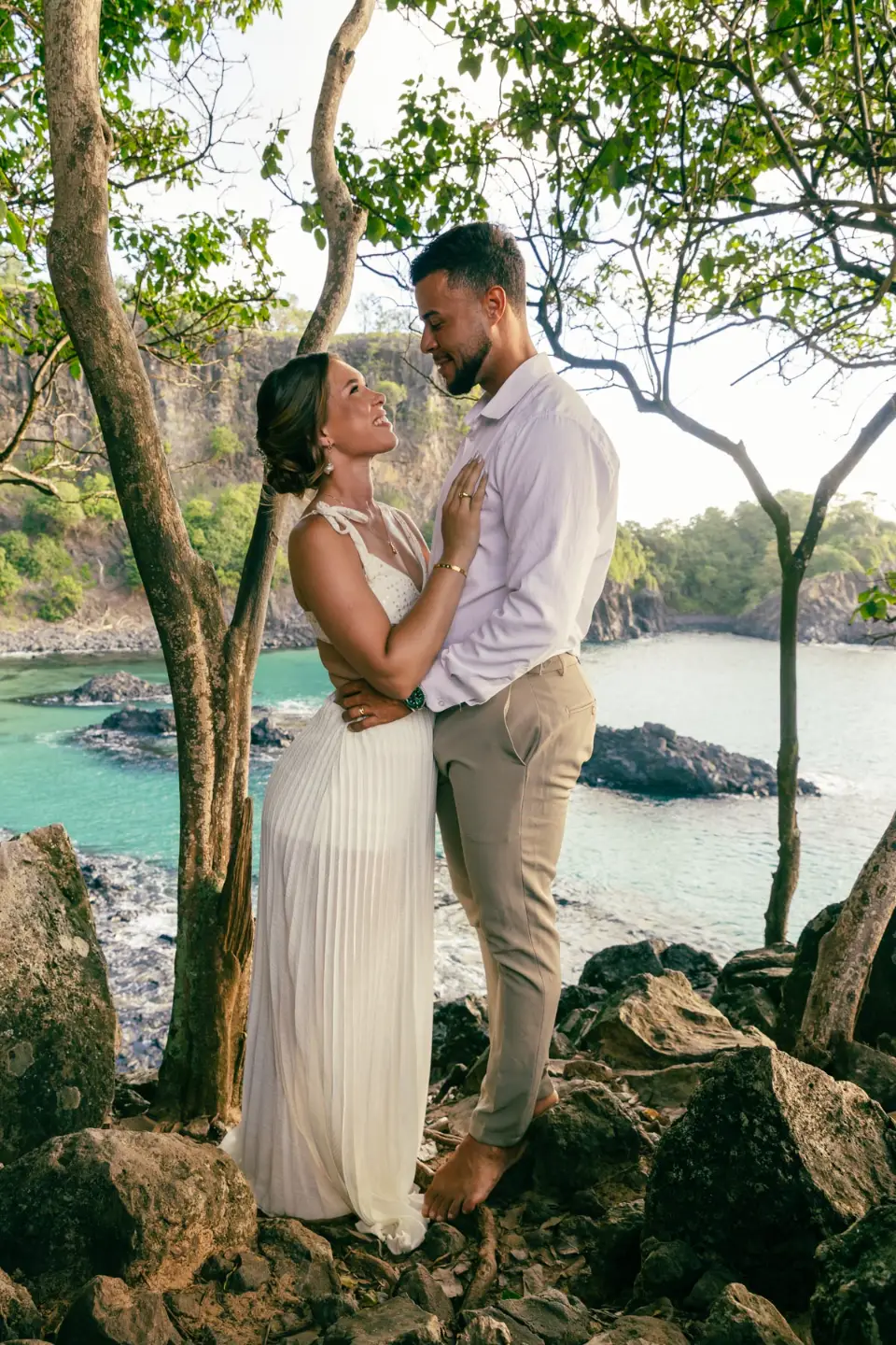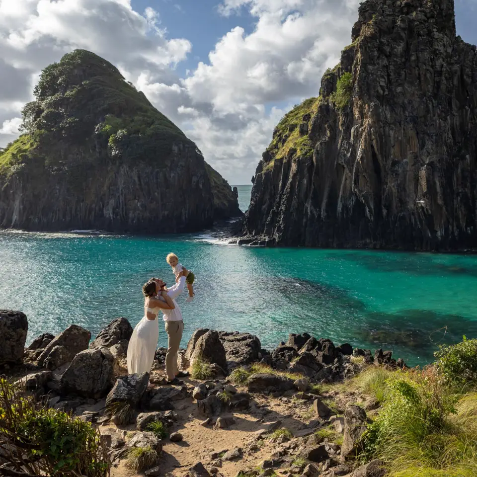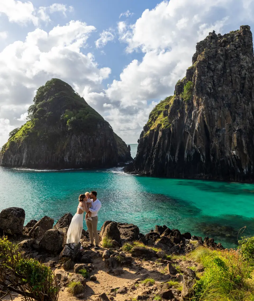 Logo após o “sim”, seguimos para o que chamamos de “escritório”: as paisagens deslumbrantes da ilha. Começamos pelo Mirante dos Dois Irmãos, que nos presenteou com aquela vista icônica que nunca cansa de surpreender. Ali, entre o azul do mar e a imensidão das rochas, a Adriele e o Silvio puderam relaxar e celebrar a nova fase.