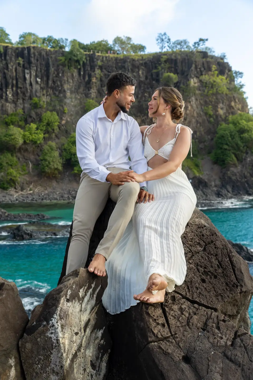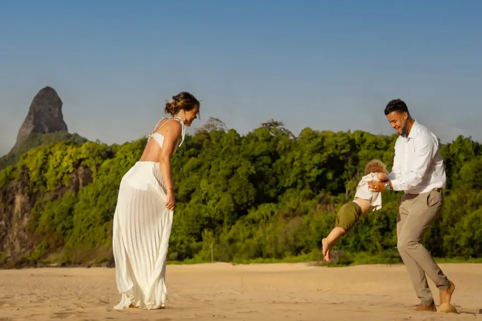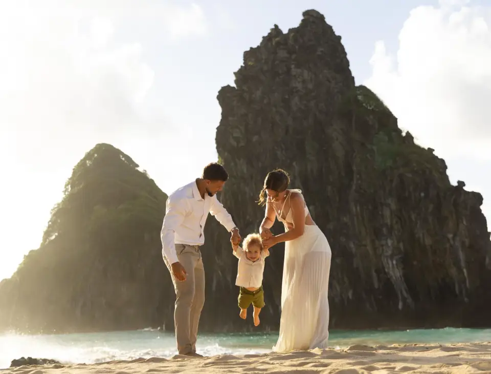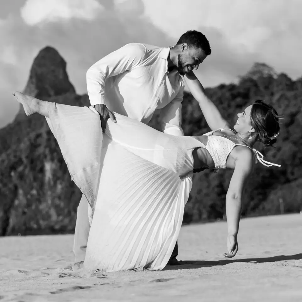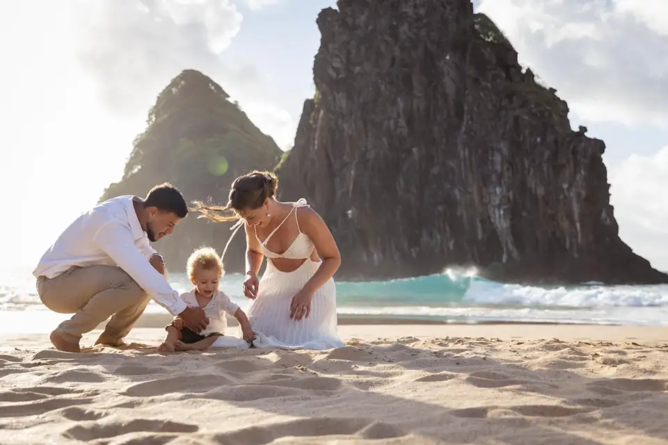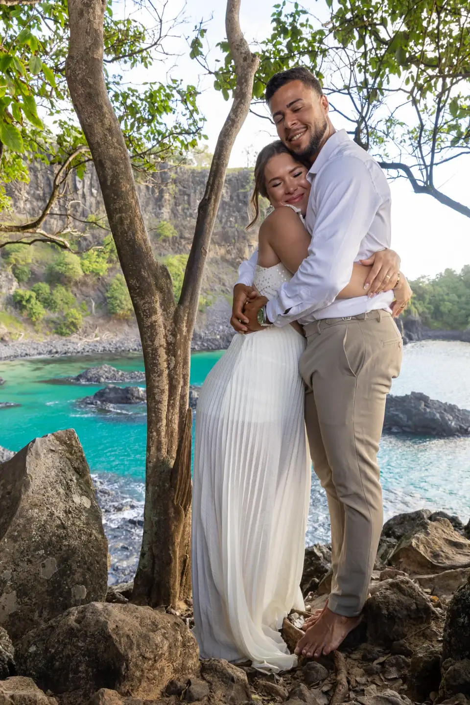 Logo após o “sim”, seguimos para o que chamamos de “escritório”: as paisagens deslumbrantes da ilha. Começamos pelo Mirante dos Dois Irmãos, que nos presenteou com aquela vista icônica que nunca cansa de surpreender. Ali, entre o azul do mar e a imensidão das rochas, a Adriele e o Silvio puderam relaxar e celebrar a nova fase.