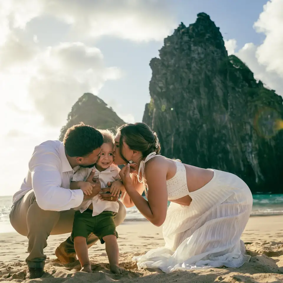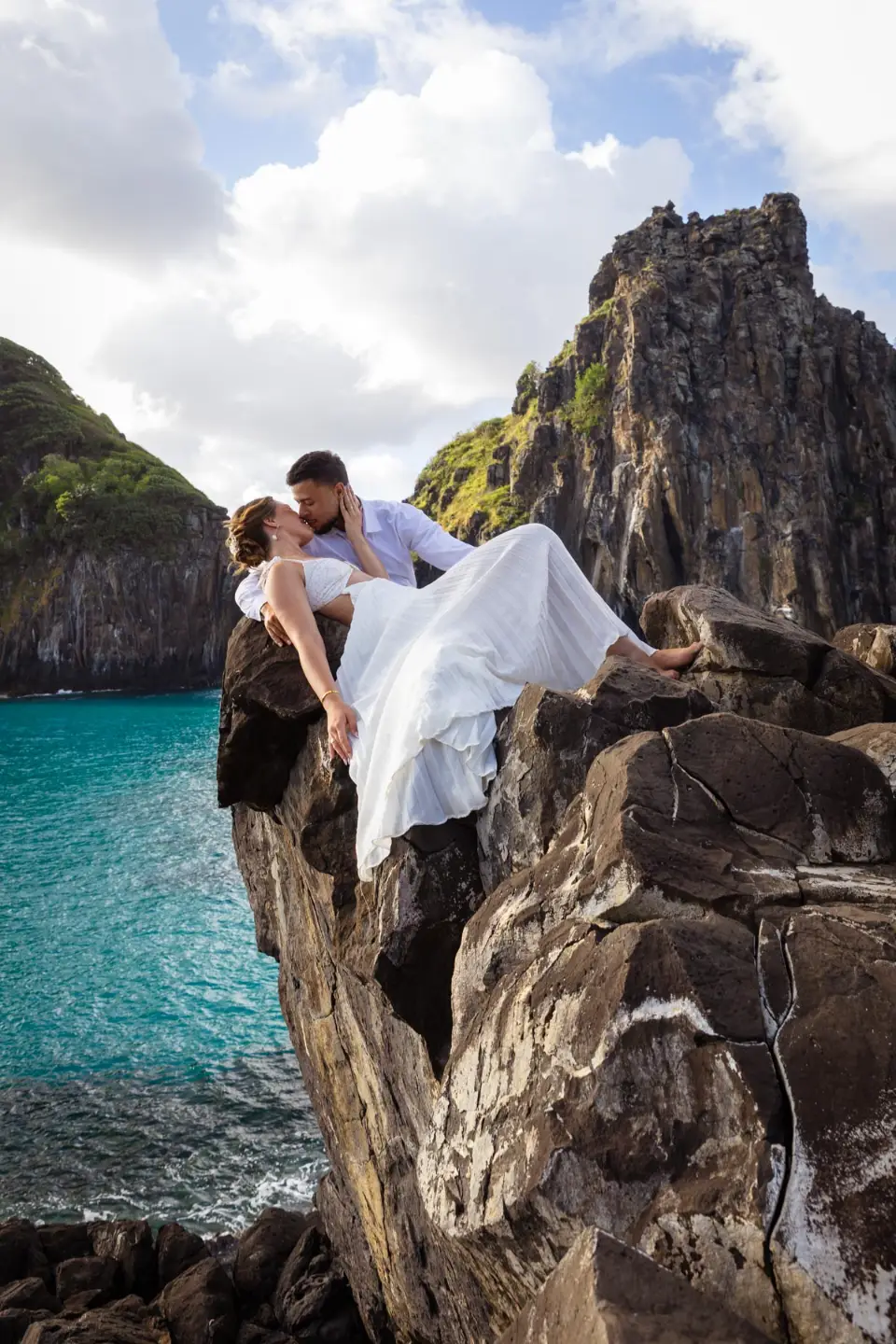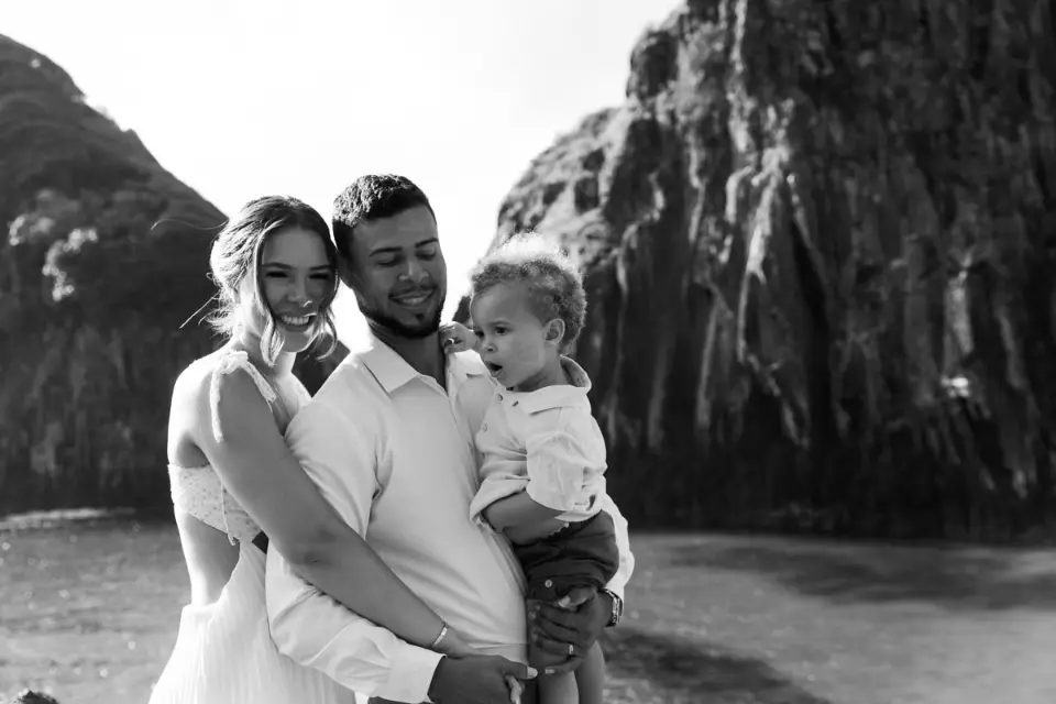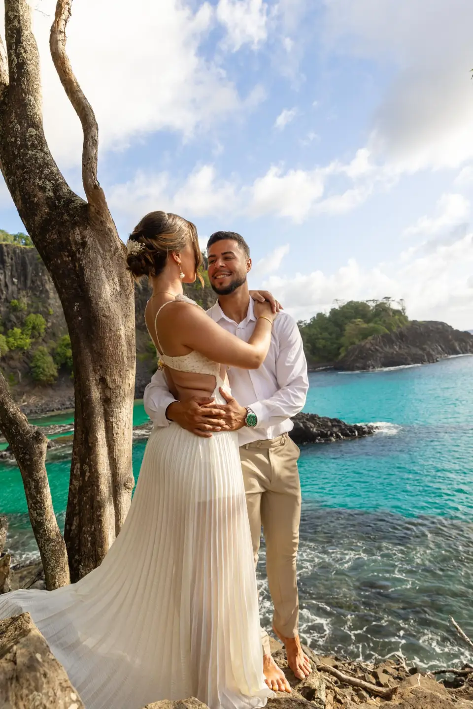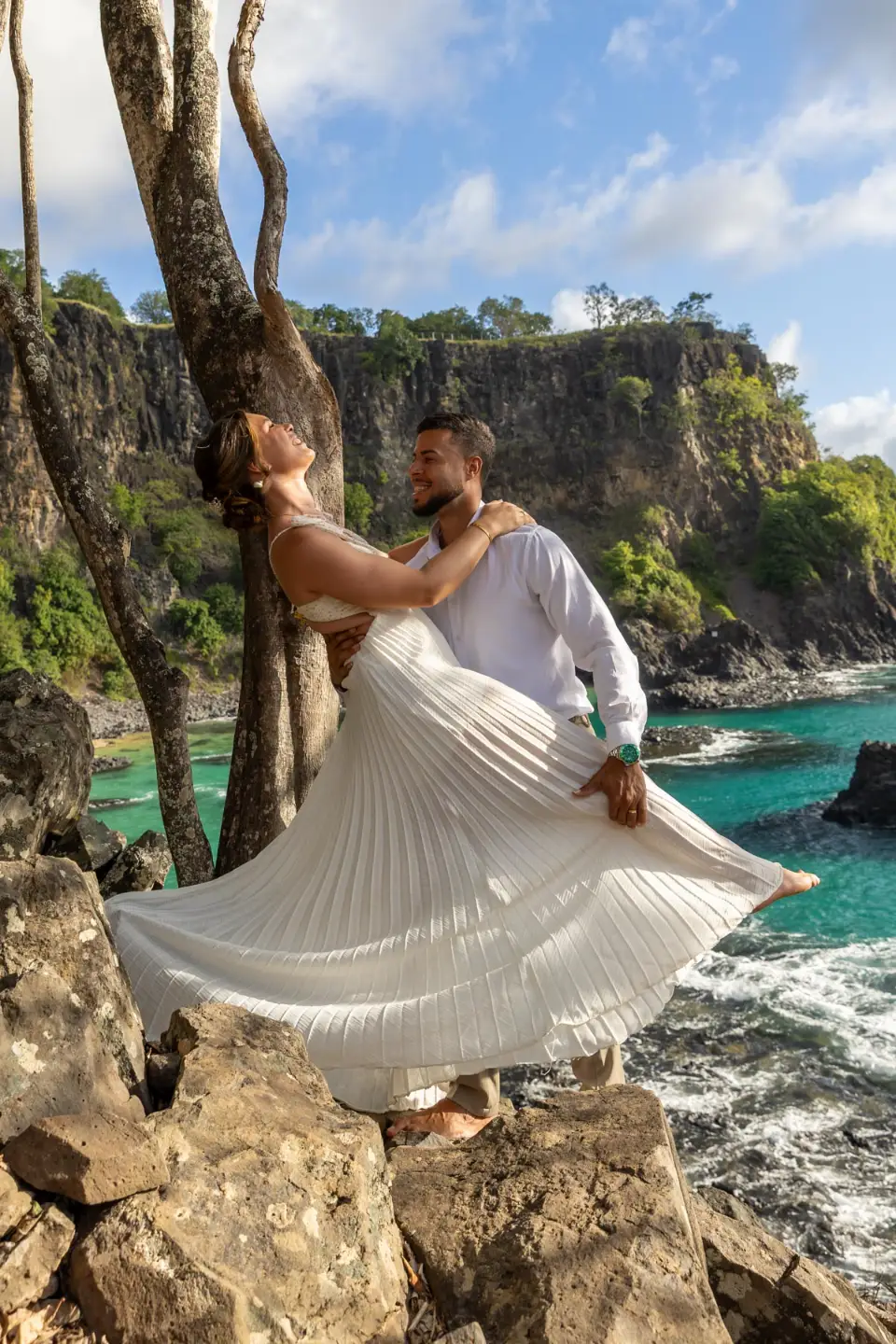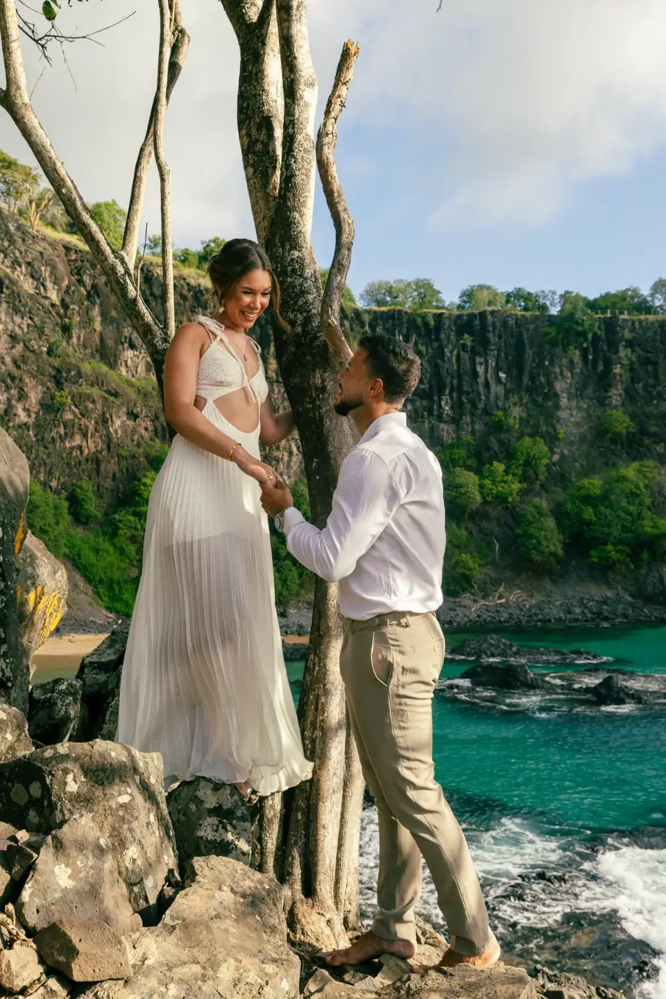 Logo após o “sim”, seguimos para o que chamamos de “escritório”: as paisagens deslumbrantes da ilha. Começamos pelo Mirante dos Dois Irmãos, que nos presenteou com aquela vista icônica que nunca cansa de surpreender. Ali, entre o azul do mar e a imensidão das rochas, a Adriele e o Silvio puderam relaxar e celebrar a nova fase.