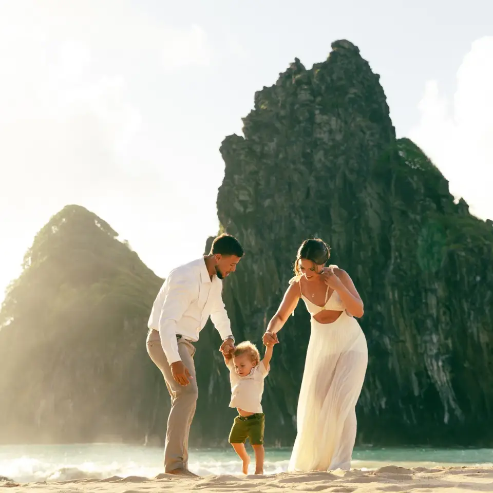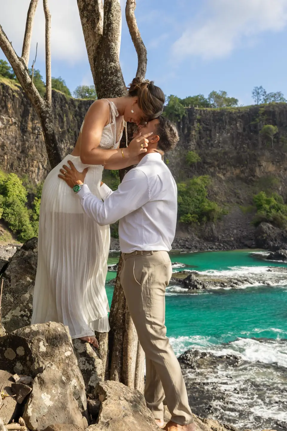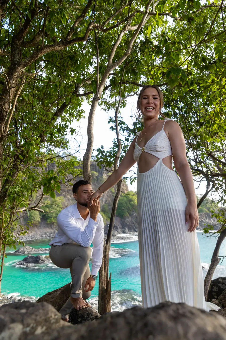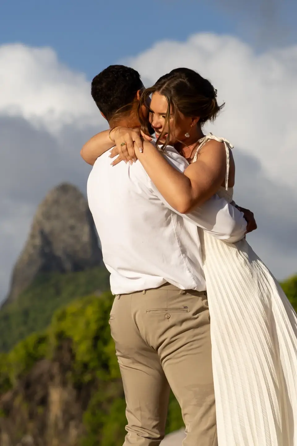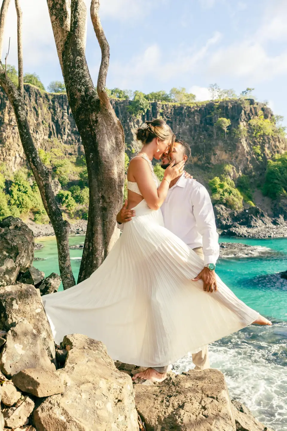 Logo após o “sim”, seguimos para o que chamamos de “escritório”: as paisagens deslumbrantes da ilha. Começamos pelo Mirante dos Dois Irmãos, que nos presenteou com aquela vista icônica que nunca cansa de surpreender. Ali, entre o azul do mar e a imensidão das rochas, a Adriele e o Silvio puderam relaxar e celebrar a nova fase.