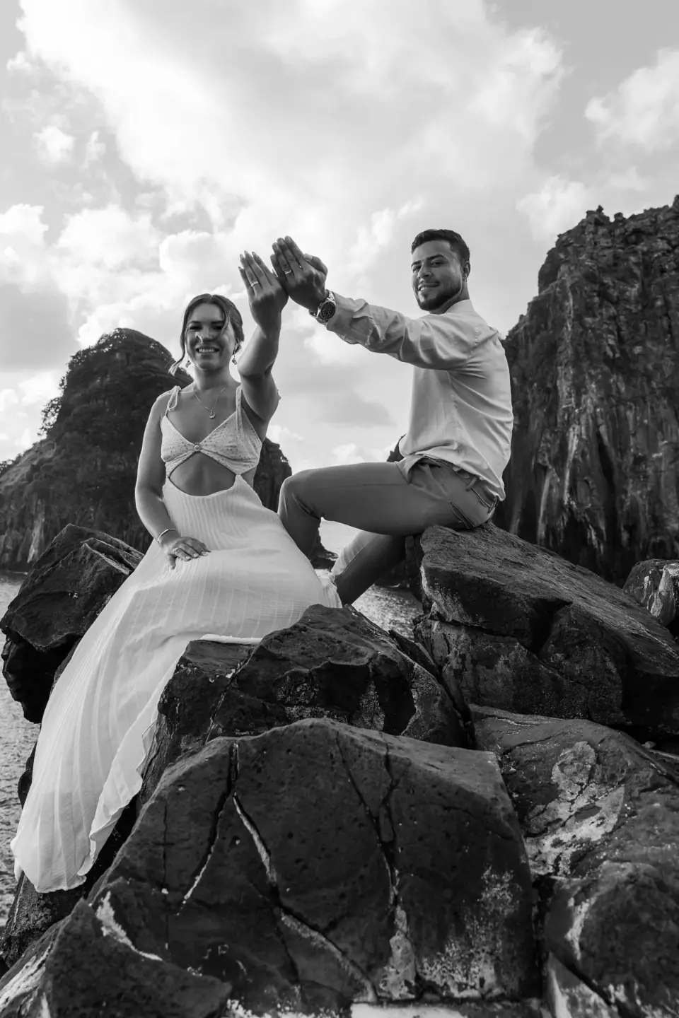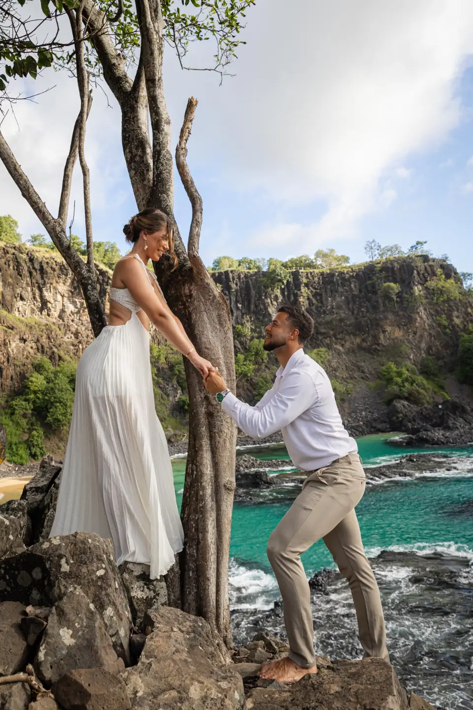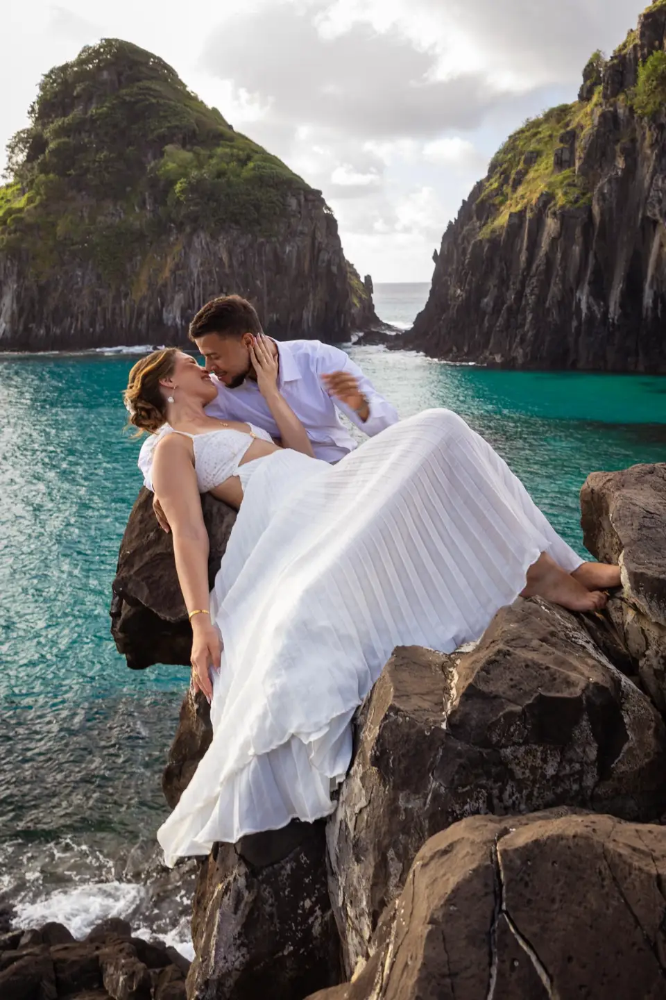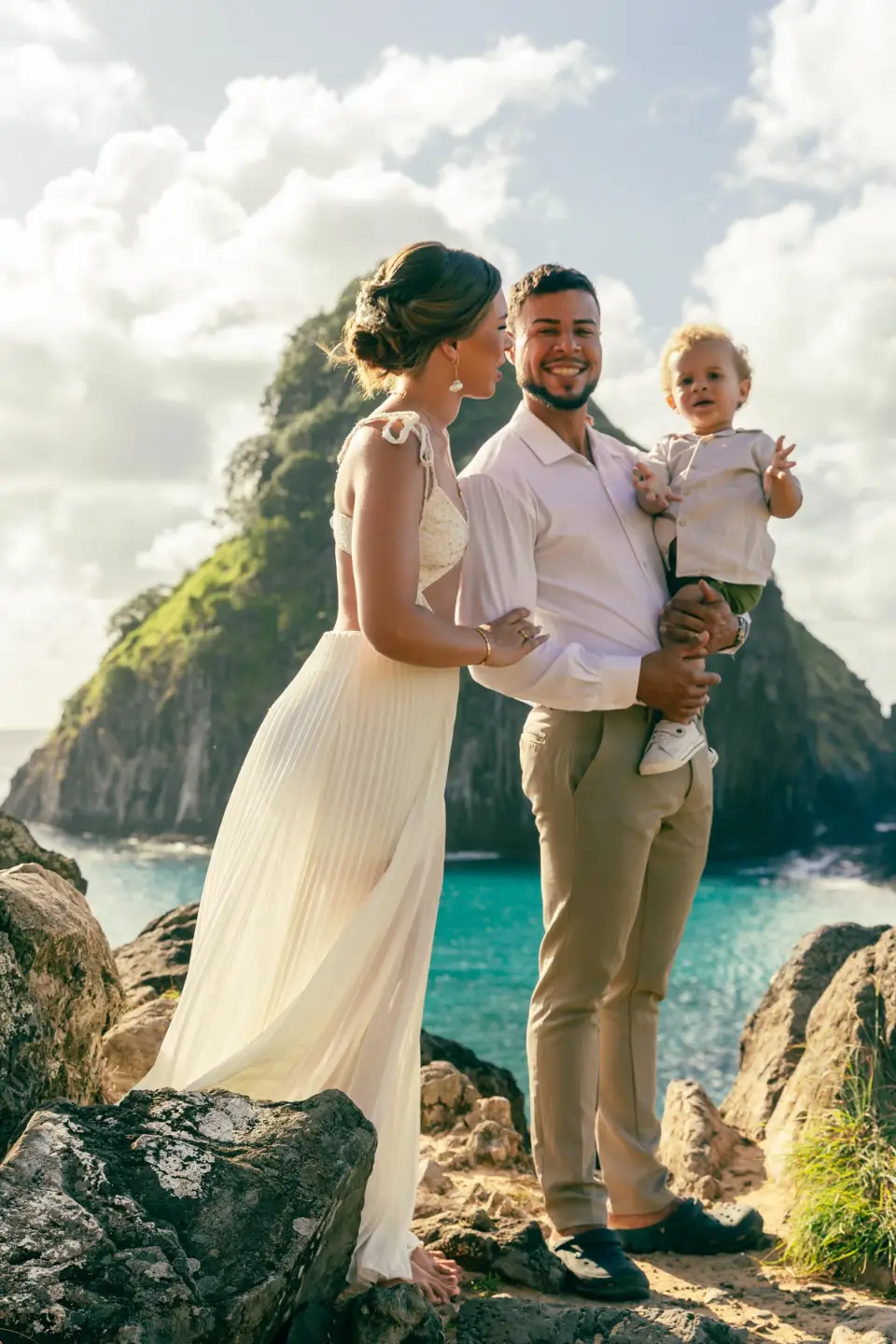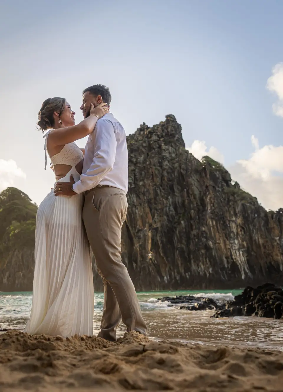 Logo após o “sim”, seguimos para o que chamamos de “escritório”: as paisagens deslumbrantes da ilha. Começamos pelo Mirante dos Dois Irmãos, que nos presenteou com aquela vista icônica que nunca cansa de surpreender. Ali, entre o azul do mar e a imensidão das rochas, a Adriele e o Silvio puderam relaxar e celebrar a nova fase.