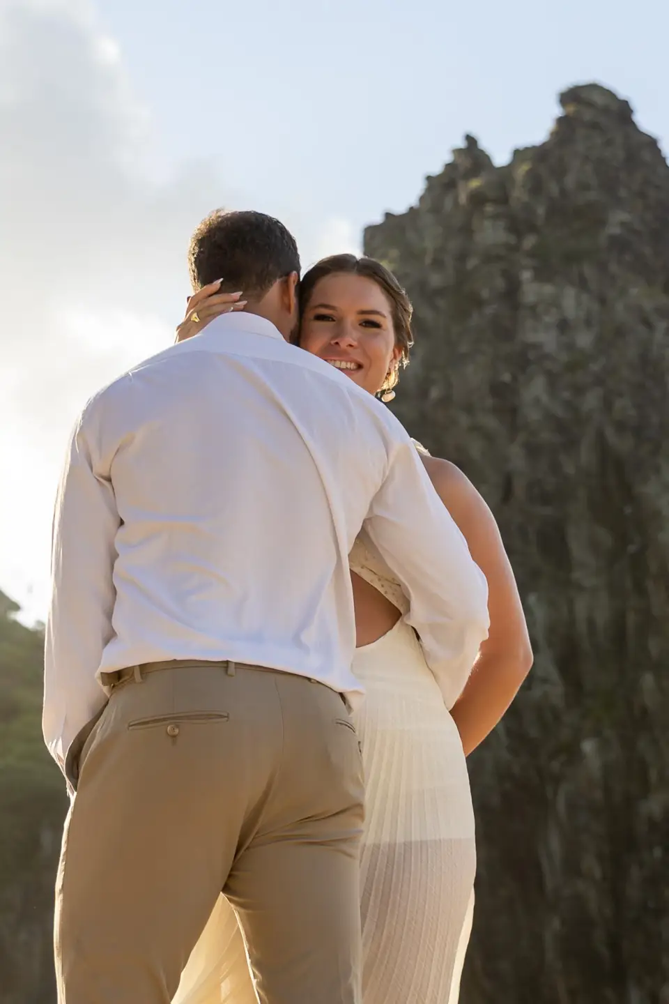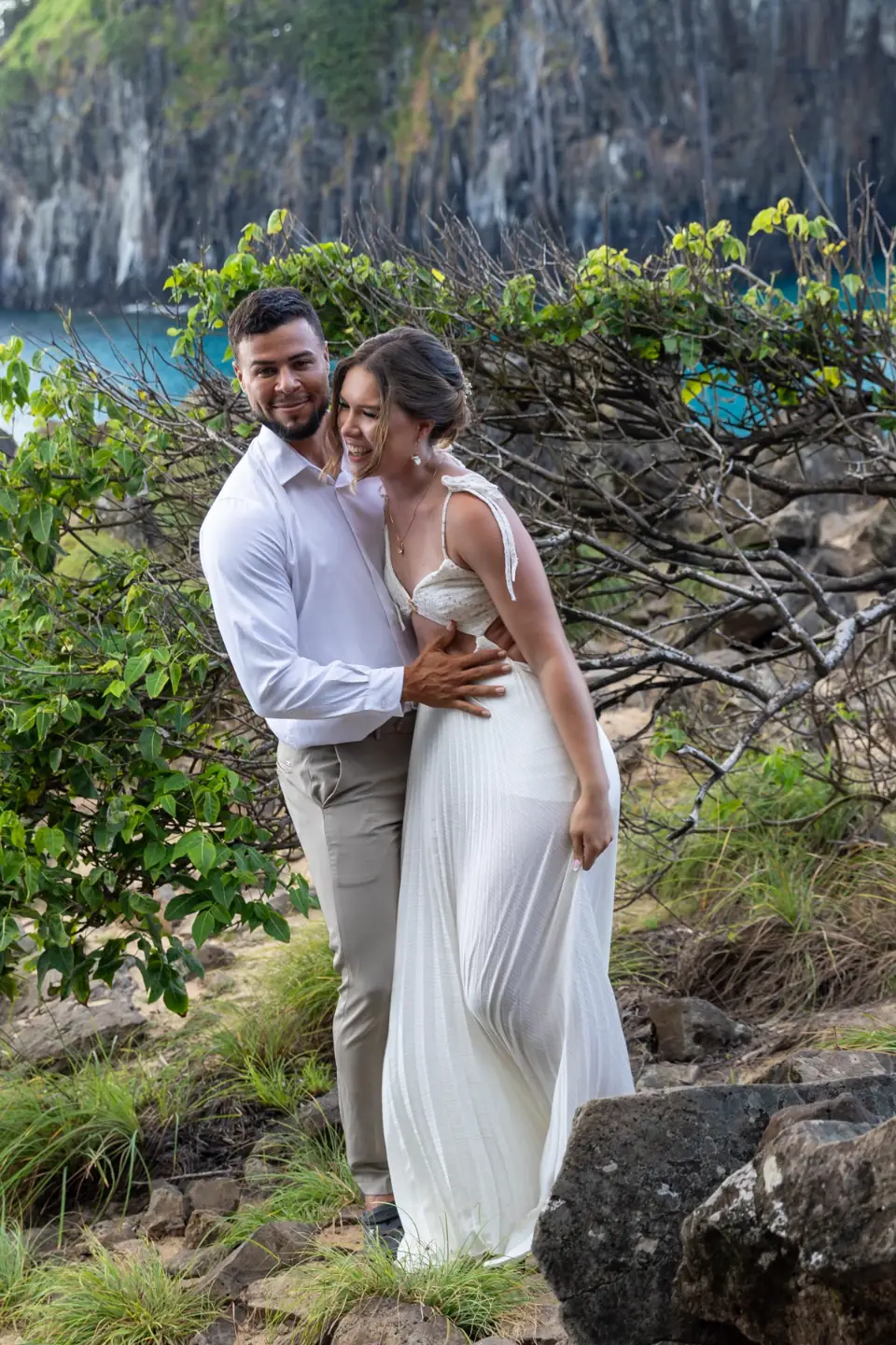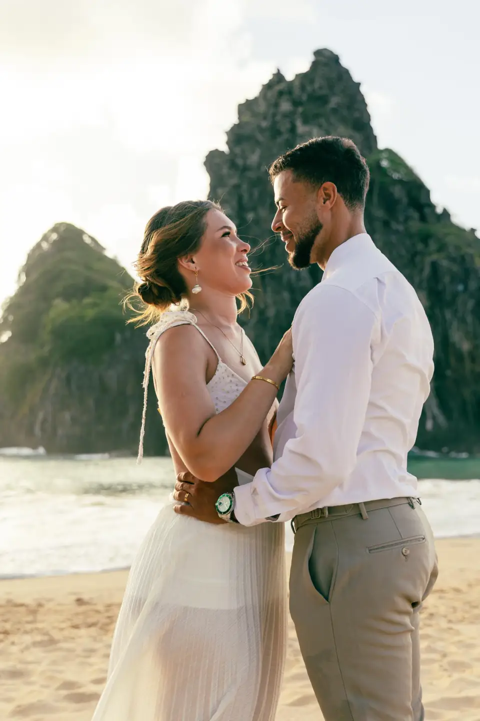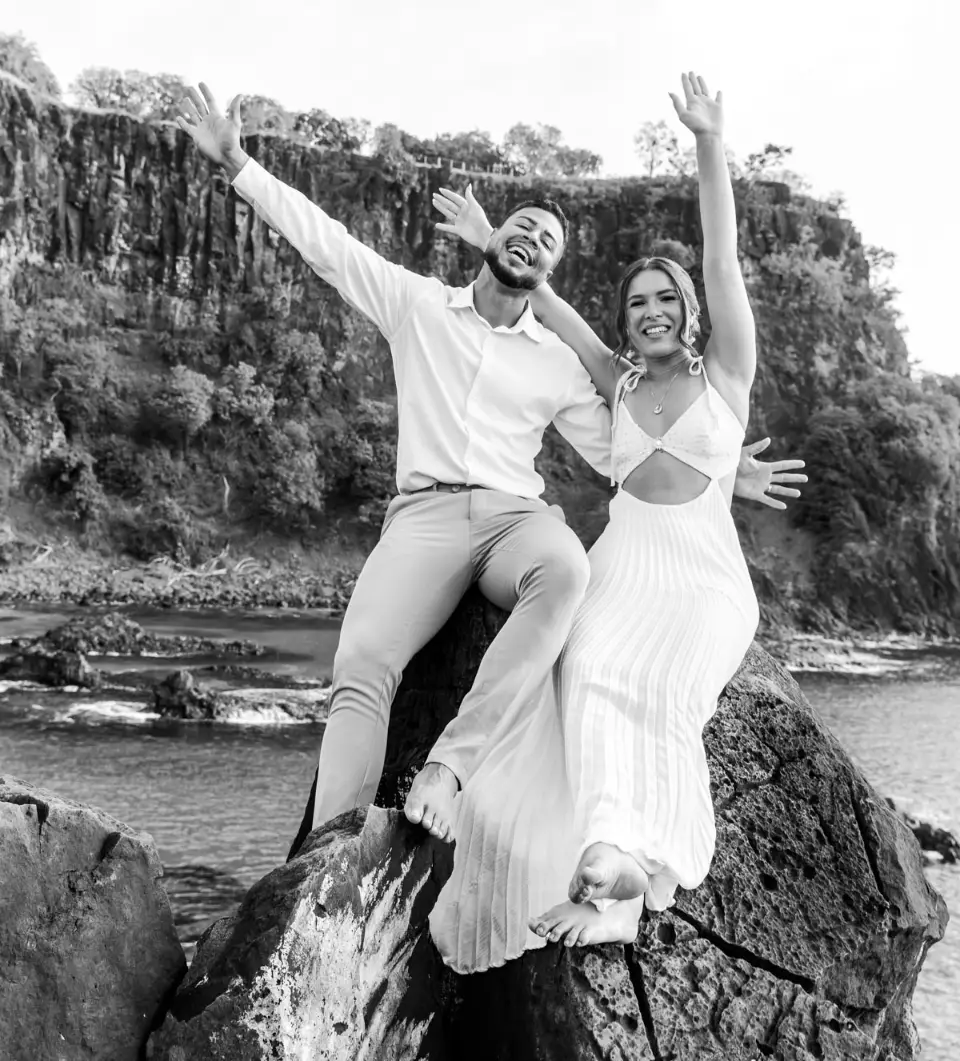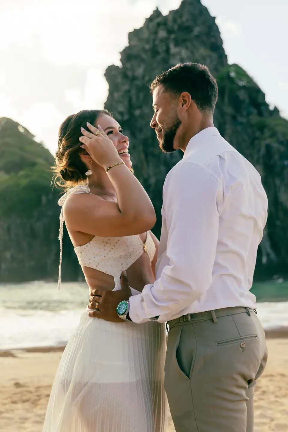 Logo após o “sim”, seguimos para o que chamamos de “escritório”: as paisagens deslumbrantes da ilha. Começamos pelo Mirante dos Dois Irmãos, que nos presenteou com aquela vista icônica que nunca cansa de surpreender. Ali, entre o azul do mar e a imensidão das rochas, a Adriele e o Silvio puderam relaxar e celebrar a nova fase.