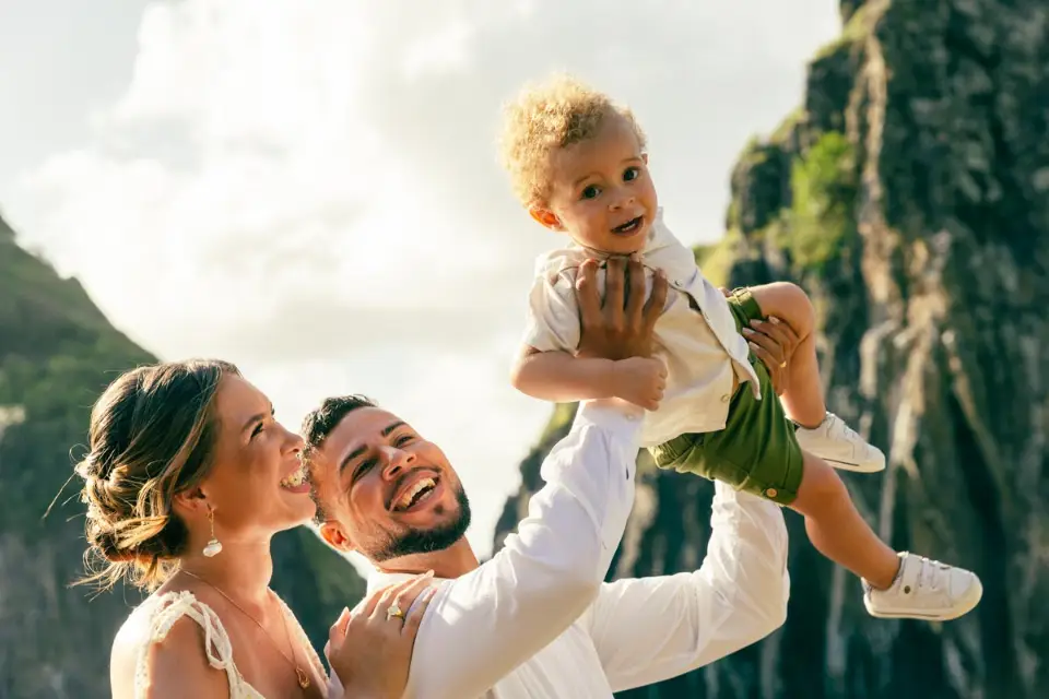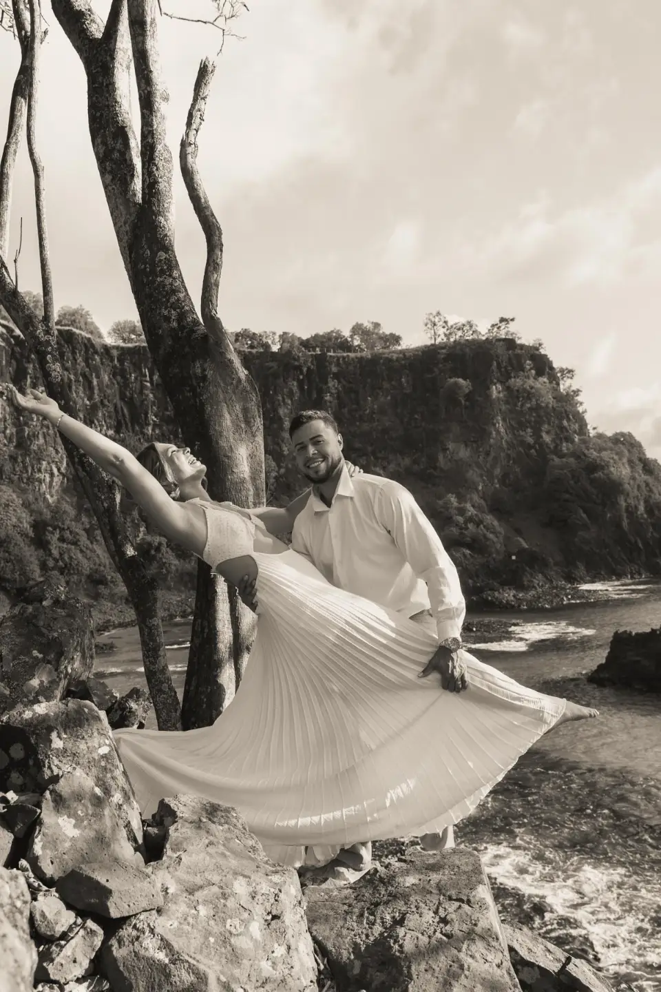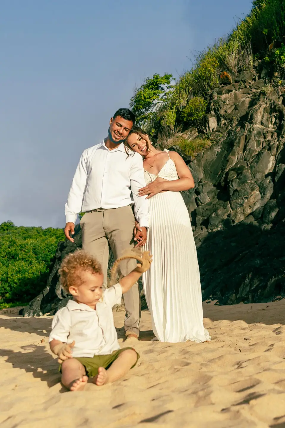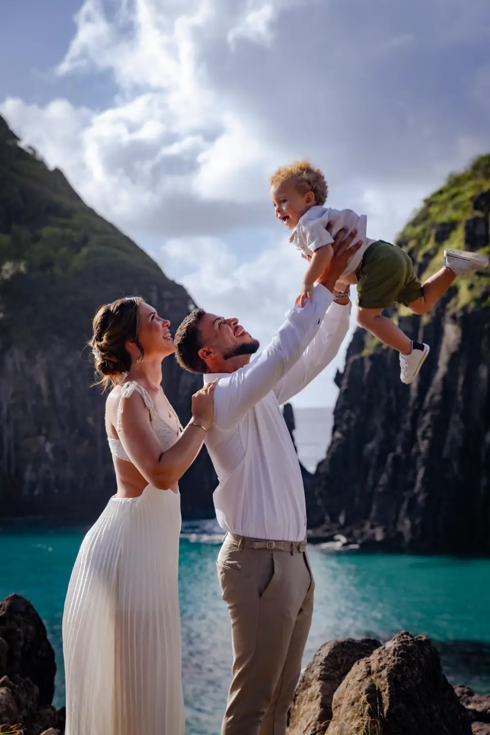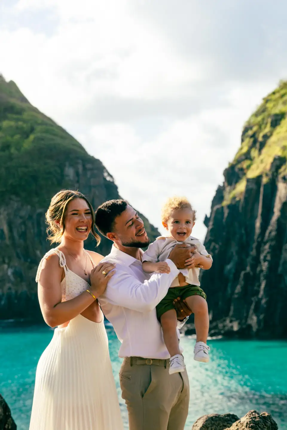 Logo após o “sim”, seguimos para o que chamamos de “escritório”: as paisagens deslumbrantes da ilha. Começamos pelo Mirante dos Dois Irmãos, que nos presenteou com aquela vista icônica que nunca cansa de surpreender. Ali, entre o azul do mar e a imensidão das rochas, a Adriele e o Silvio puderam relaxar e celebrar a nova fase.