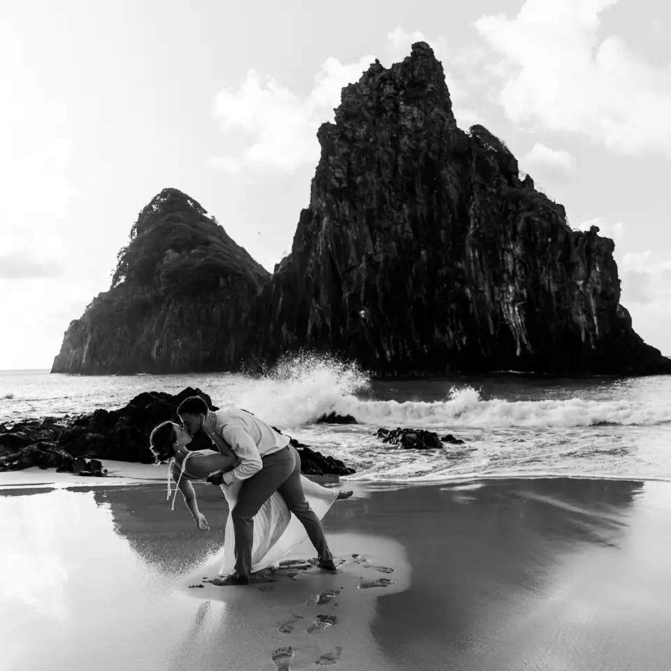 Finalizamos o ensaio na Praia da Cacimba do Padre. A luz estava perfeita, emoldurando a conexão absoluta entre os dois. Por serem figuras tão presentes na rotina da ilha, ver o casal em um momento de entrega e romance, cercado pela natureza selvagem da Cacimba, trouxe uma verdade única para as fotos.