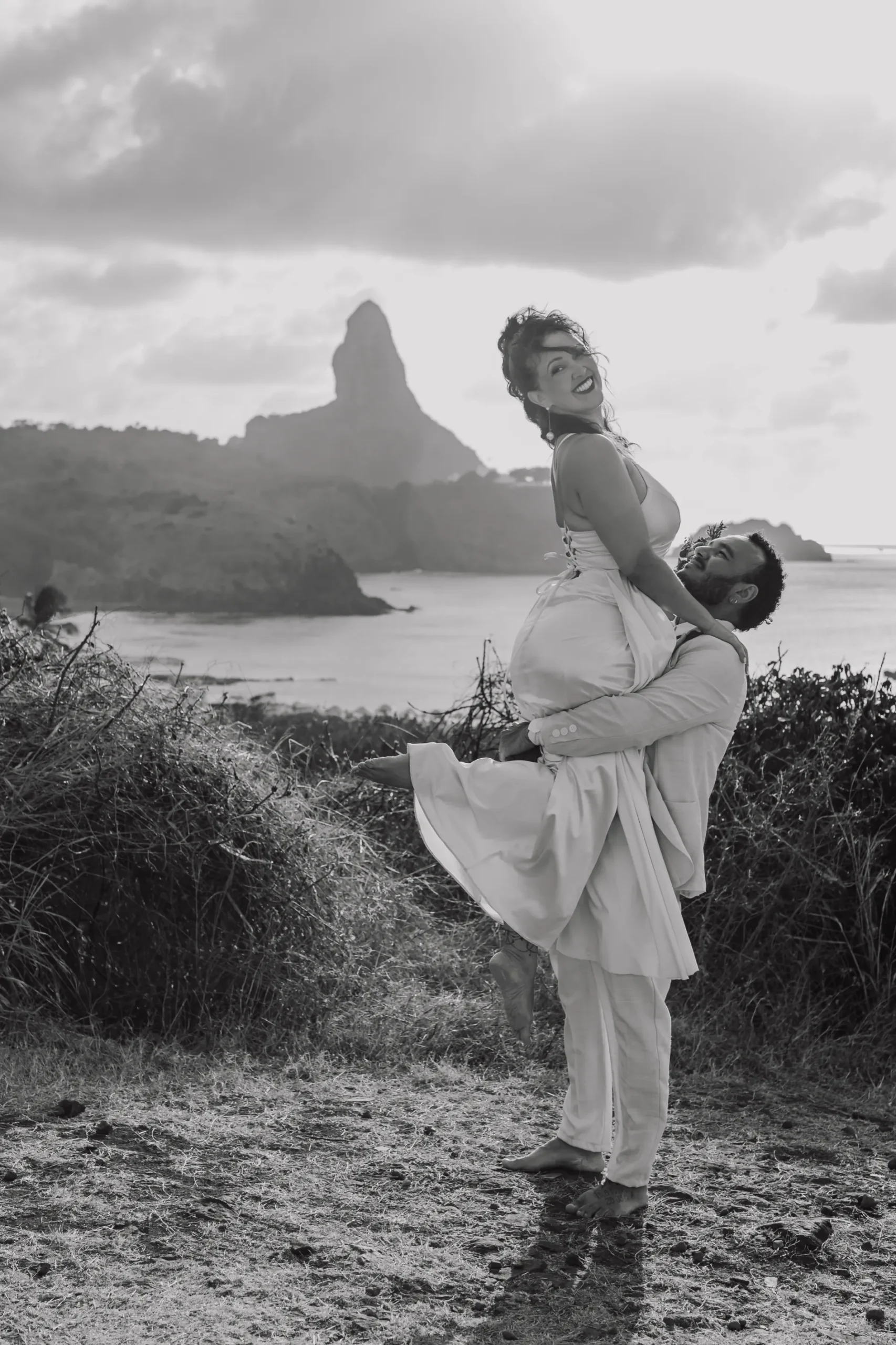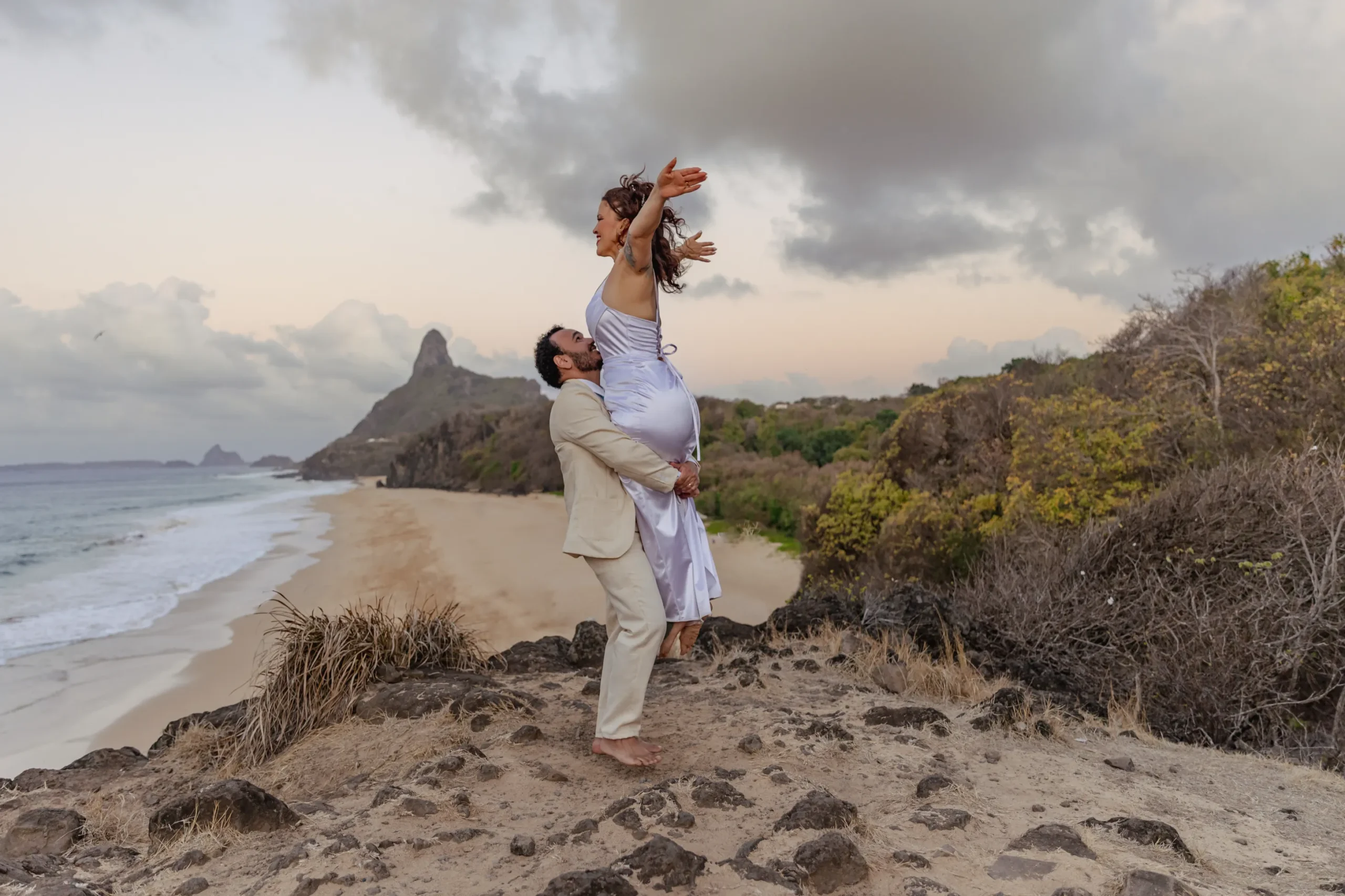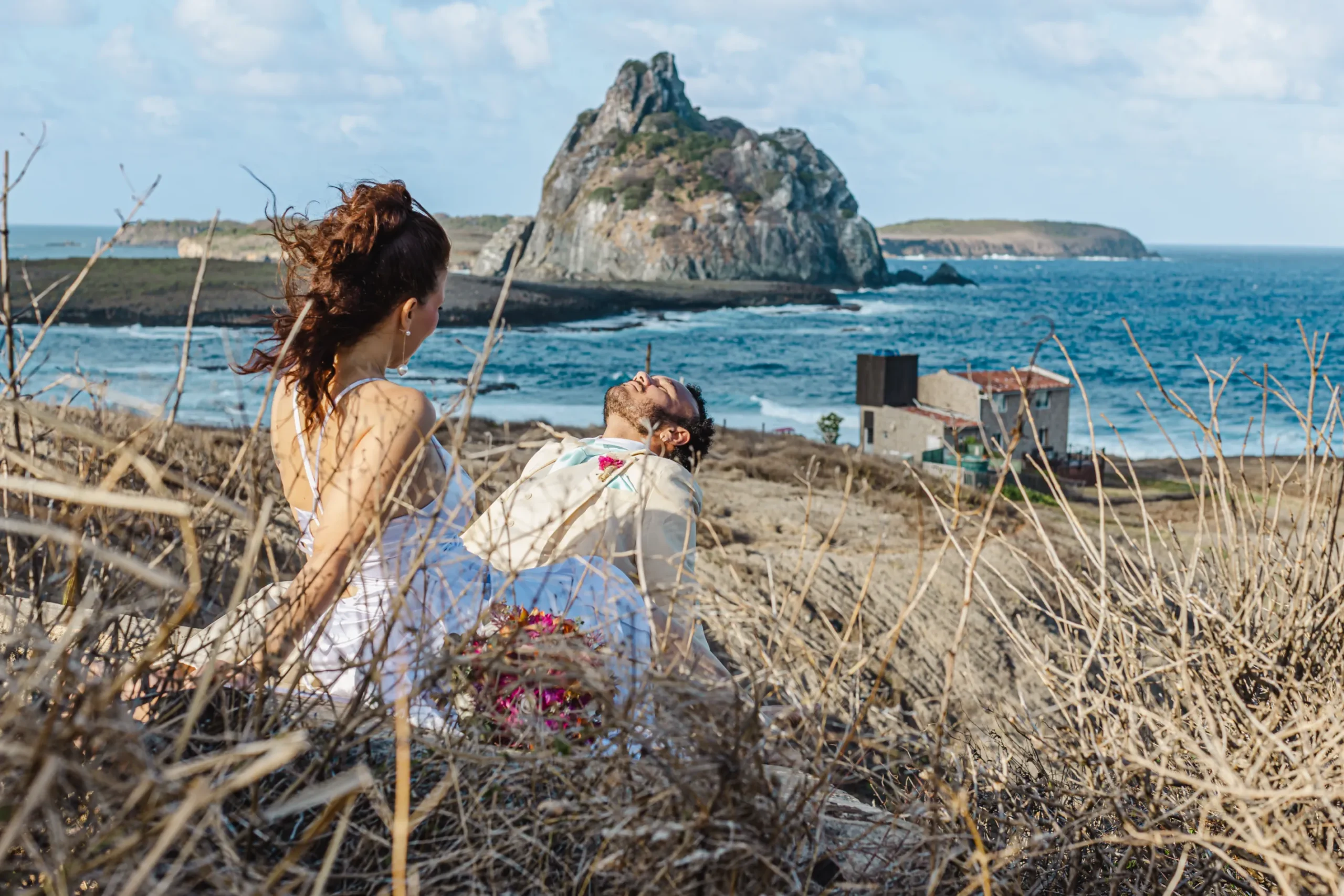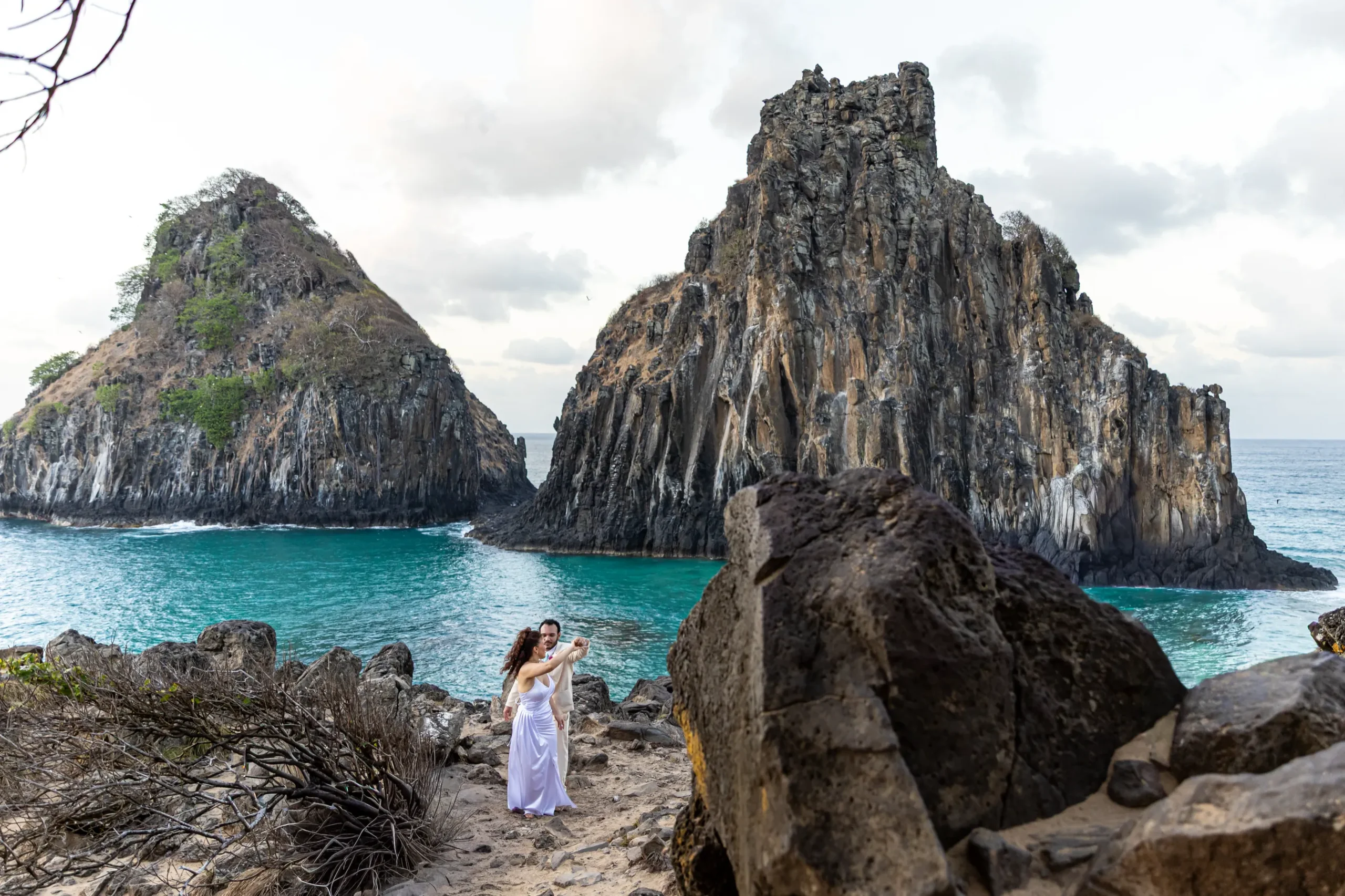 Mirante dos Dois Irmãos e Cacimba do Padre: Finalizamos onde a imponência de Noronha se revela. O olhar da Vane para o Gê diante dos Dois Irmãos não era apenas o de uma recém-casada, mas de alguém que encontrou o porto seguro exatamente onde a nossa jornada de vida mudou.