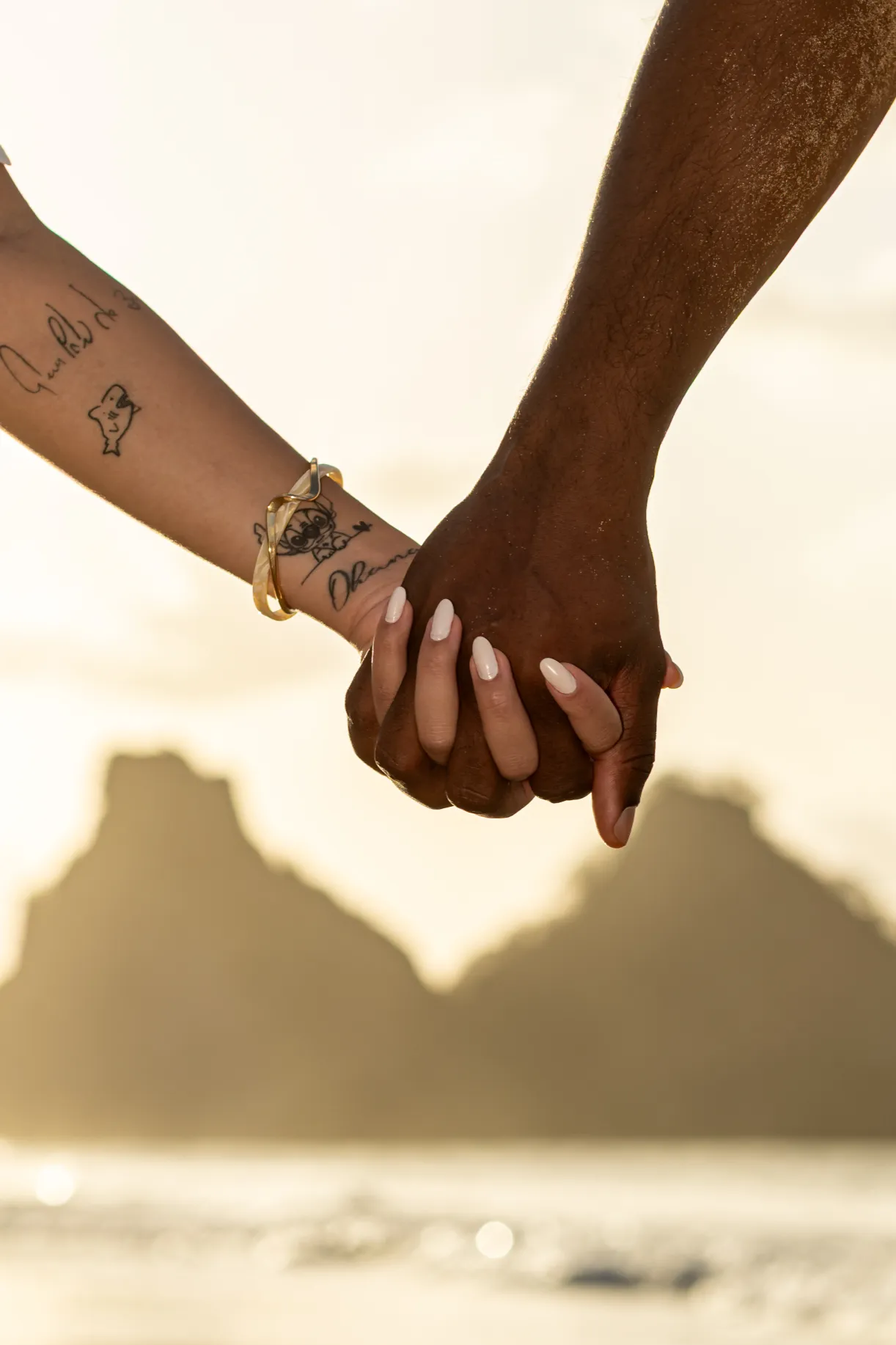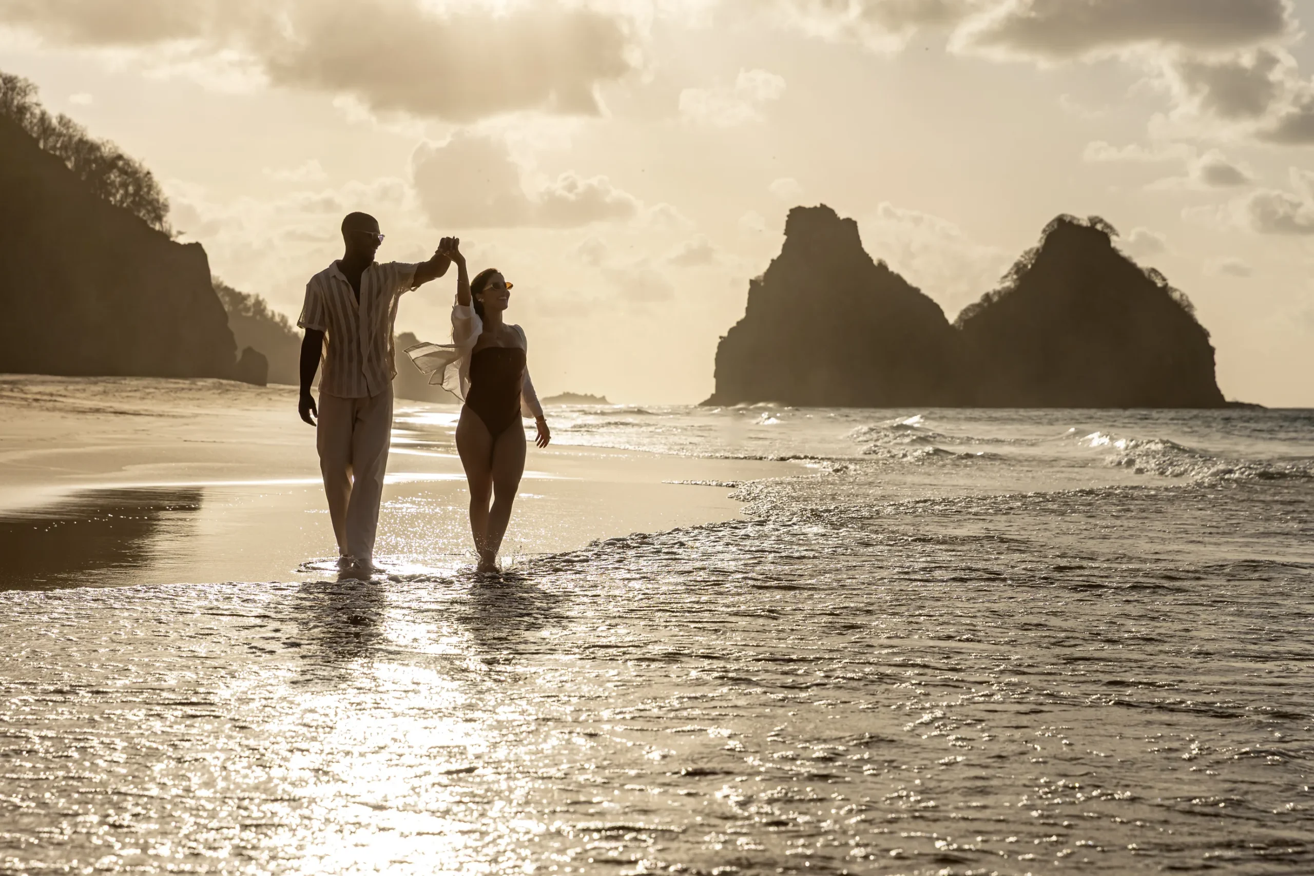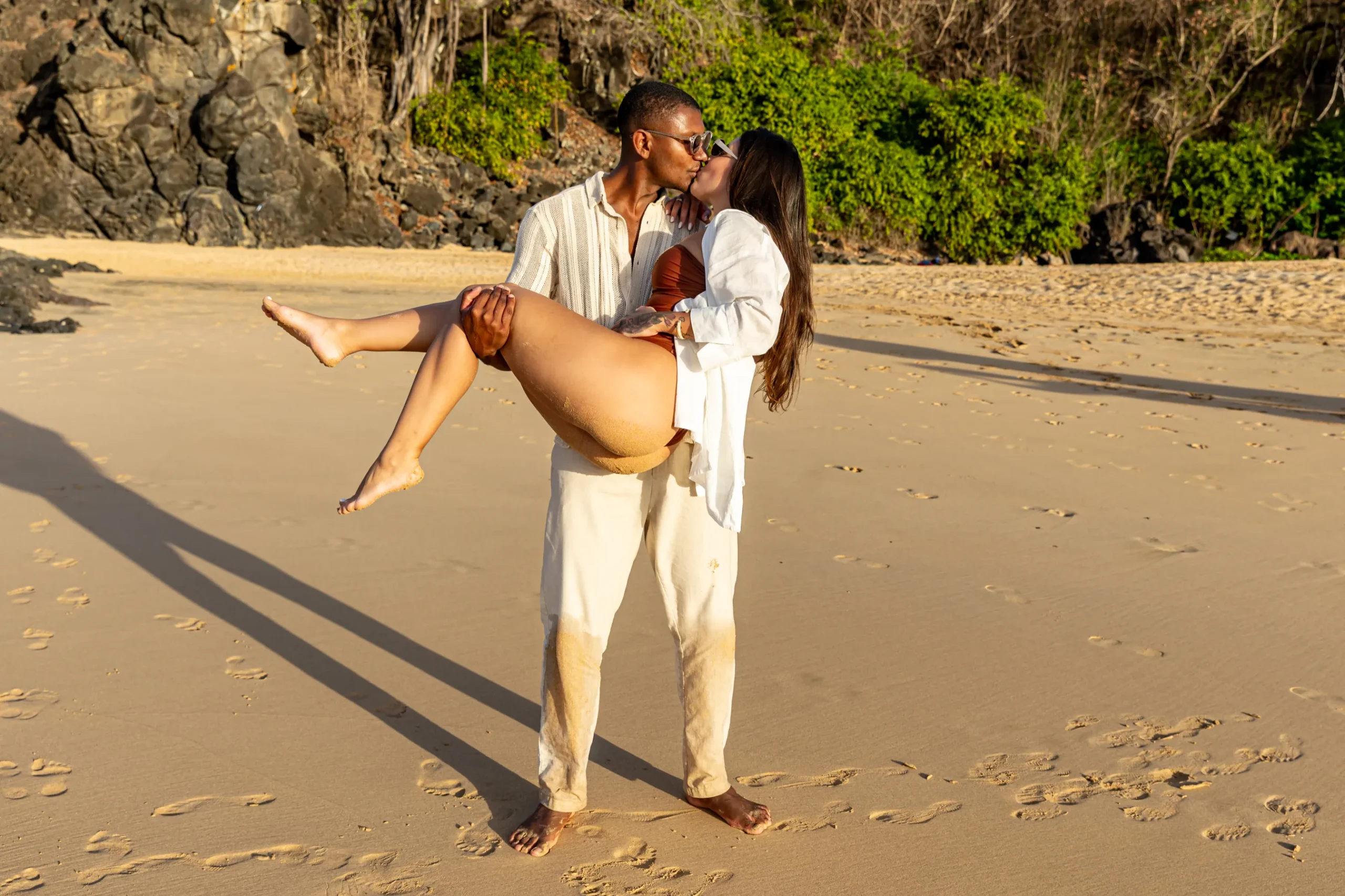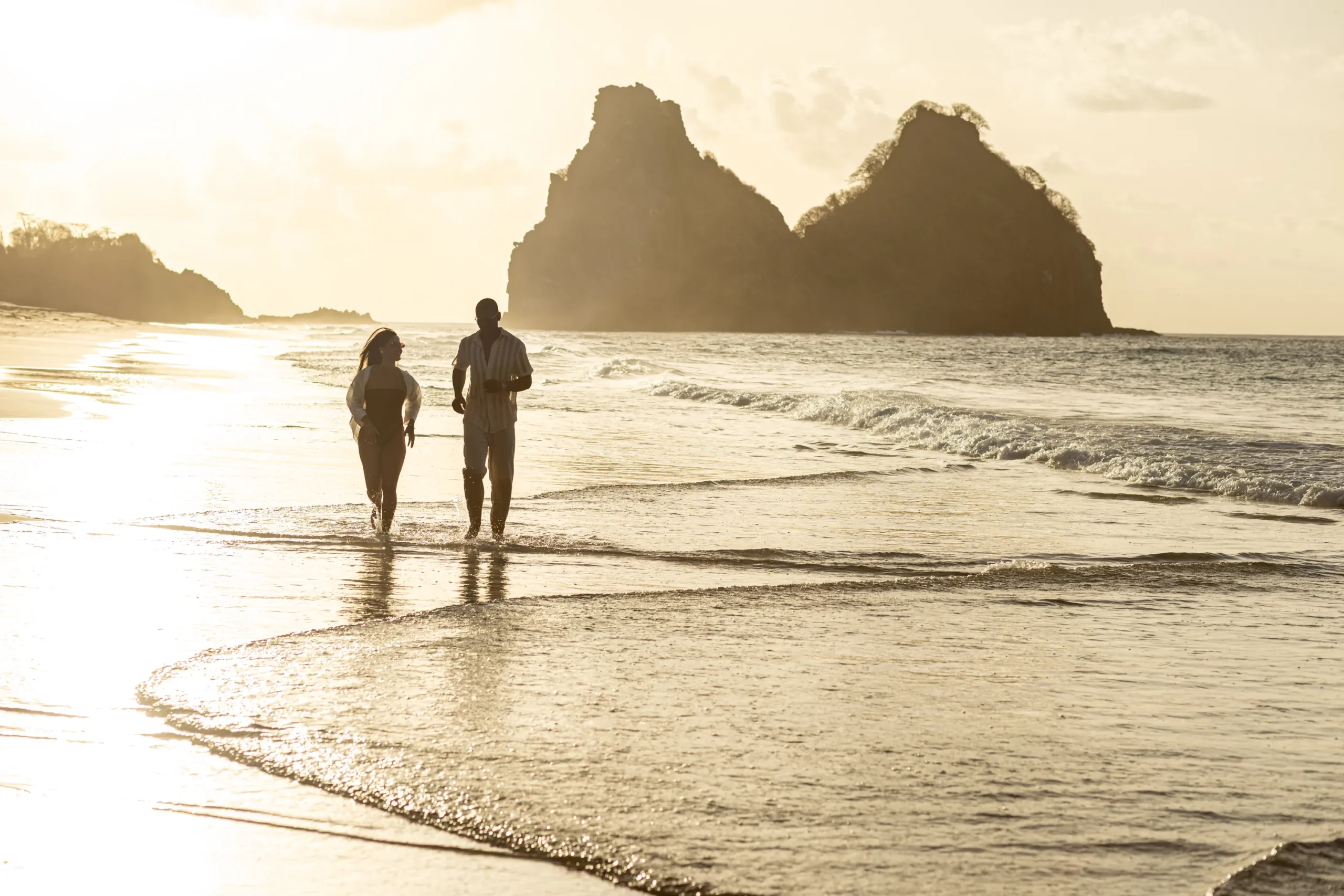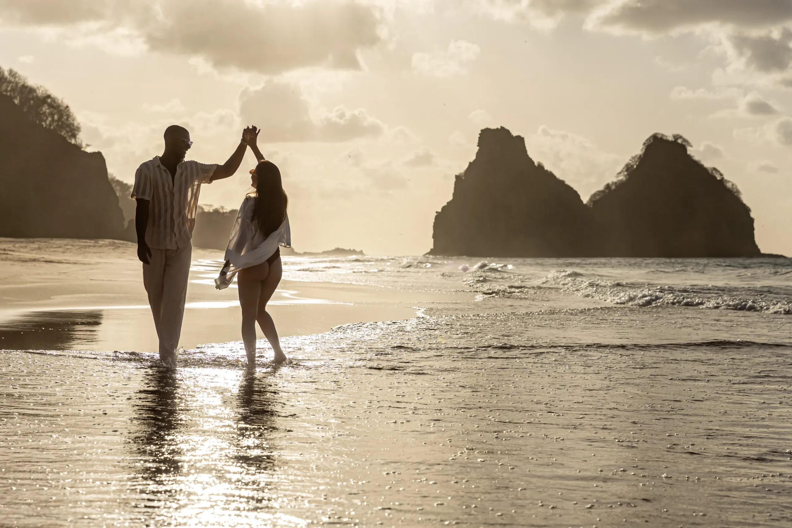Conforme o sol começava a baixar, descemos para a Praia do Bode. A luz do “golden hour” em Noronha é única; ela doura a pele e traz uma aura quase angelical para as fotos de gestante.