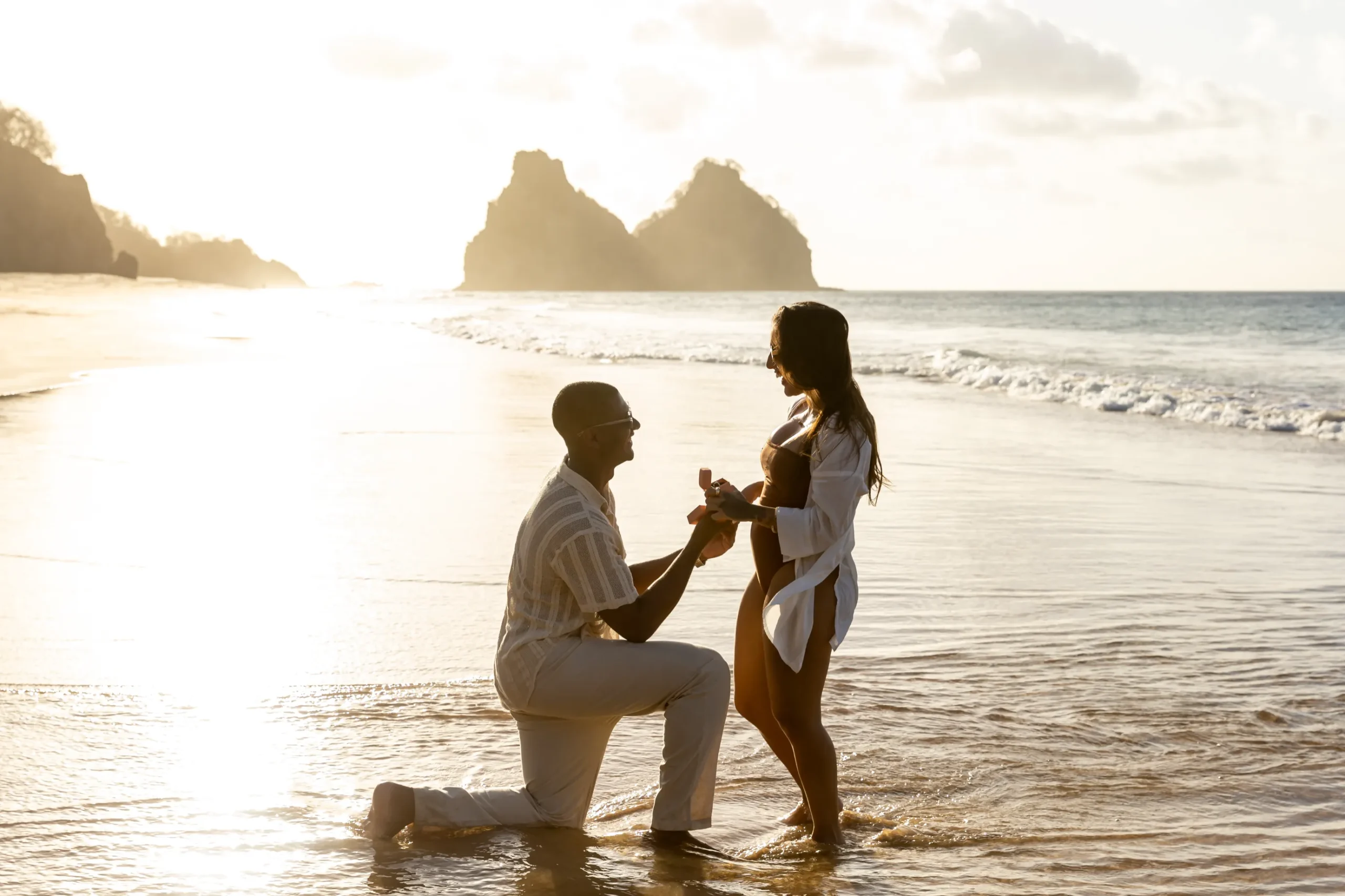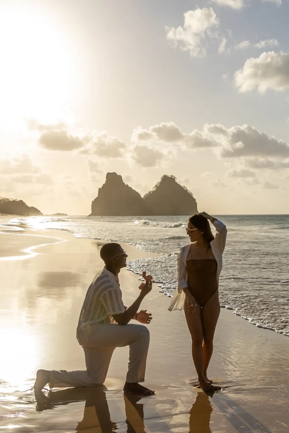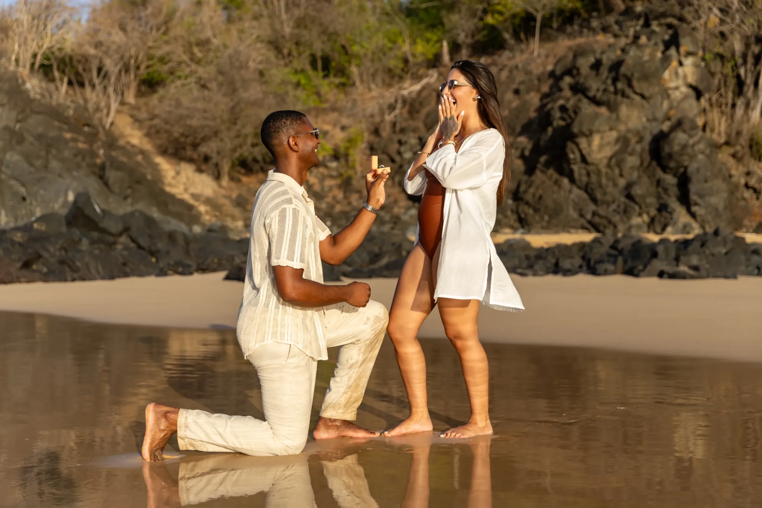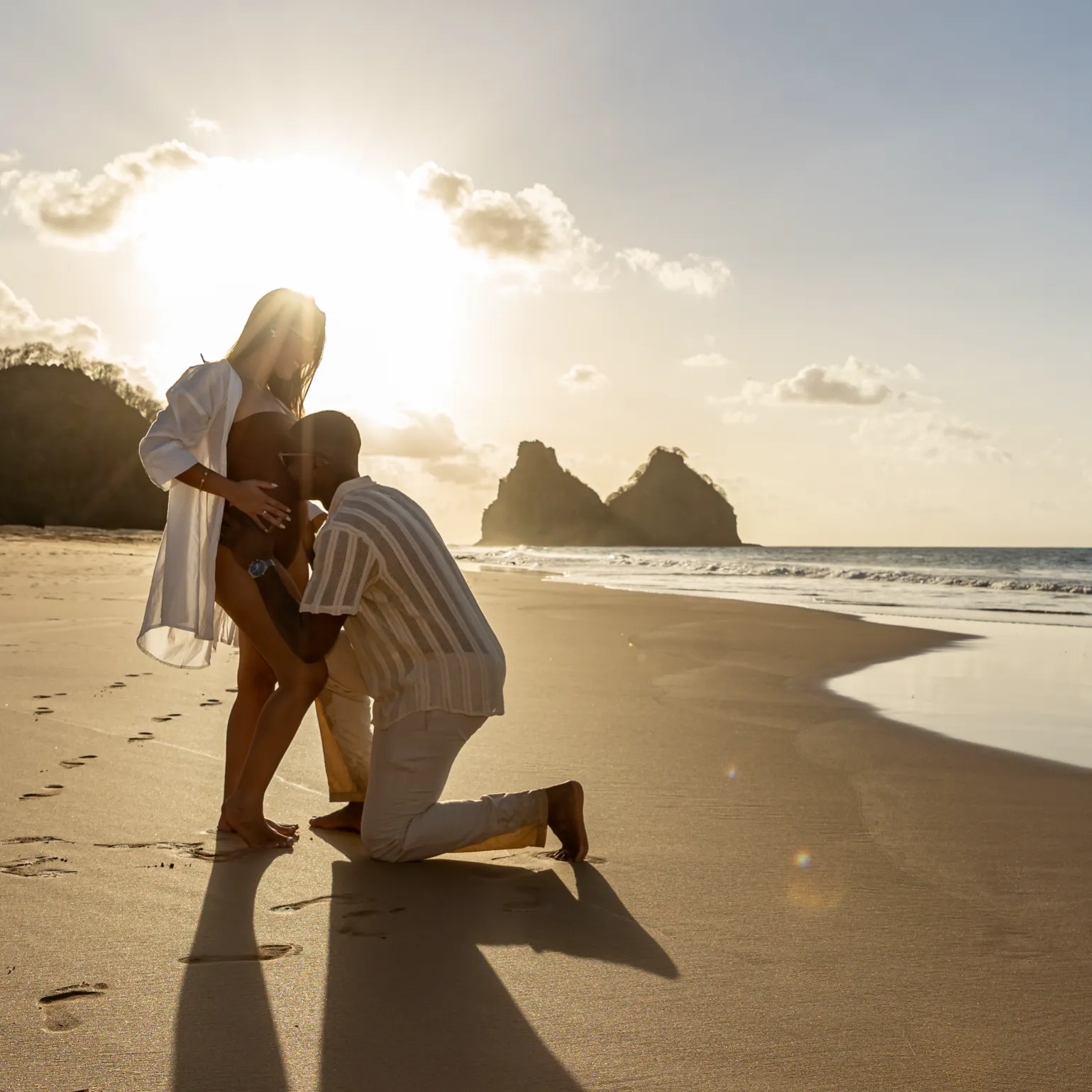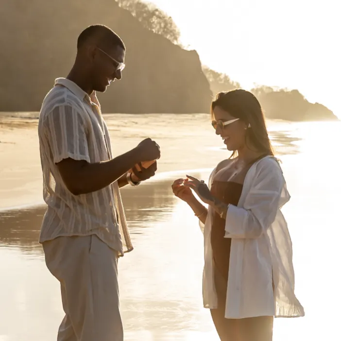 Estávamos focados em capturar a espera pelo bebê, mas o Zé tinha um plano maior. Enquanto as ondas quebravam suavemente e o céu ganhava tons de rosa e laranja, ele se ajoelhou.