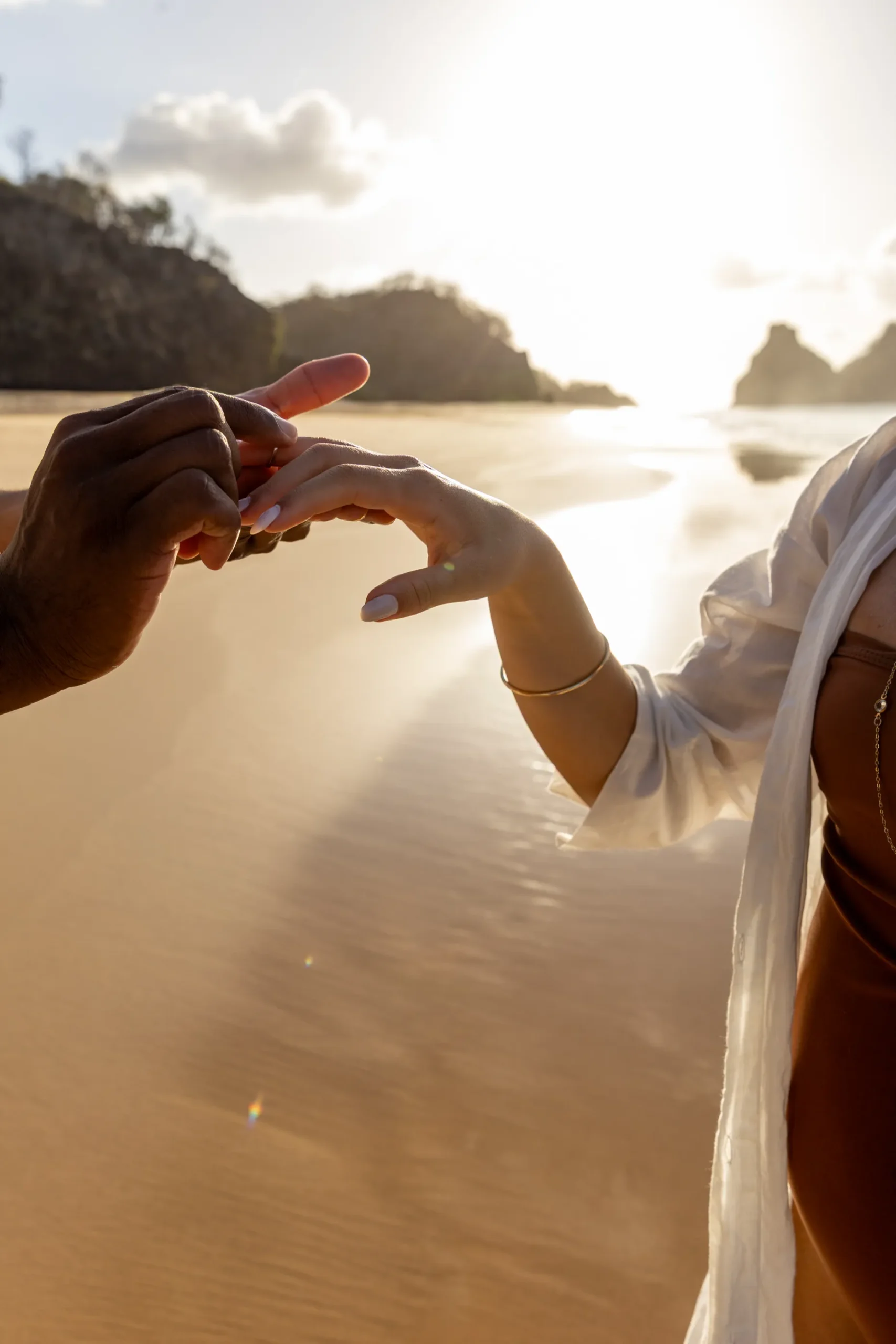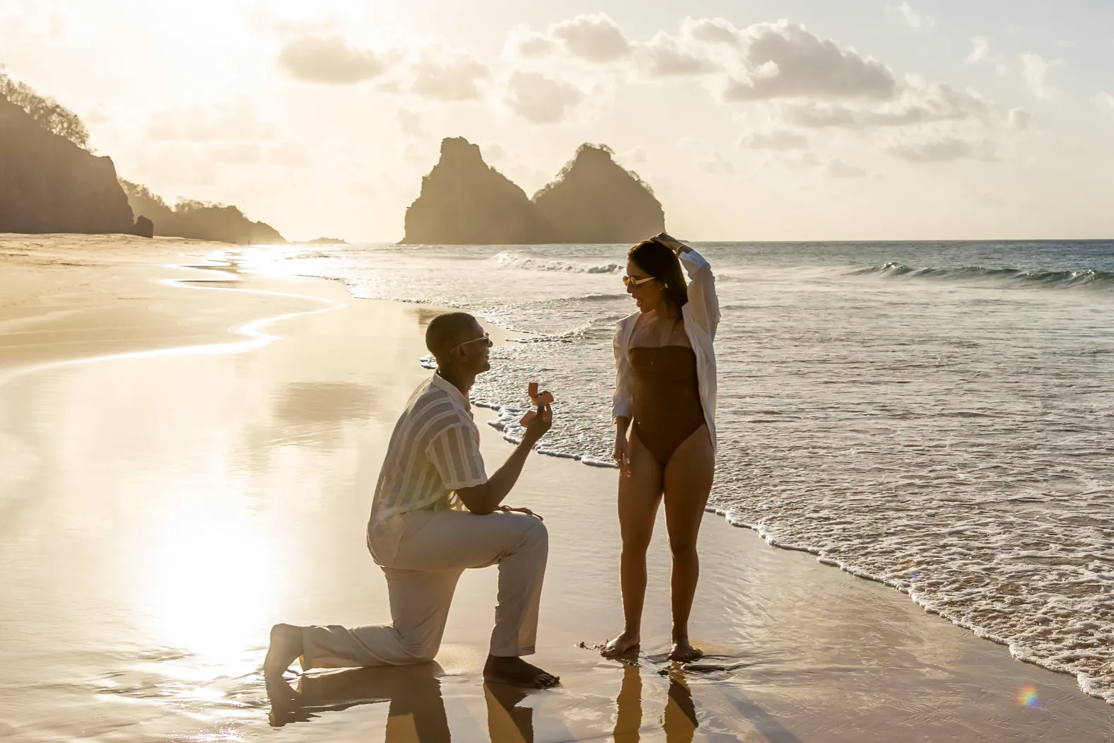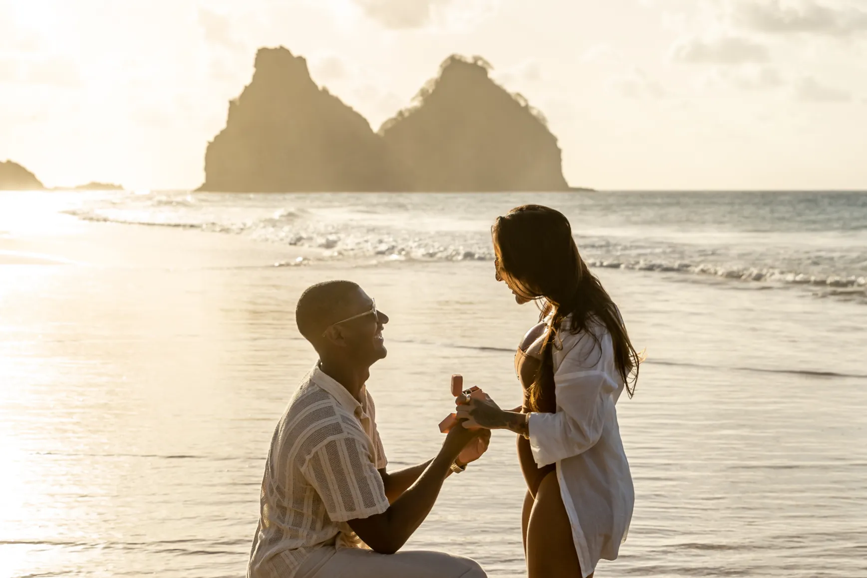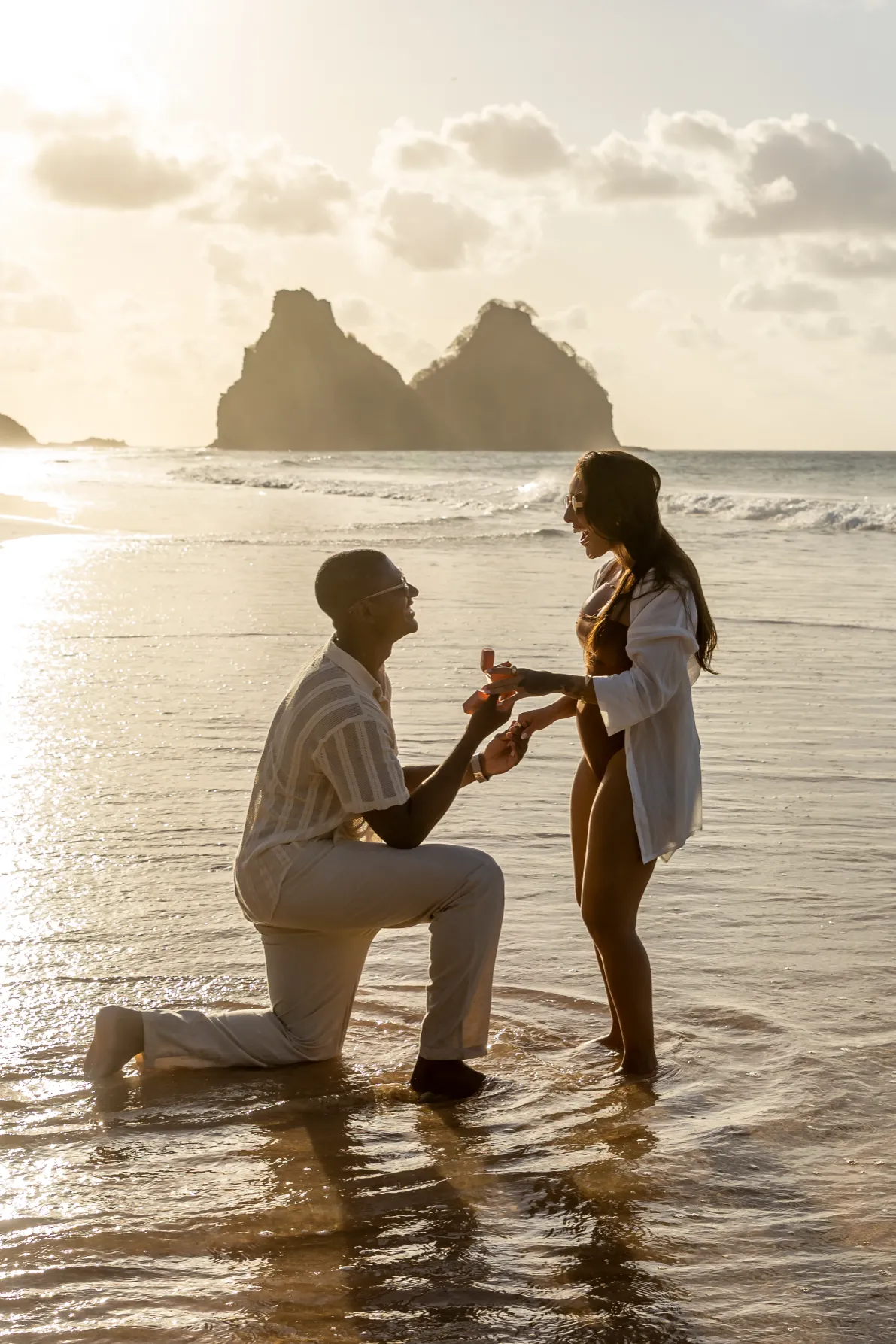 Estávamos focados em capturar a espera pelo bebê, mas o Zé tinha um plano maior. Enquanto as ondas quebravam suavemente e o céu ganhava tons de rosa e laranja, ele se ajoelhou.