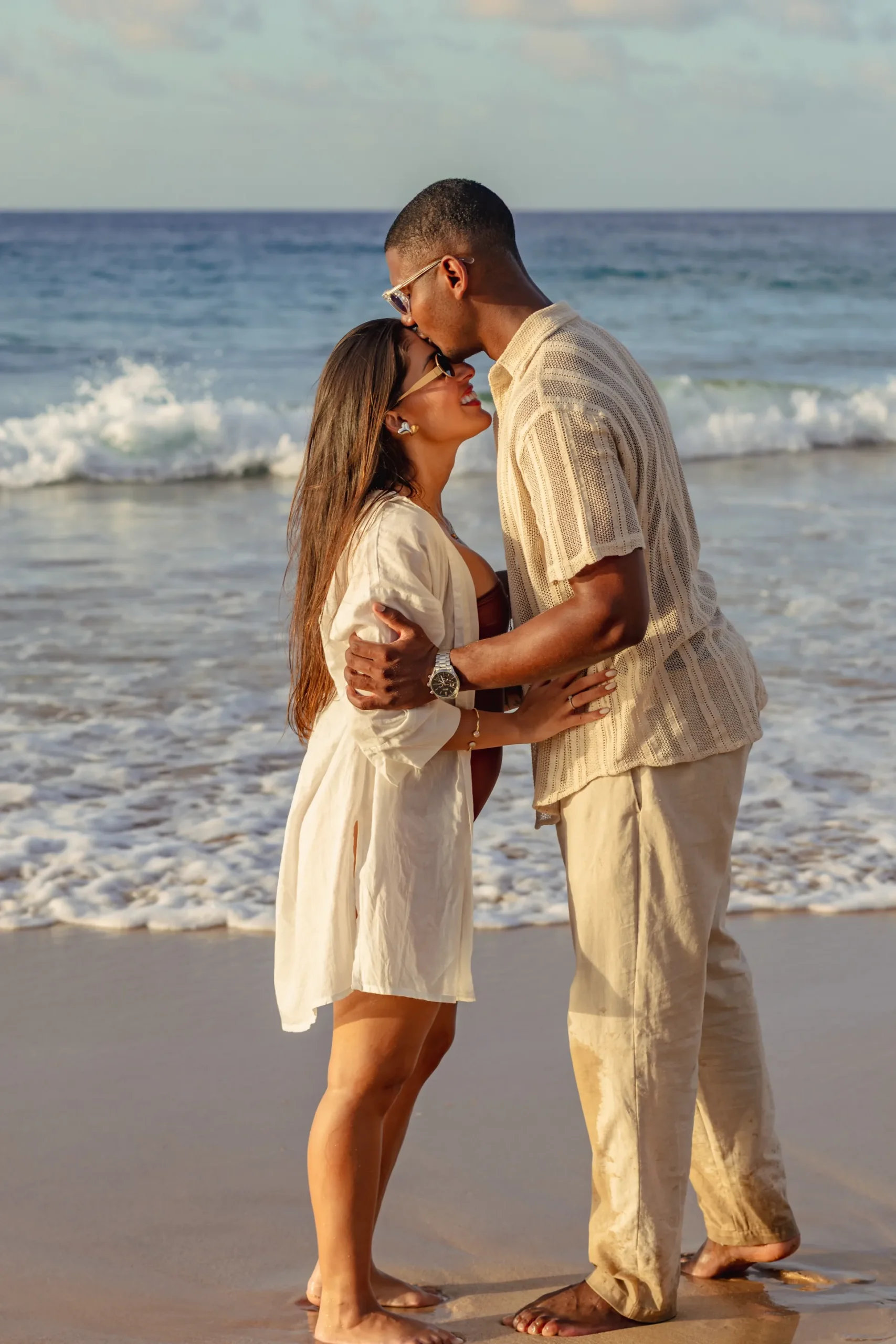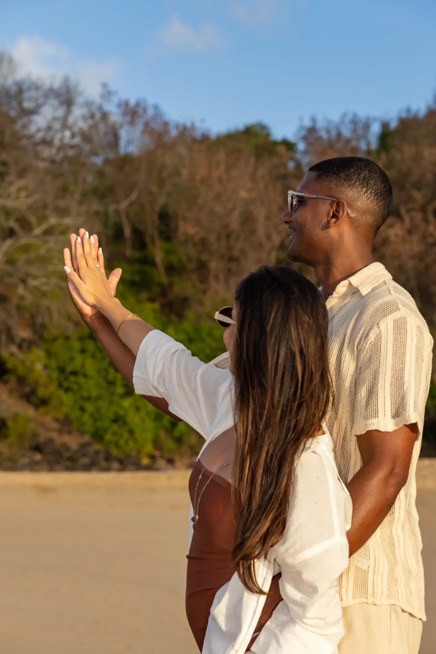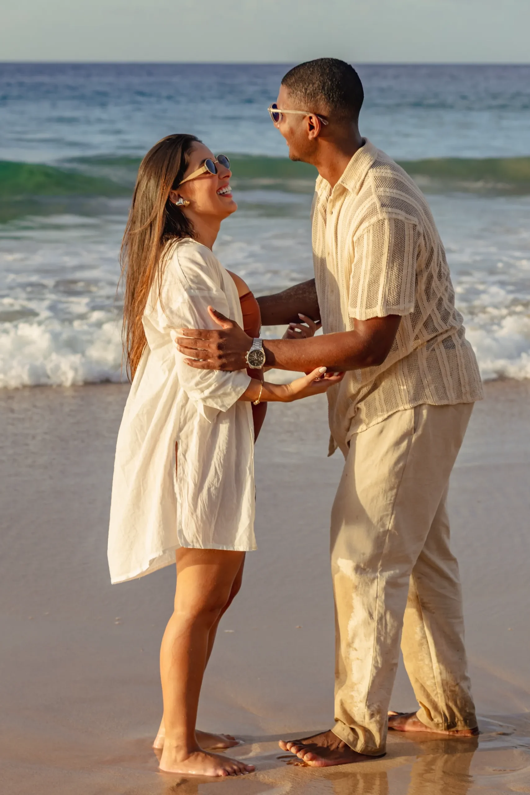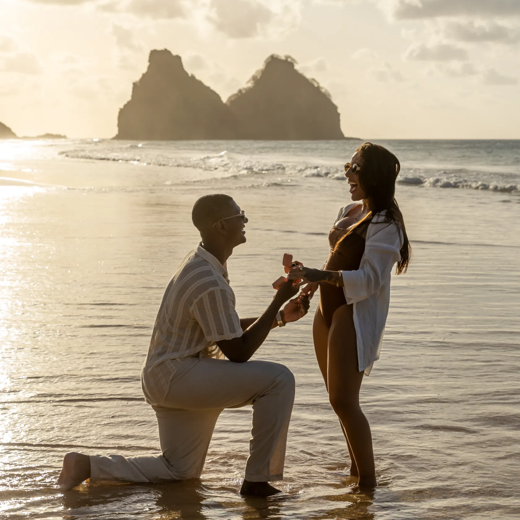 Estávamos focados em capturar a espera pelo bebê, mas o Zé tinha um plano maior. Enquanto as ondas quebravam suavemente e o céu ganhava tons de rosa e laranja, ele se ajoelhou.