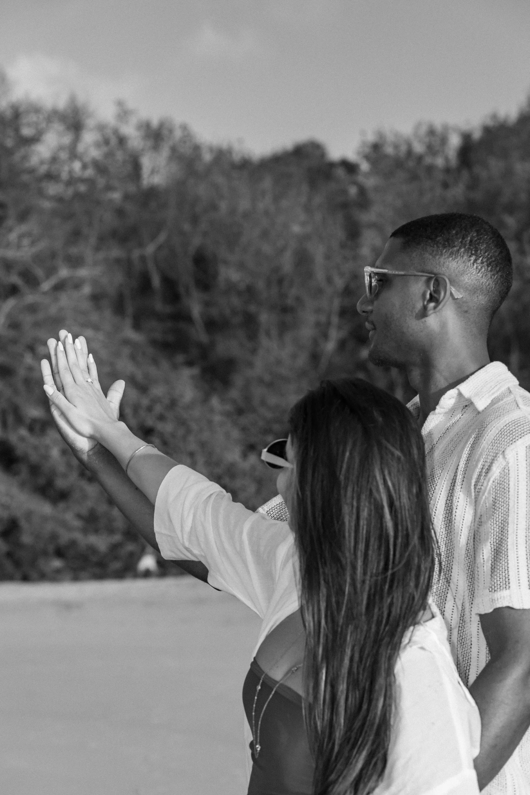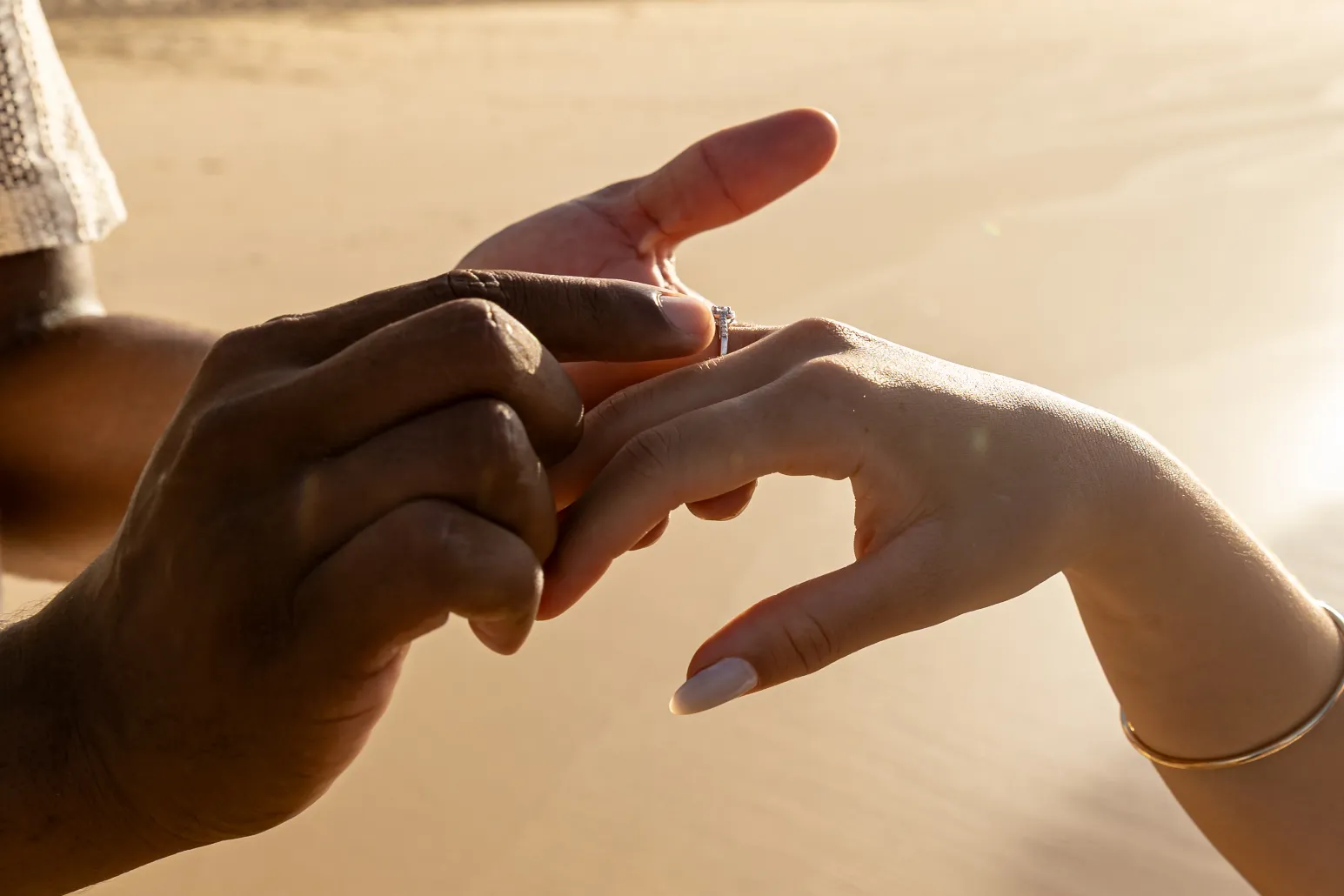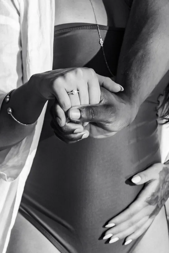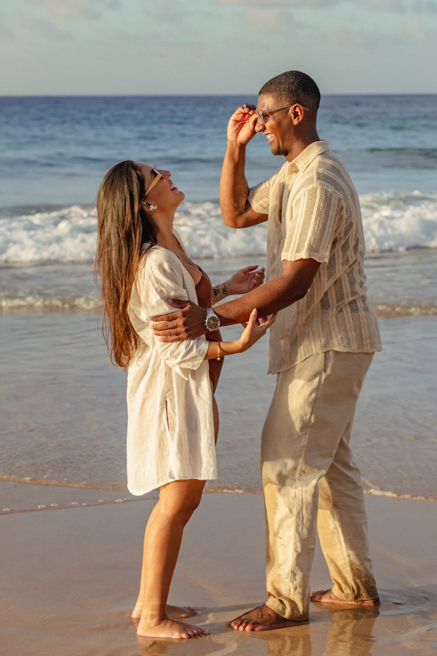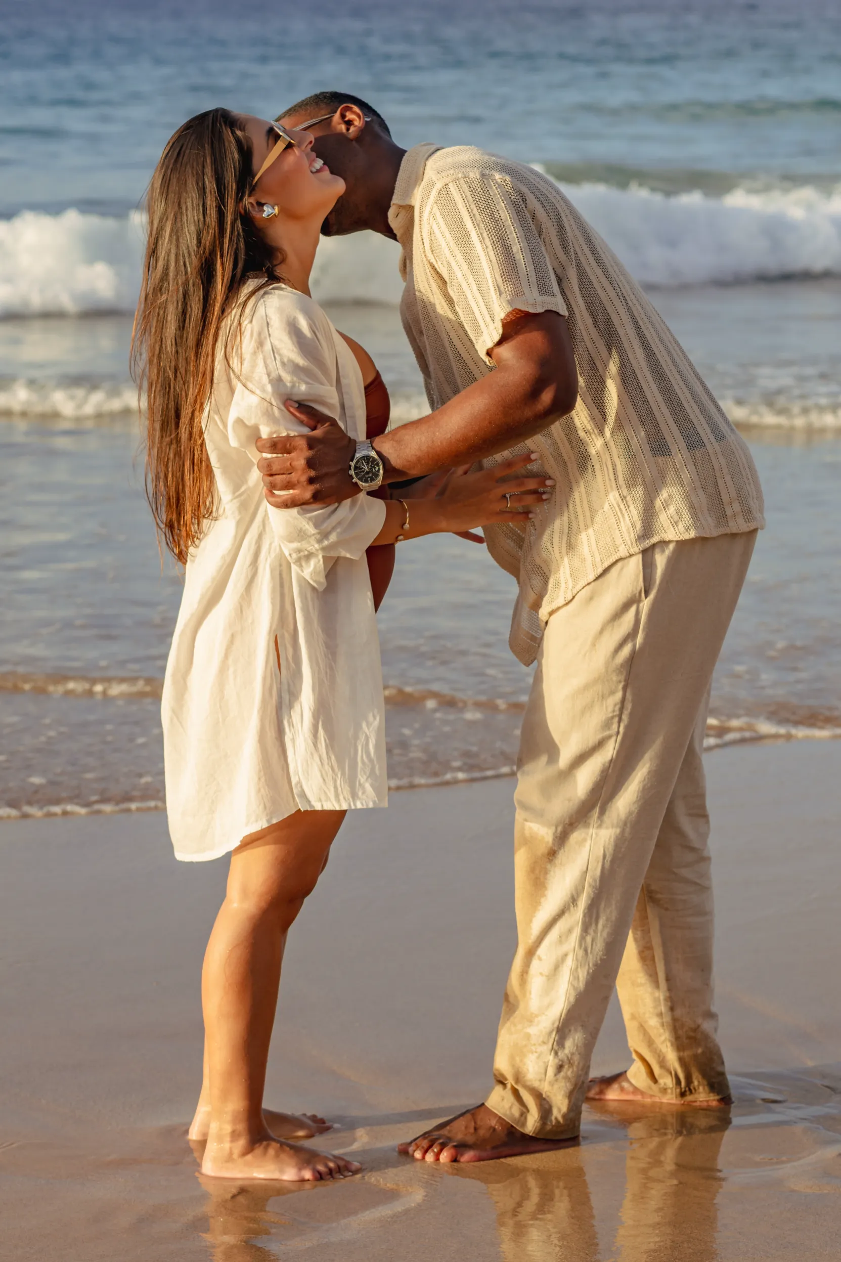 Estávamos focados em capturar a espera pelo bebê, mas o Zé tinha um plano maior. Enquanto as ondas quebravam suavemente e o céu ganhava tons de rosa e laranja, ele se ajoelhou.