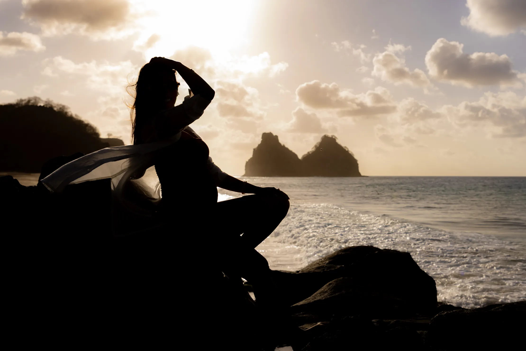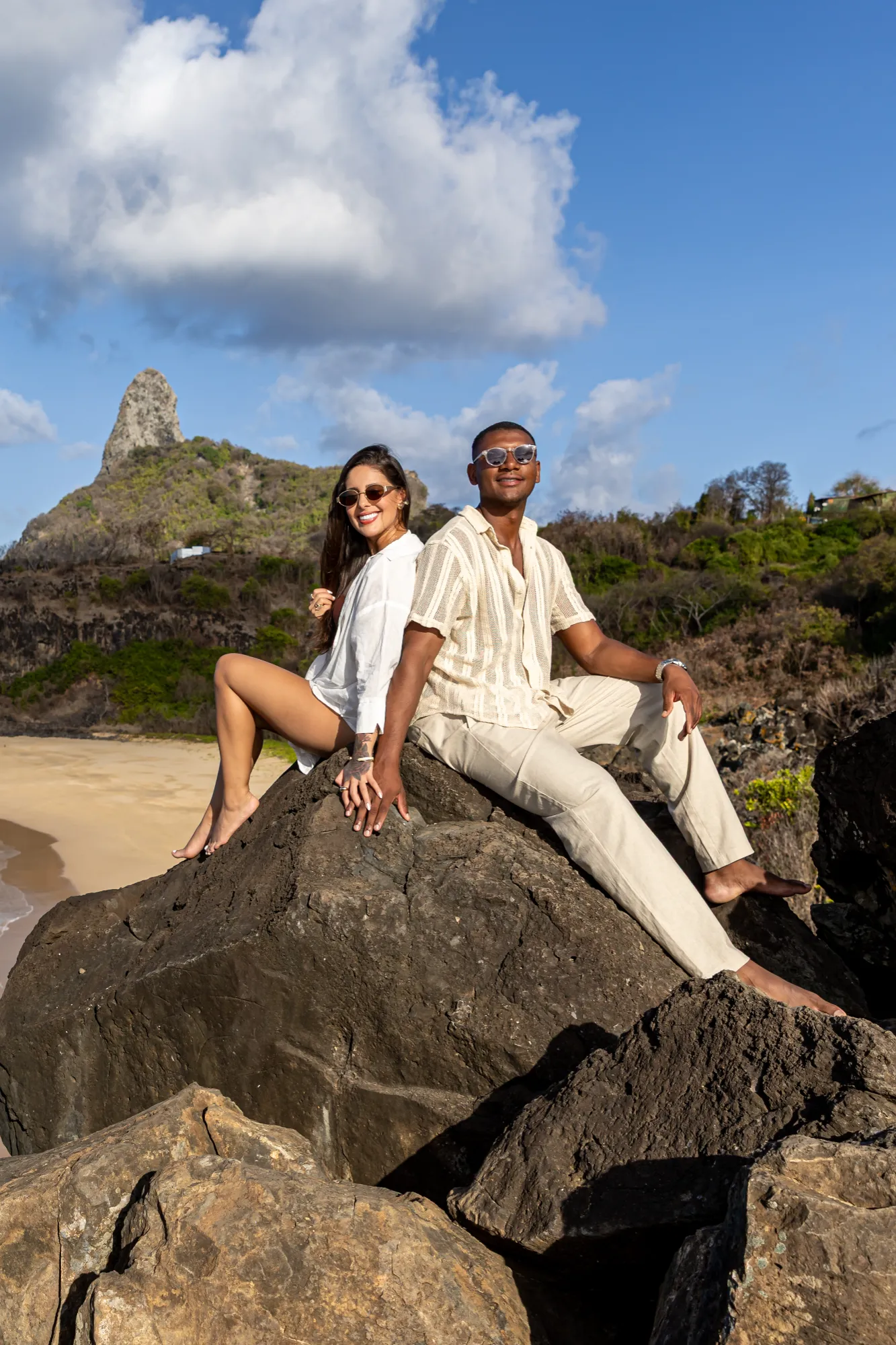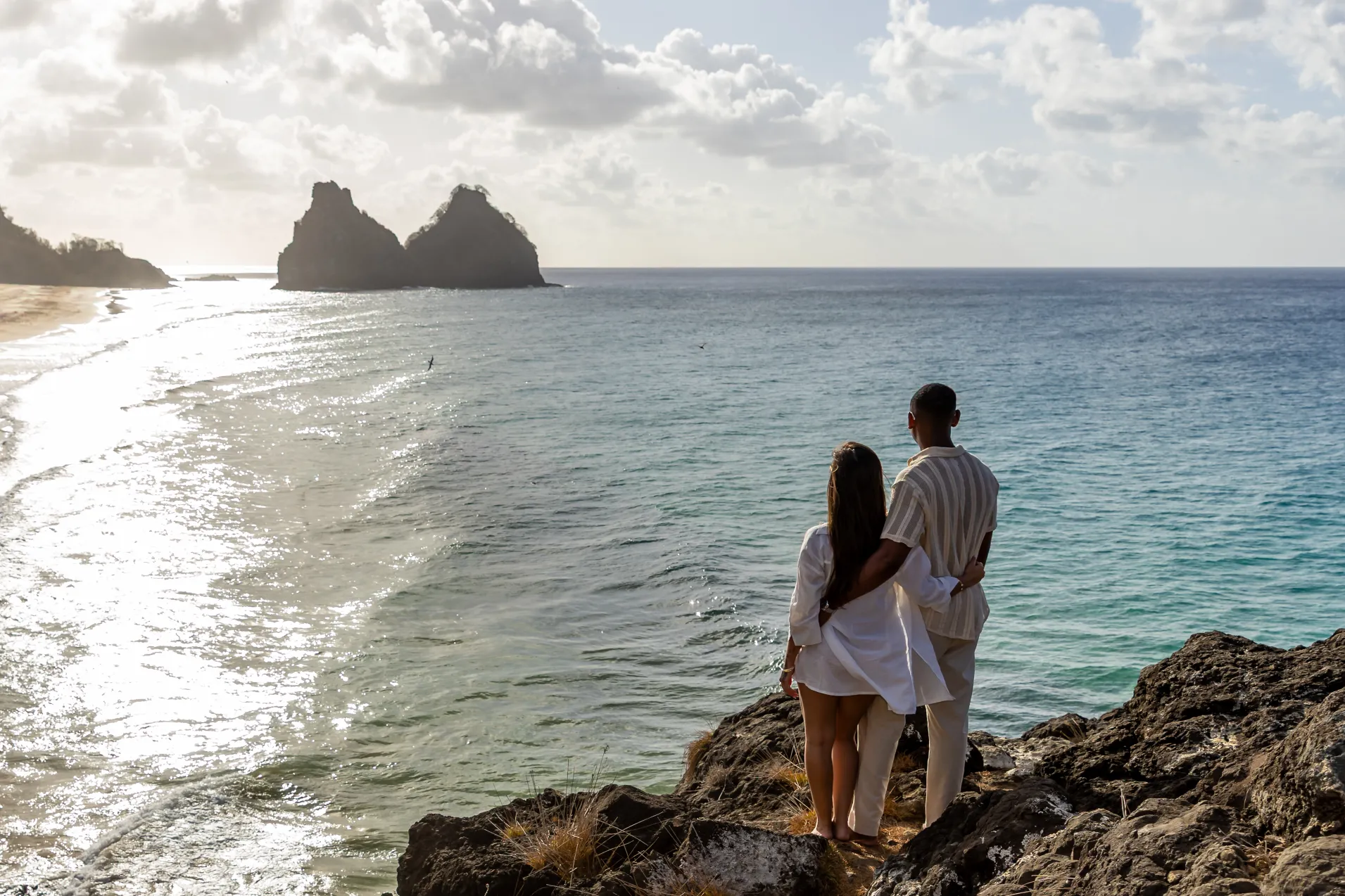 Nossa tarde começou no alto da Pedra do Bode. Esse é um dos meus pontos favoritos para iniciar um ensaio, pois oferece uma visão panorâmica que molda o horizonte com o azul infinito de Noronha.