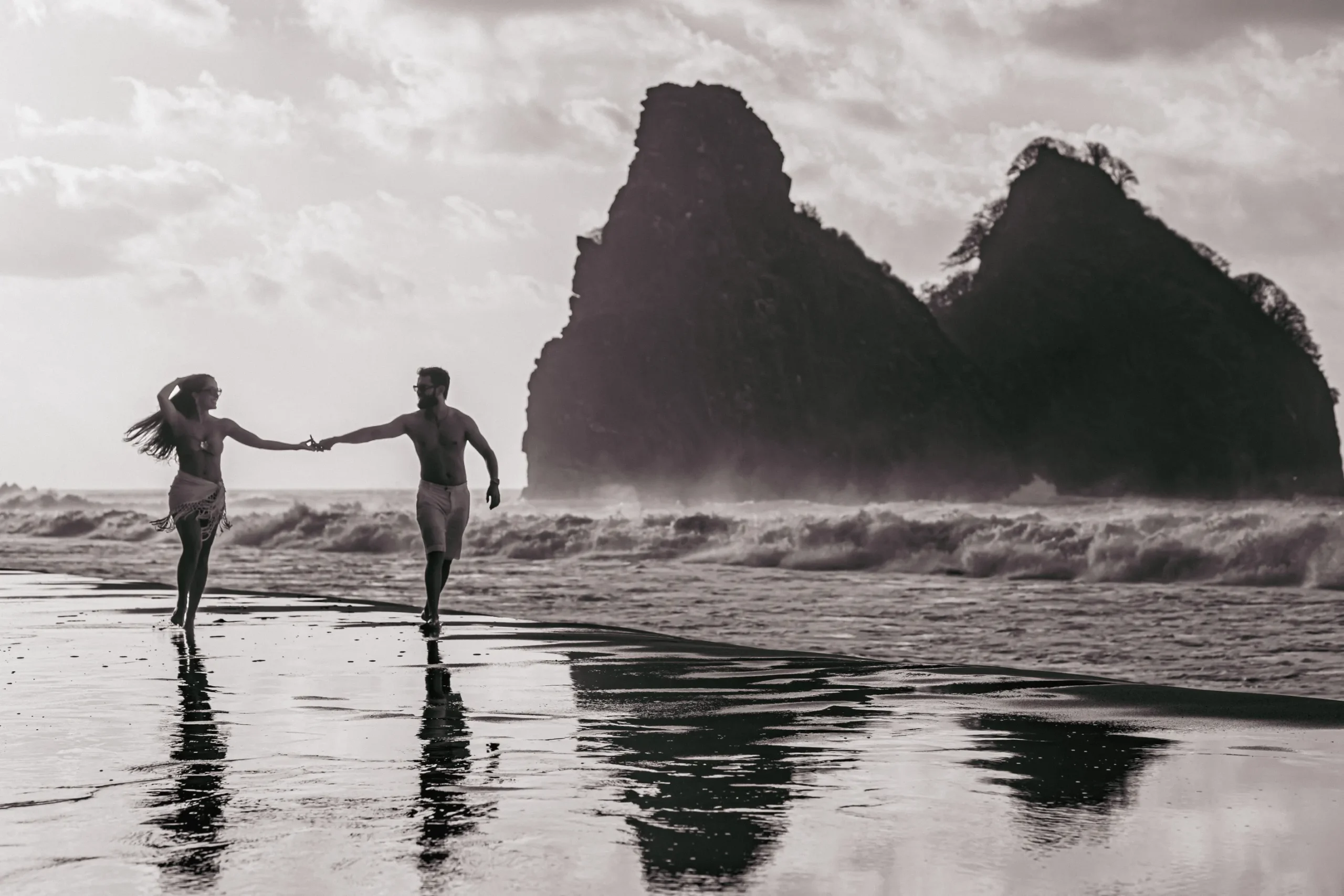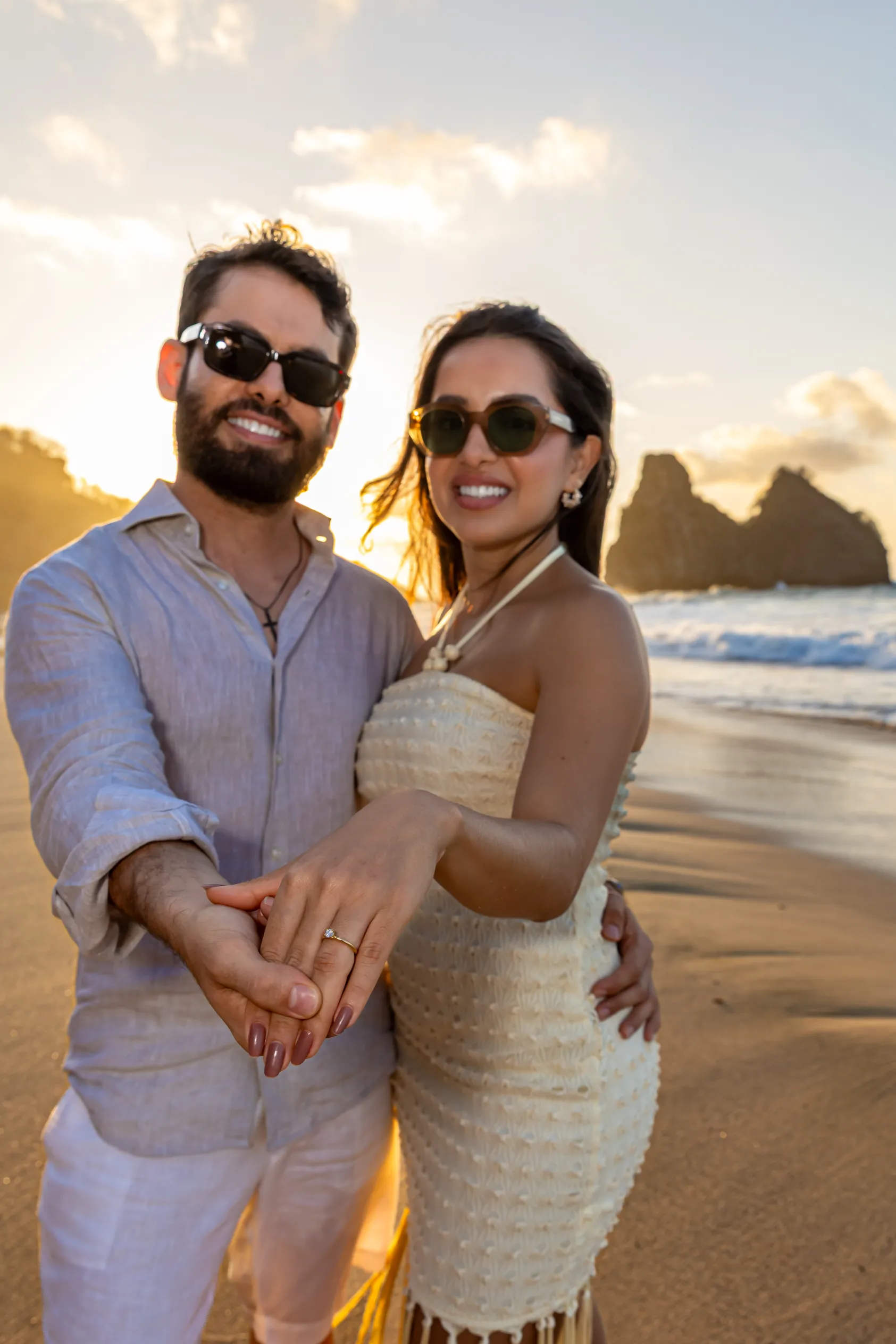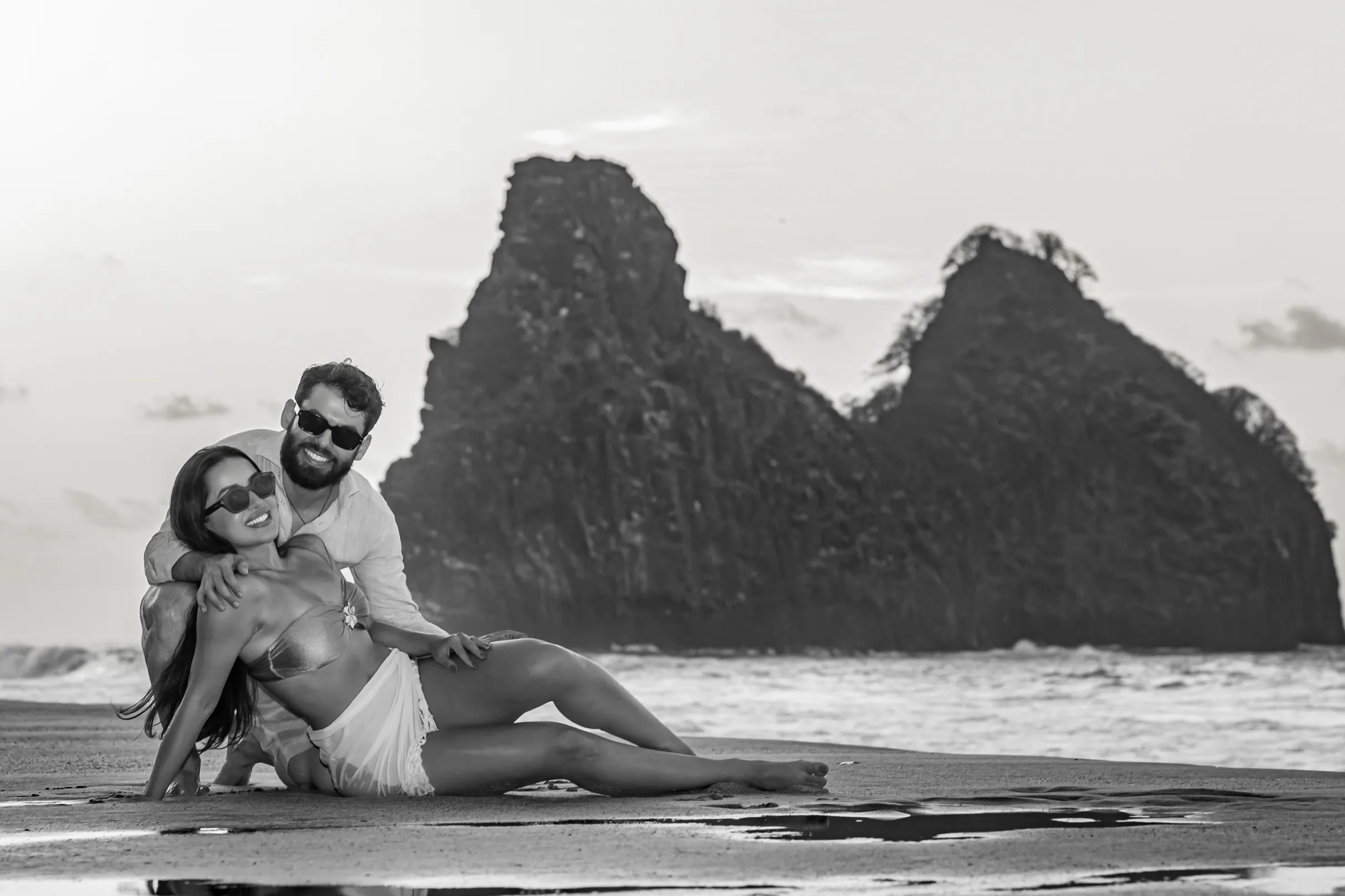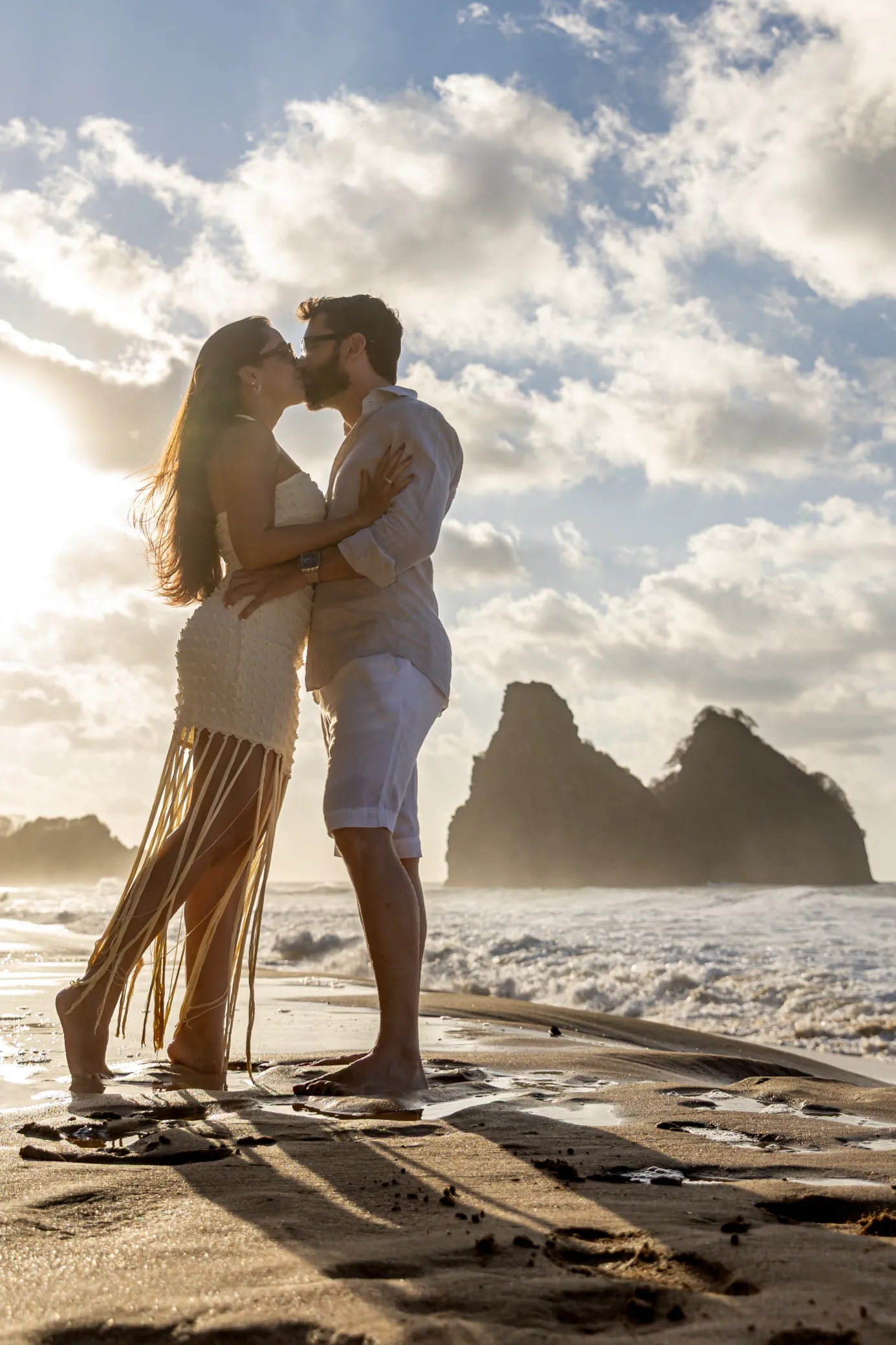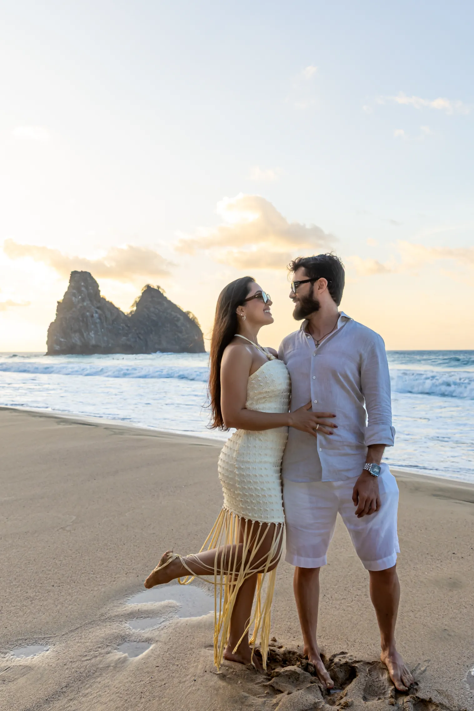 O ensaio da Luana e do Felipe foi planejado para aproveitar a luz única de Noronha. Escolhemos a Praia da Cacimba do Padre como palco principal, um lugar que emana uma força natural impressionante.