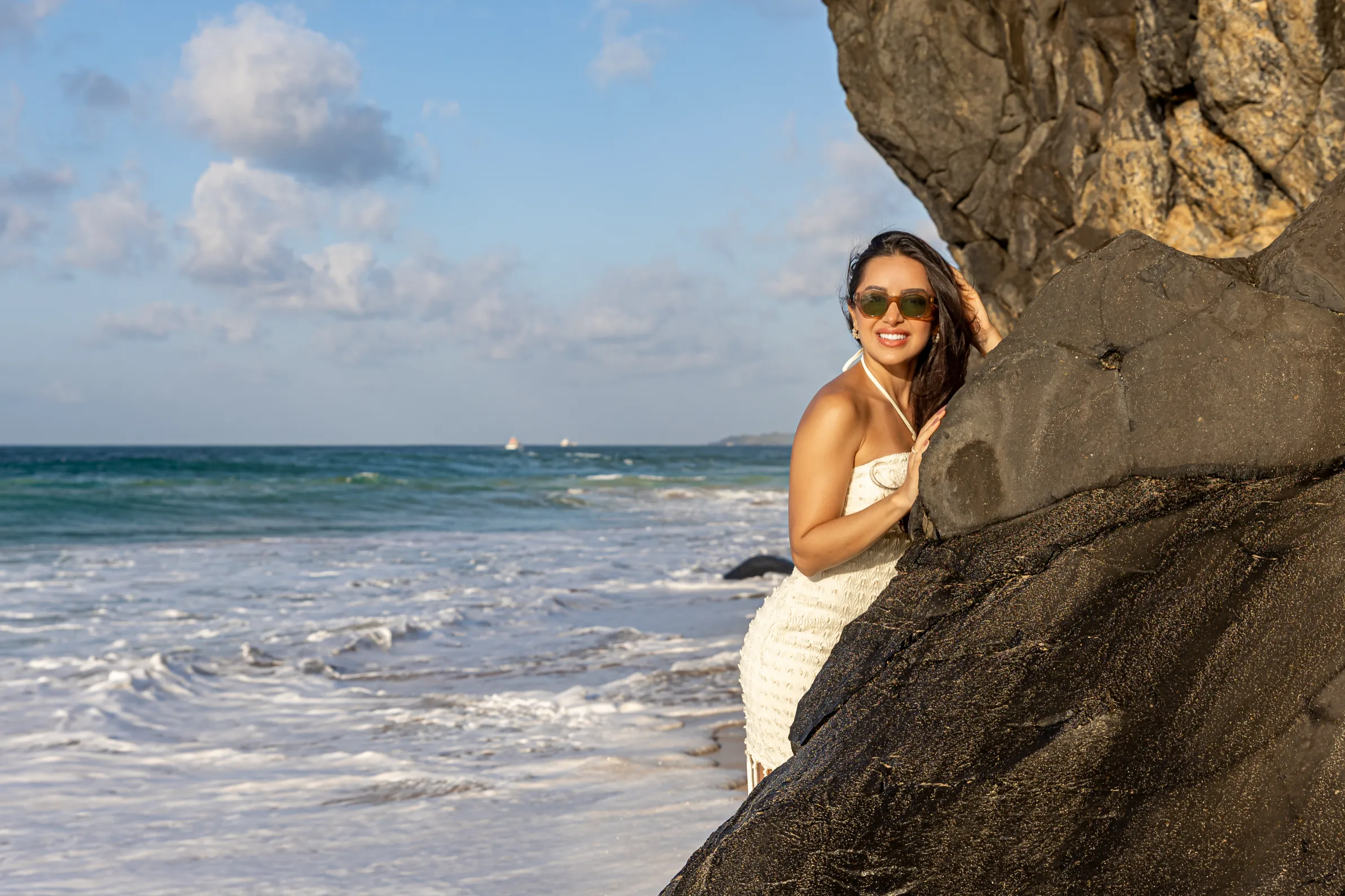 Além de ser visualmente deslumbrante, essa praia oferece uma dinâmica de luz que favorece muito a fotografia de casal. A textura das rochas e o azul profundo do mar criam um contraste que emoldura os noivos de forma orgânica.