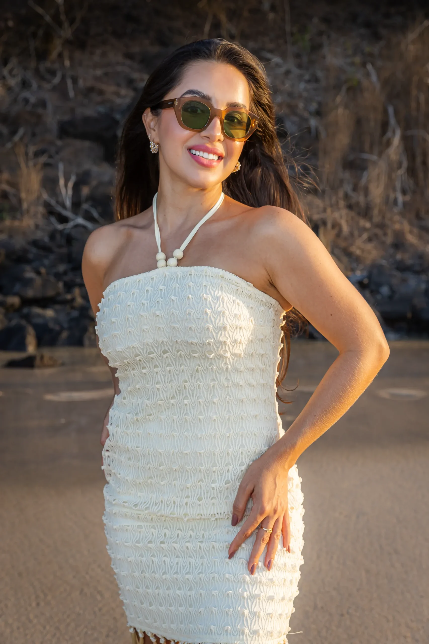 Aos pés do Morro Dois Irmãos: Começamos o ensaio com a imponência das pedras gêmeas ao fundo, o cartão-postal mais famoso da ilha.