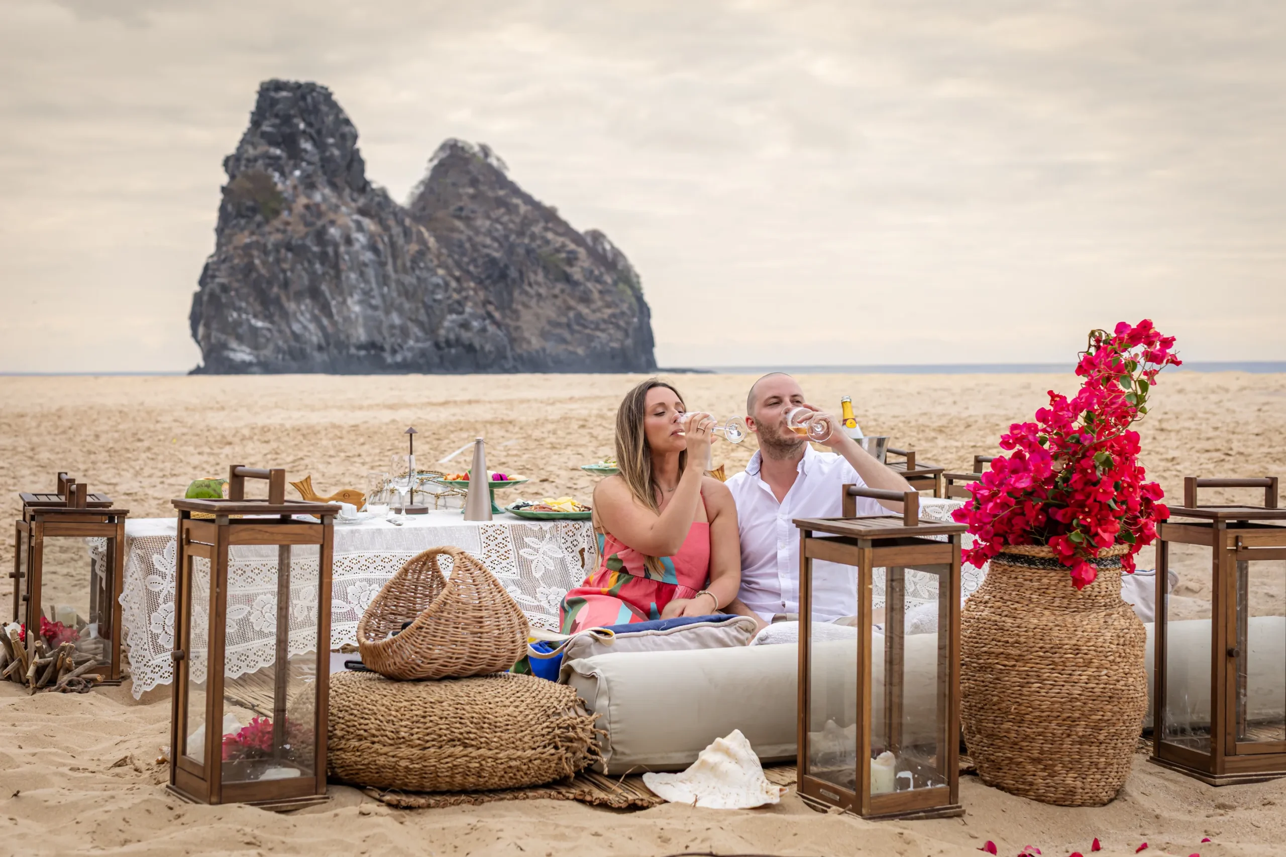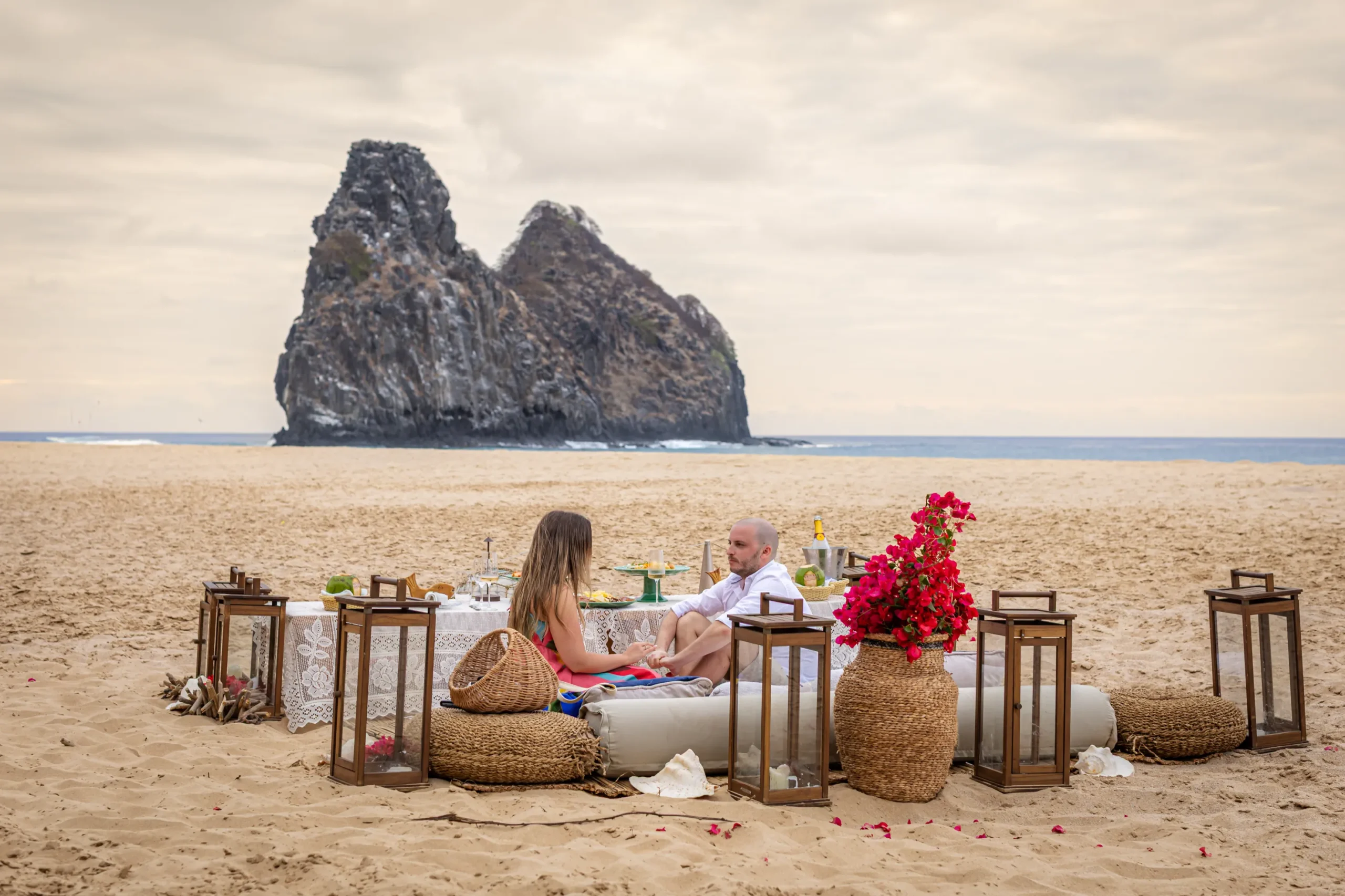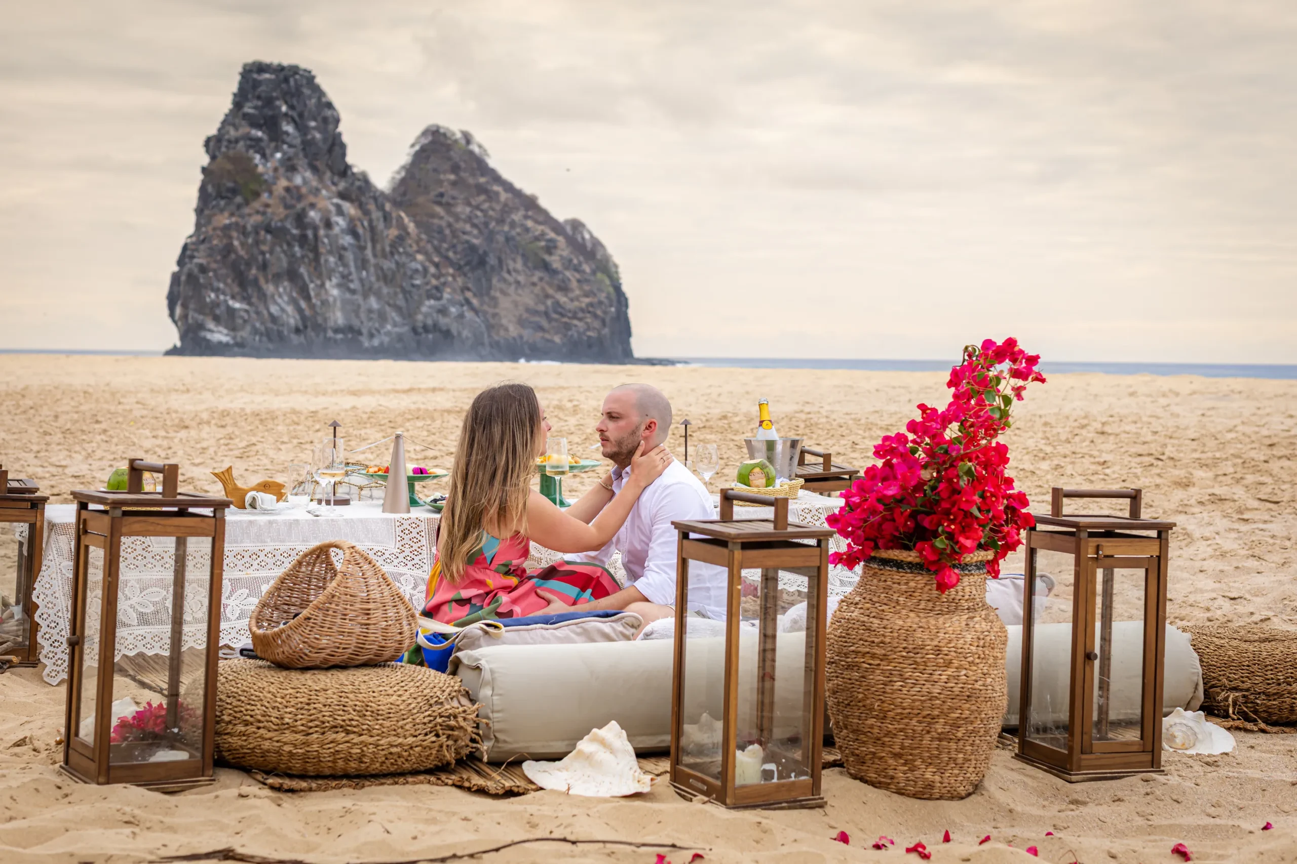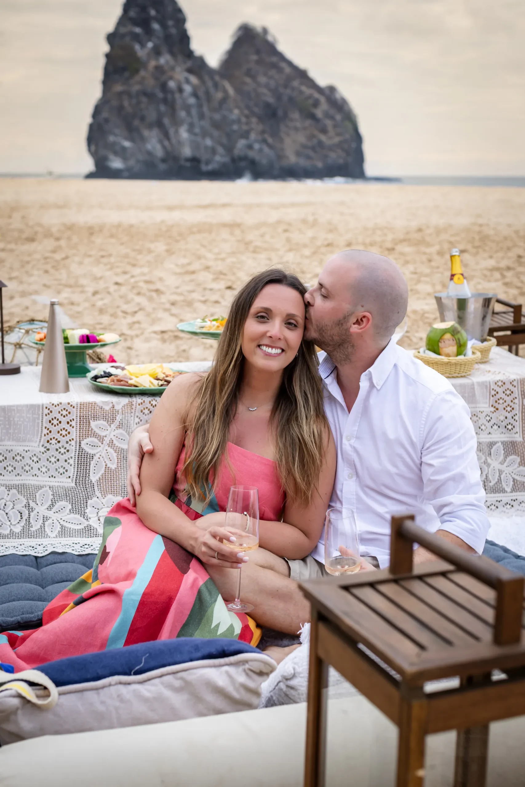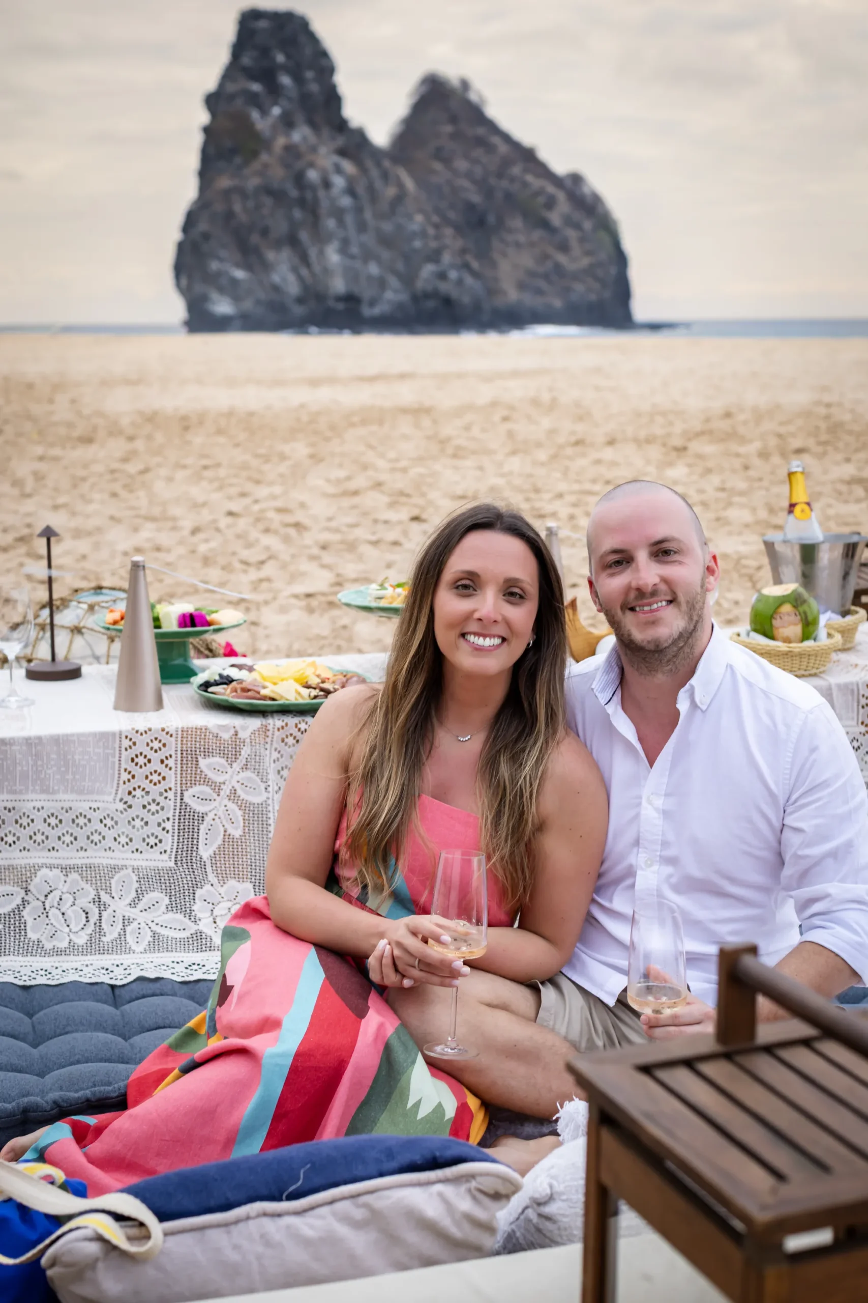 Contudo, a magia estava longe de terminar. Após a forte emoção vivida no mirante, o casal desceu em direção à areia dourada da Praia da Cacimba do Padre. Lá, uma nova surpresa aguardava a Filipa: uma mesa de piquenique luxuosa e delicadamente decorada, preparada com todo o carinho e acompanhada por espumante para celebrar a nova etapa.
