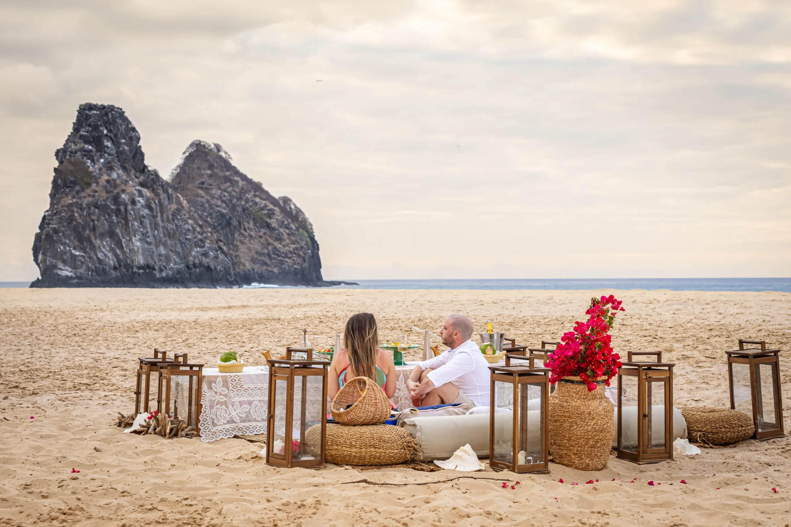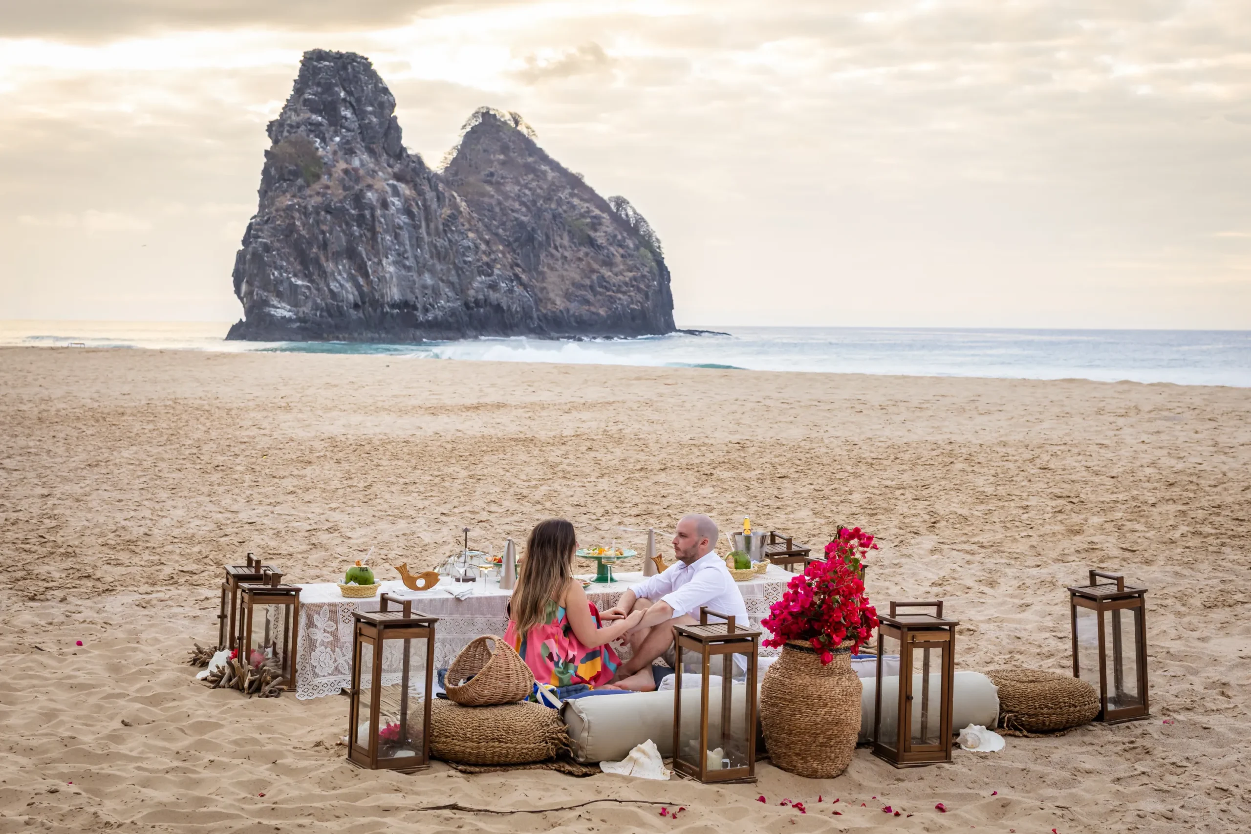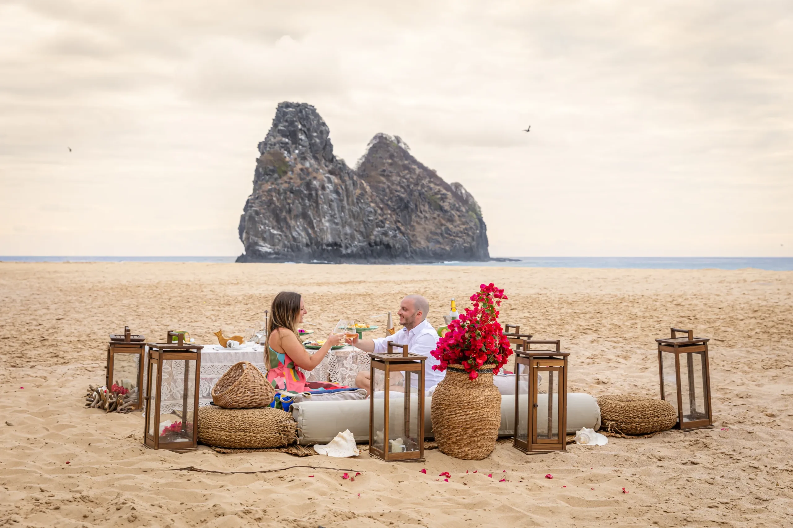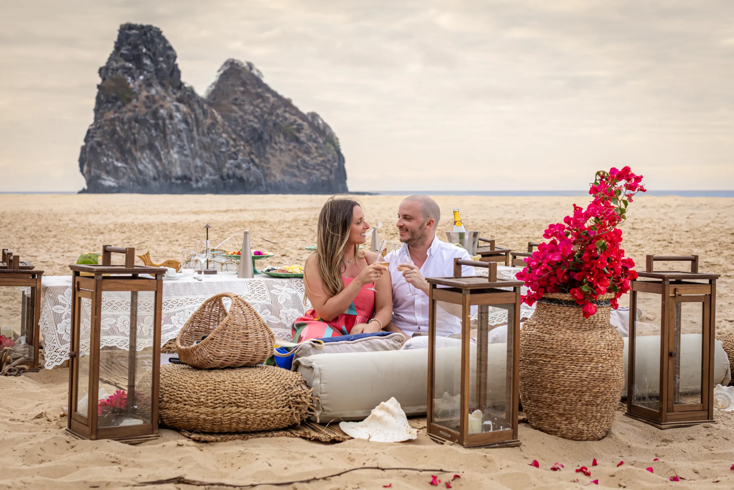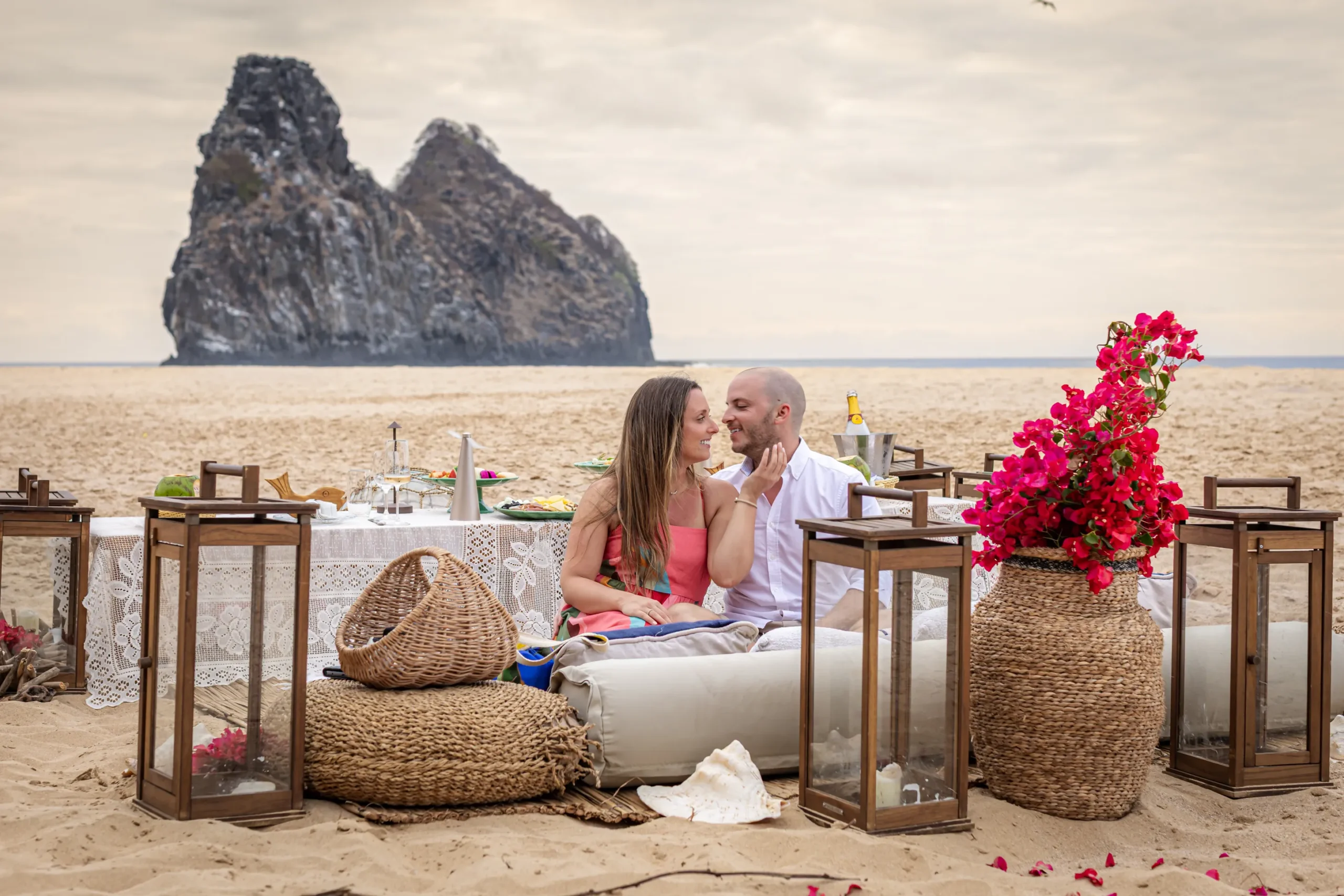 Contudo, a magia estava longe de terminar. Após a forte emoção vivida no mirante, o casal desceu em direção à areia dourada da Praia da Cacimba do Padre. Lá, uma nova surpresa aguardava a Filipa: uma mesa de piquenique luxuosa e delicadamente decorada, preparada com todo o carinho e acompanhada por espumante para celebrar a nova etapa.