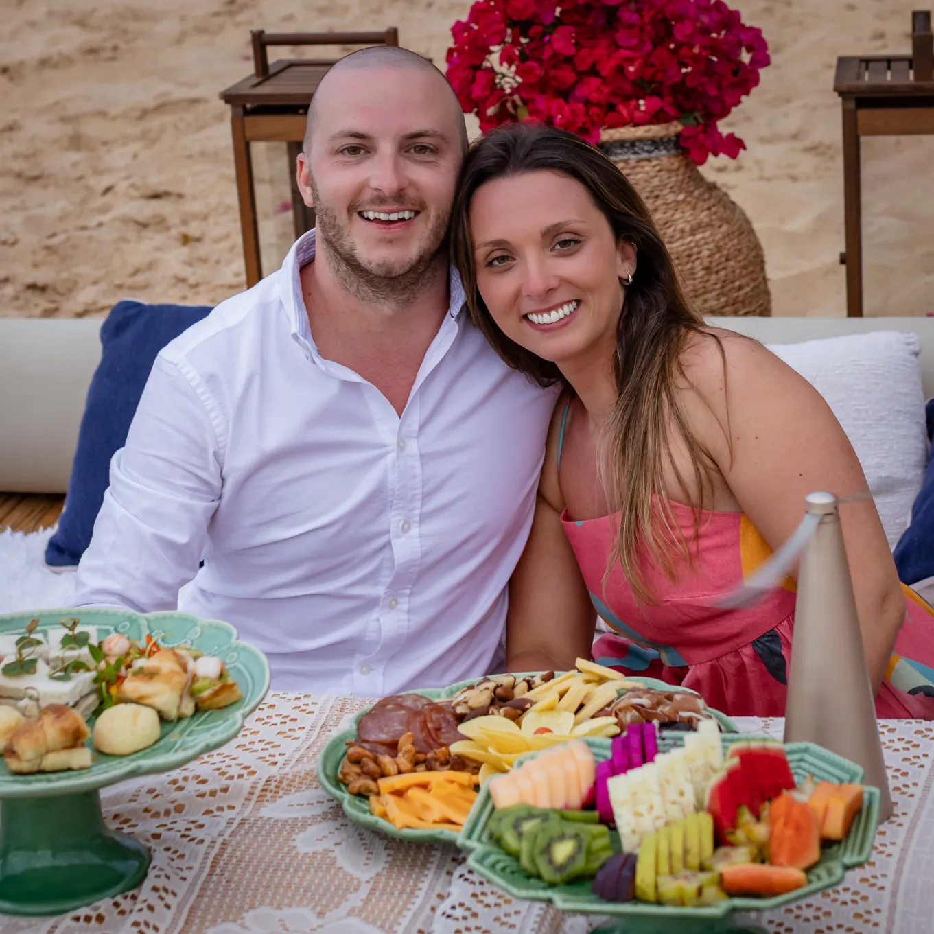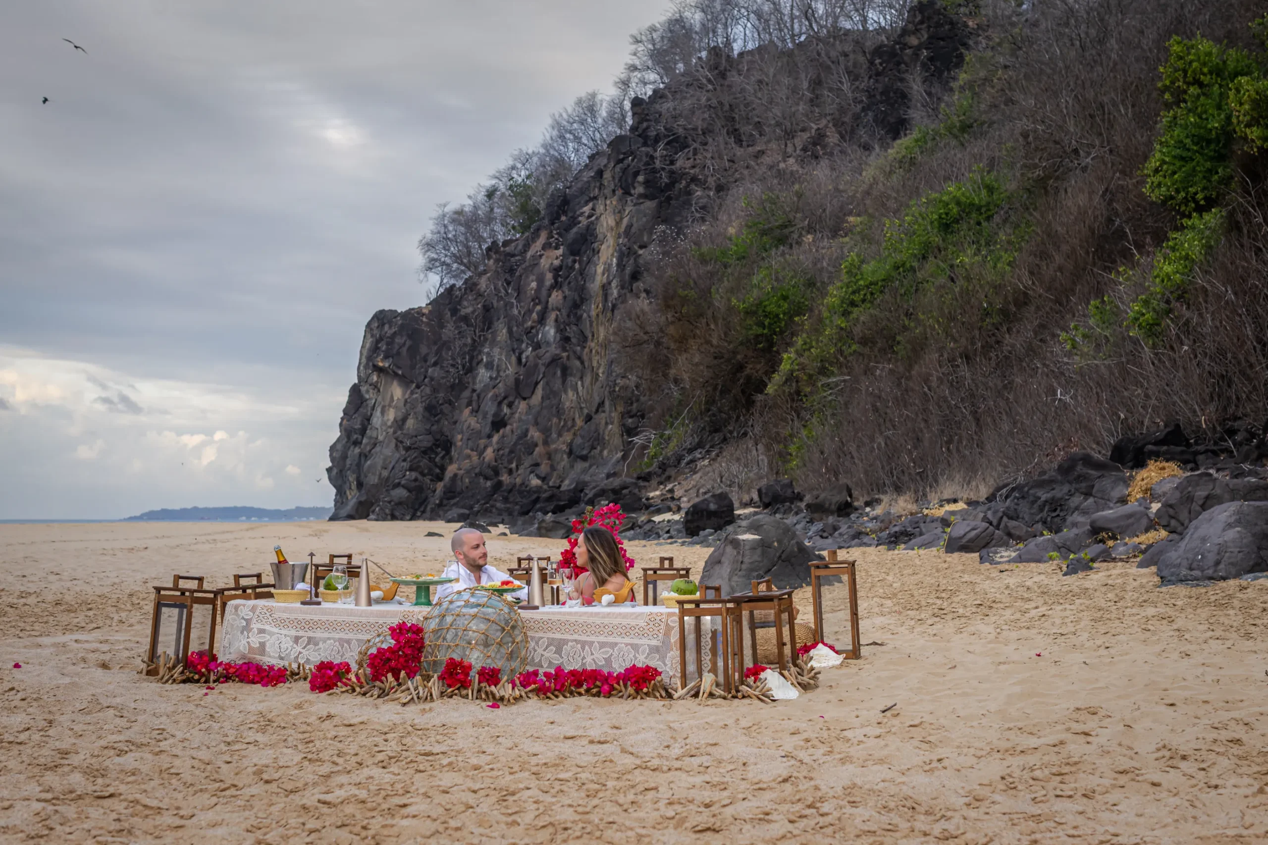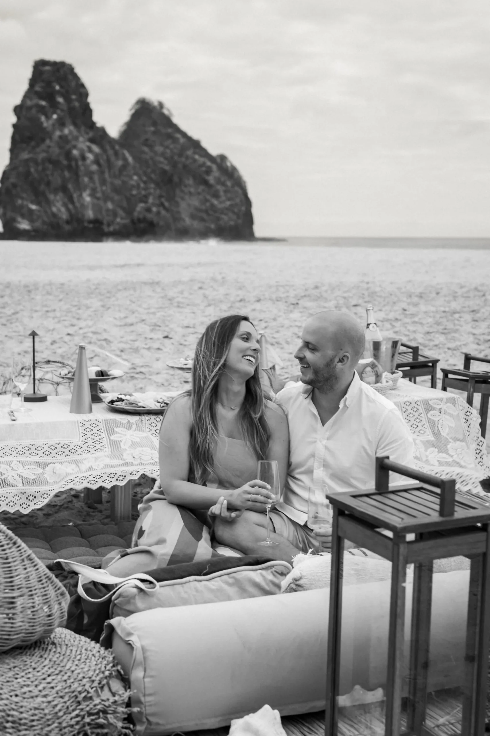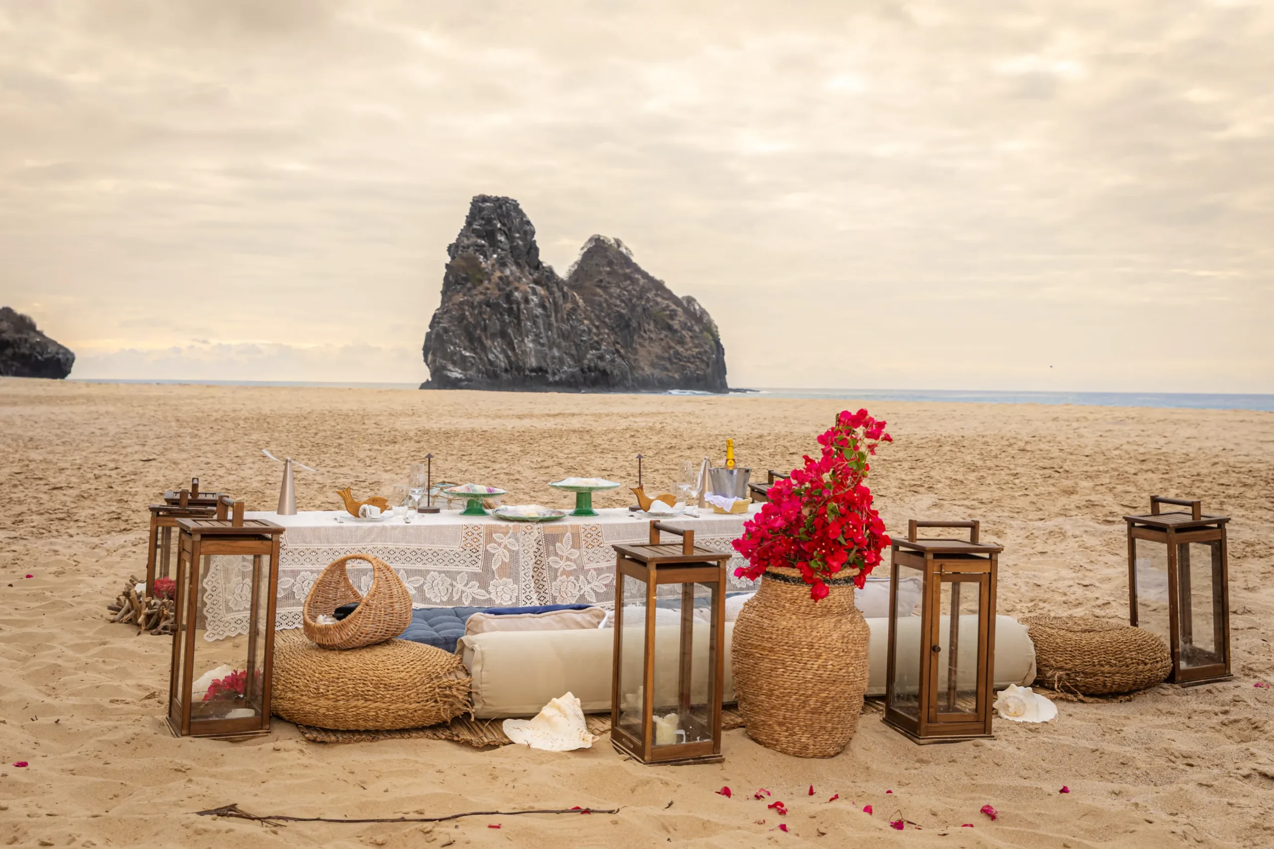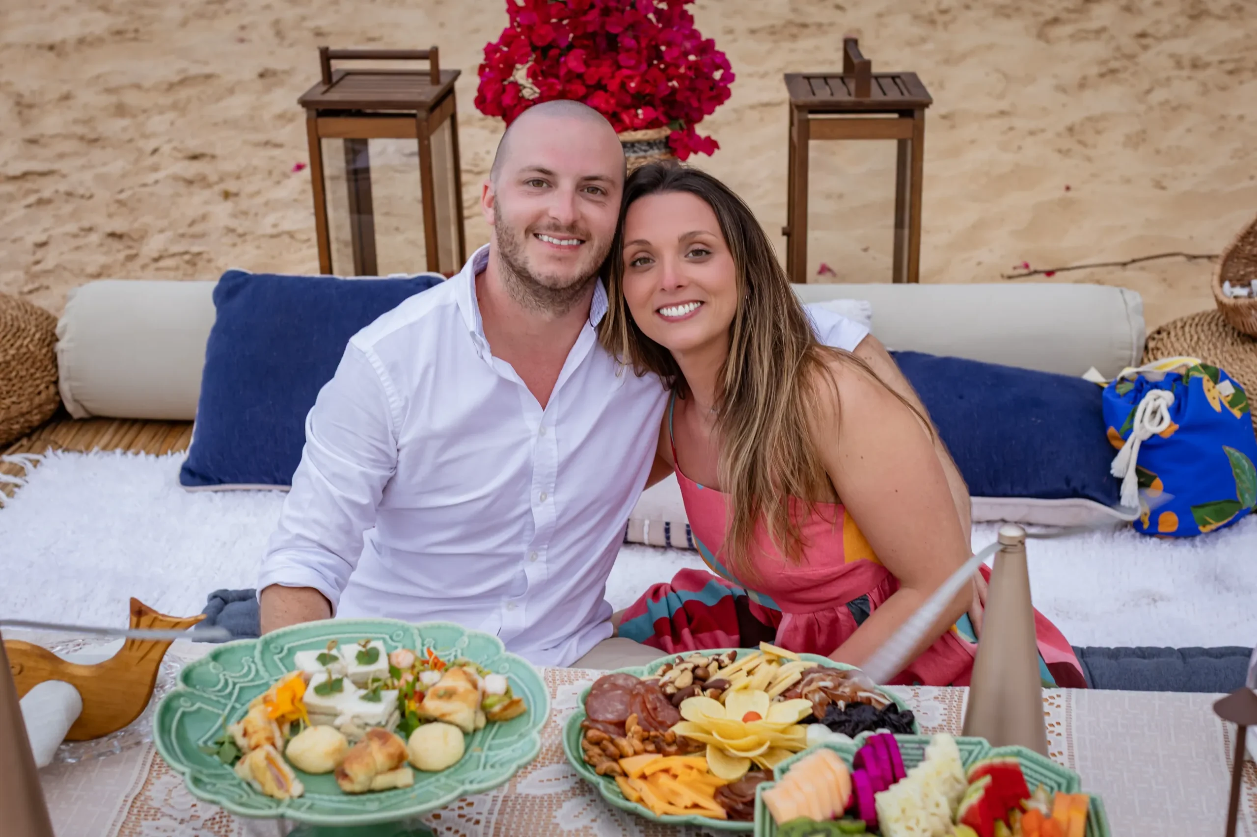 Contudo, a magia estava longe de terminar. Após a forte emoção vivida no mirante, o casal desceu em direção à areia dourada da Praia da Cacimba do Padre. Lá, uma nova surpresa aguardava a Filipa: uma mesa de piquenique luxuosa e delicadamente decorada, preparada com todo o carinho e acompanhada por espumante para celebrar a nova etapa.