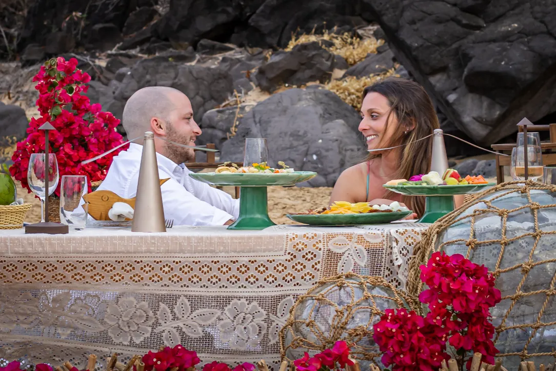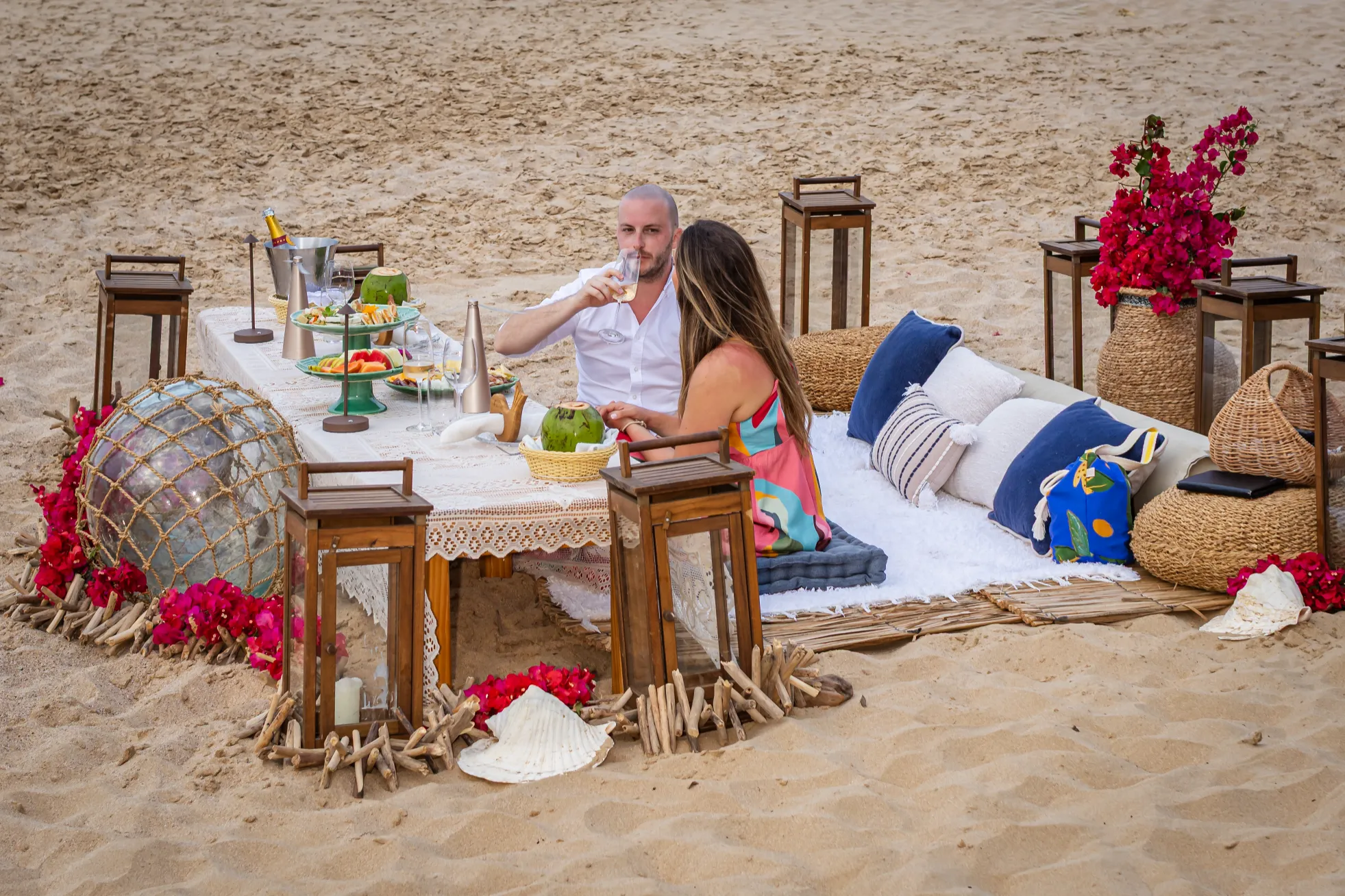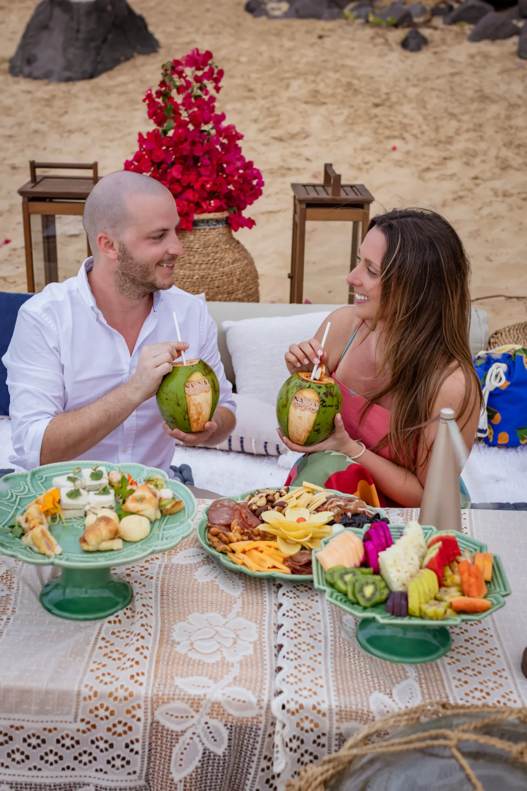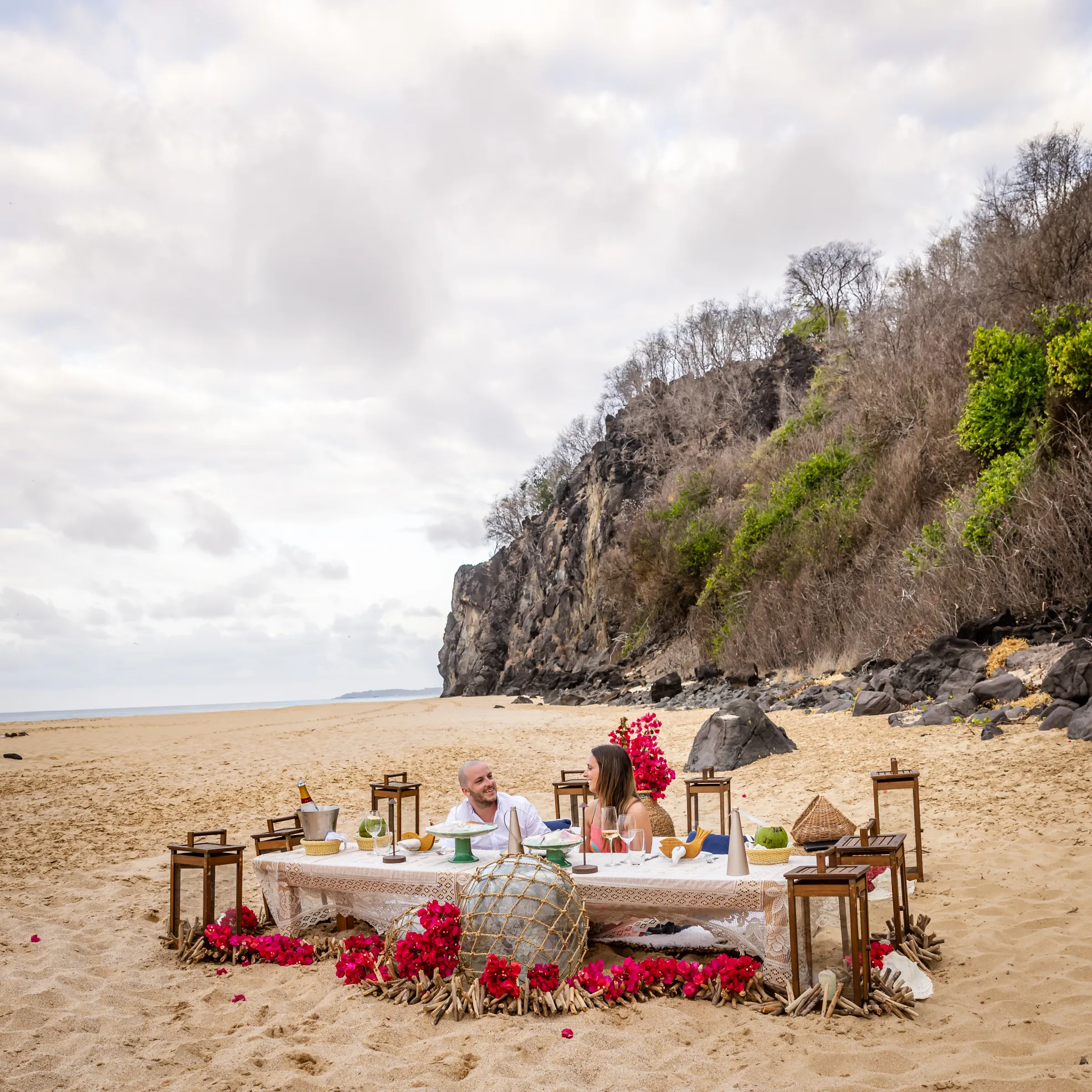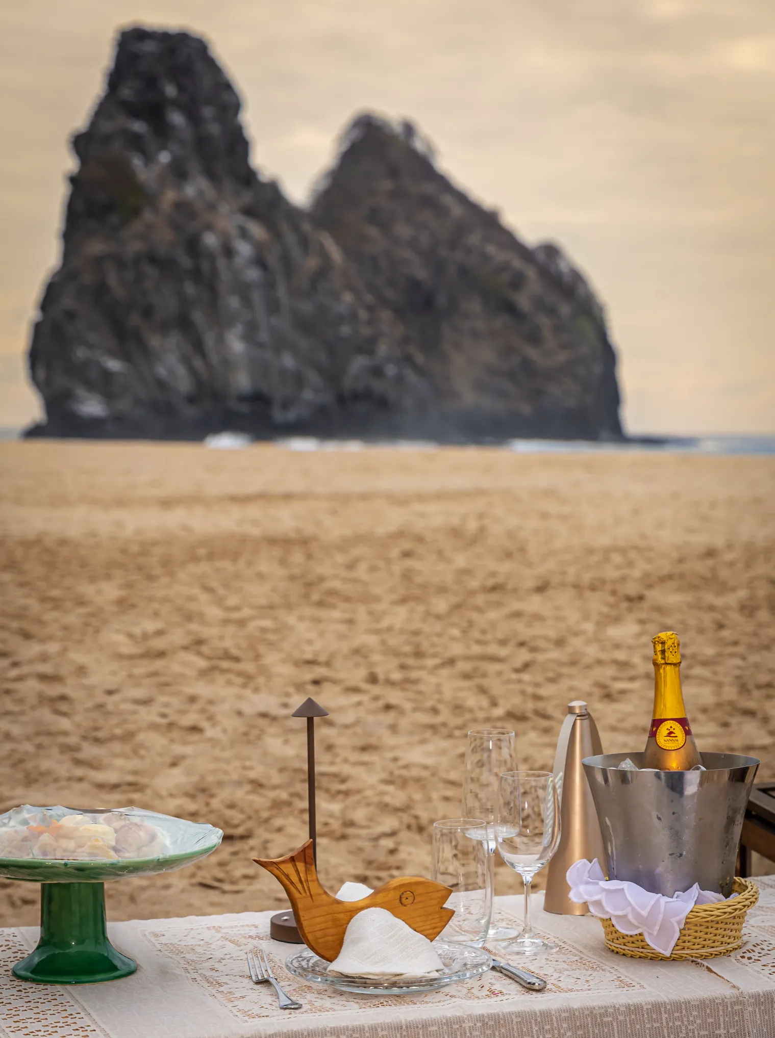Contudo, a magia estava longe de terminar. Após a forte emoção vivida no mirante, o casal desceu em direção à areia dourada da Praia da Cacimba do Padre. Lá, uma nova surpresa aguardava a Filipa: uma mesa de piquenique luxuosa e delicadamente decorada, preparada com todo o carinho e acompanhada por espumante para celebrar a nova etapa.