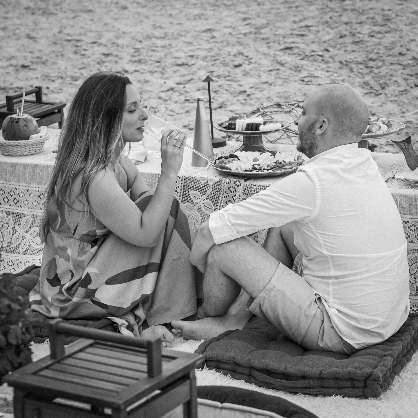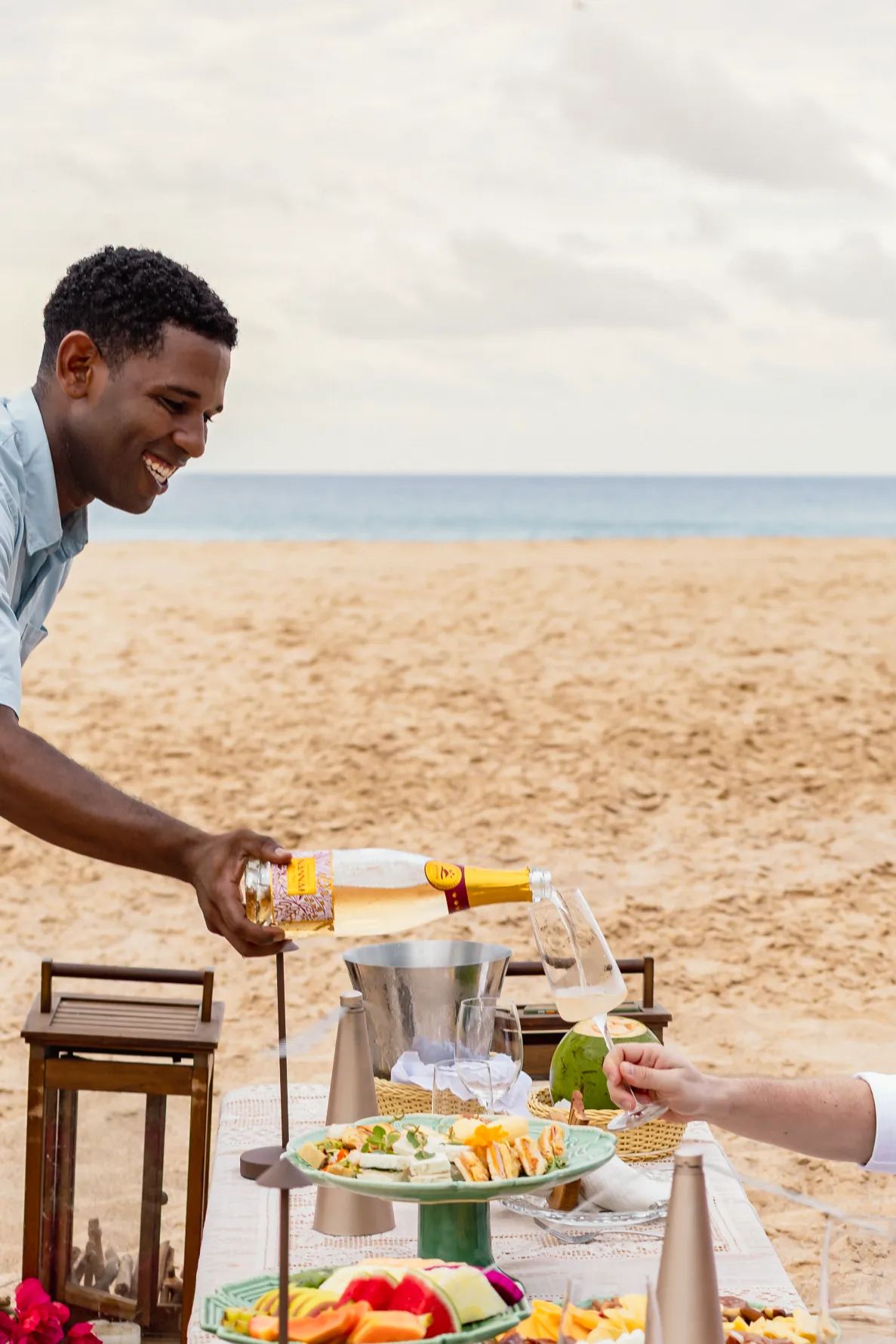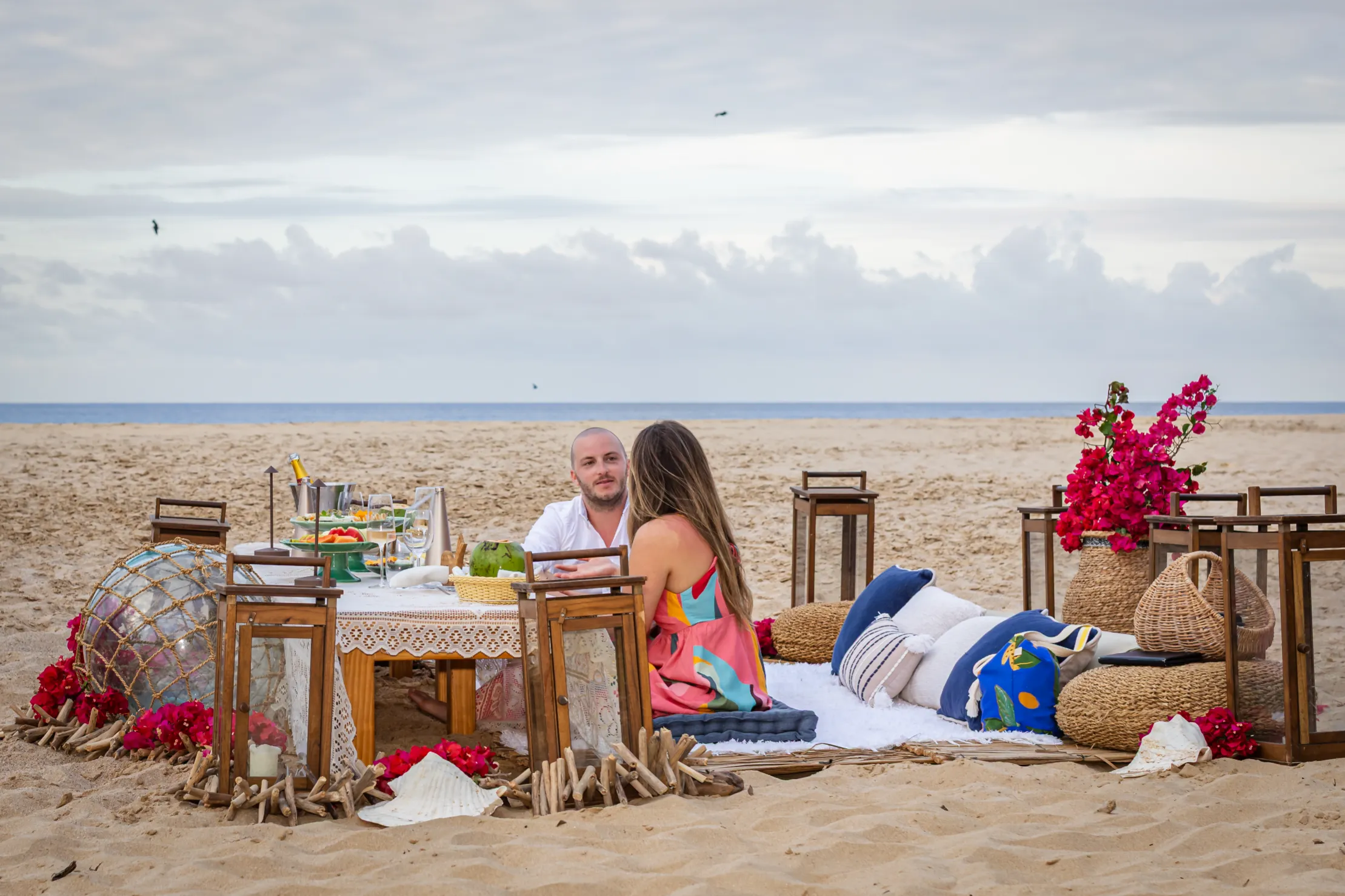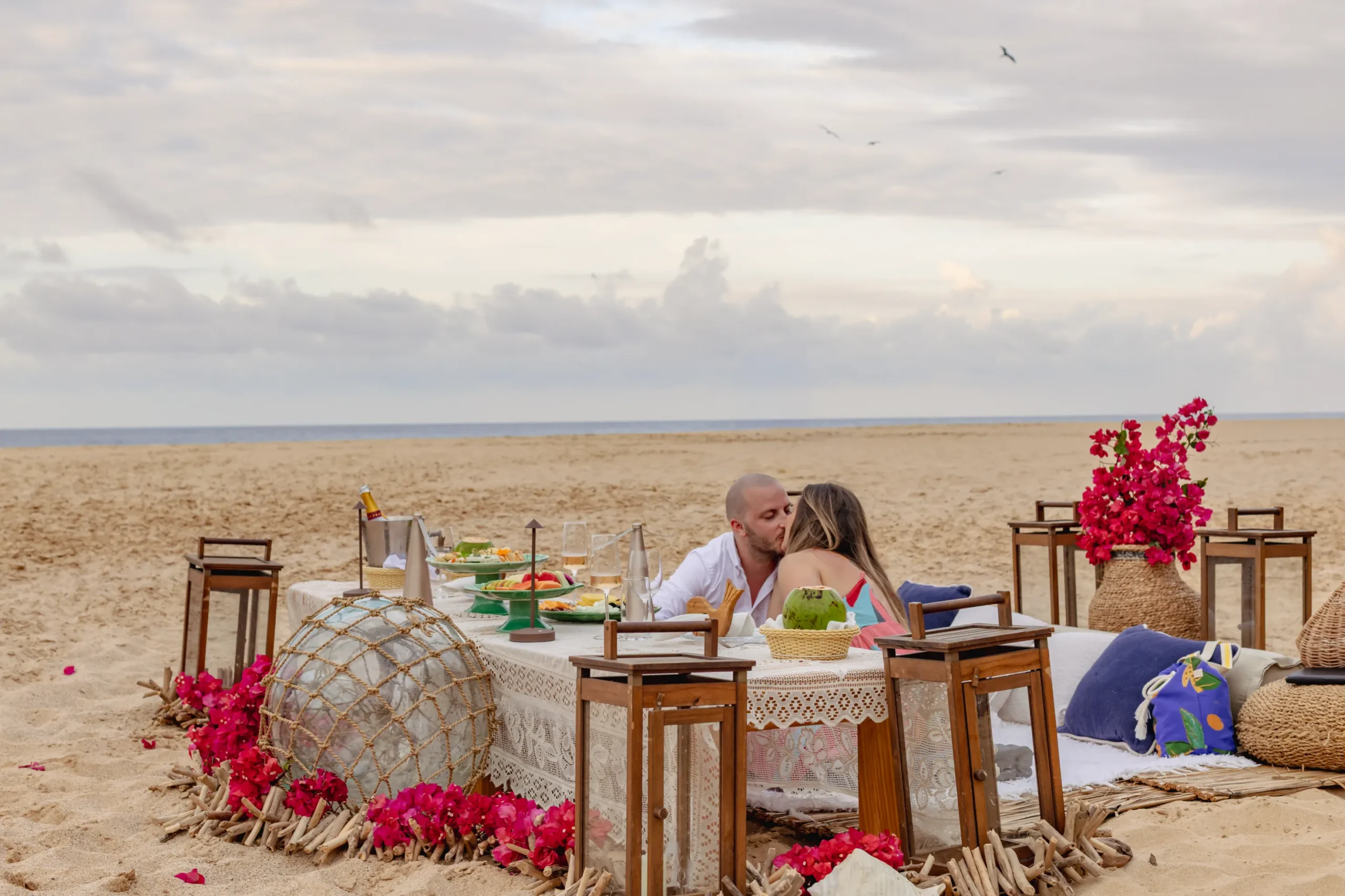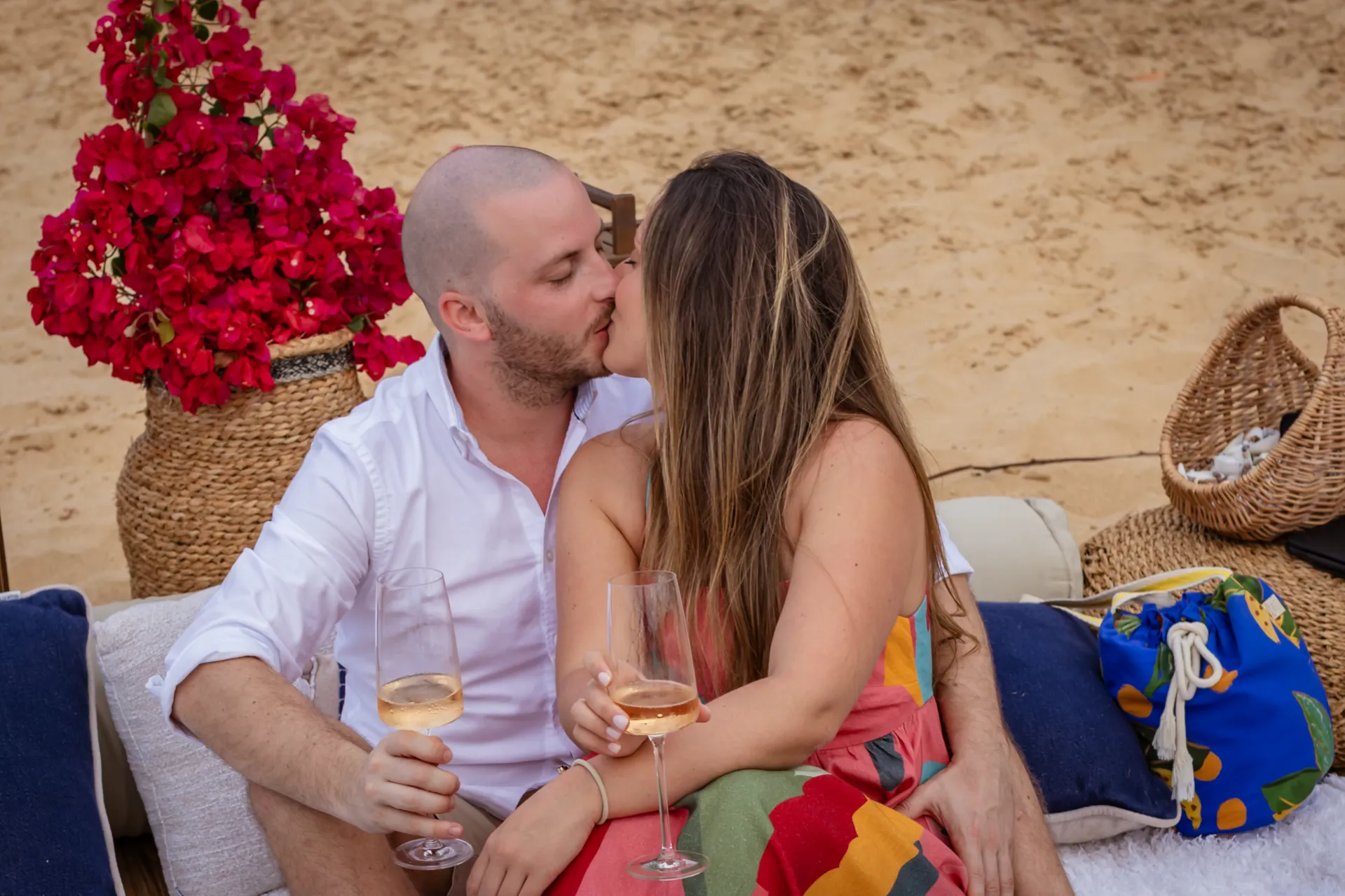 Contudo, a magia estava longe de terminar. Após a forte emoção vivida no mirante, o casal desceu em direção à areia dourada da Praia da Cacimba do Padre. Lá, uma nova surpresa aguardava a Filipa: uma mesa de piquenique luxuosa e delicadamente decorada, preparada com todo o carinho e acompanhada por espumante para celebrar a nova etapa.