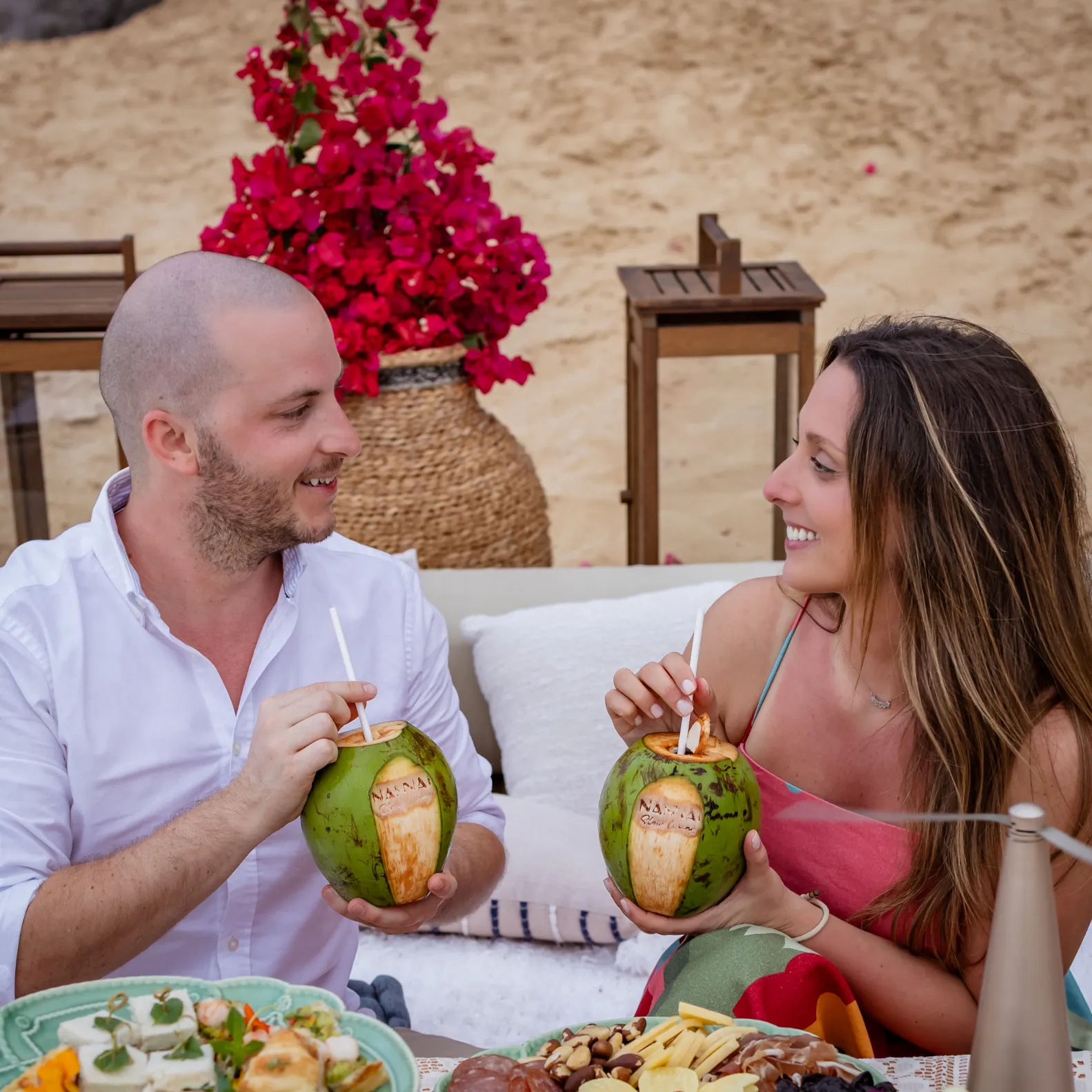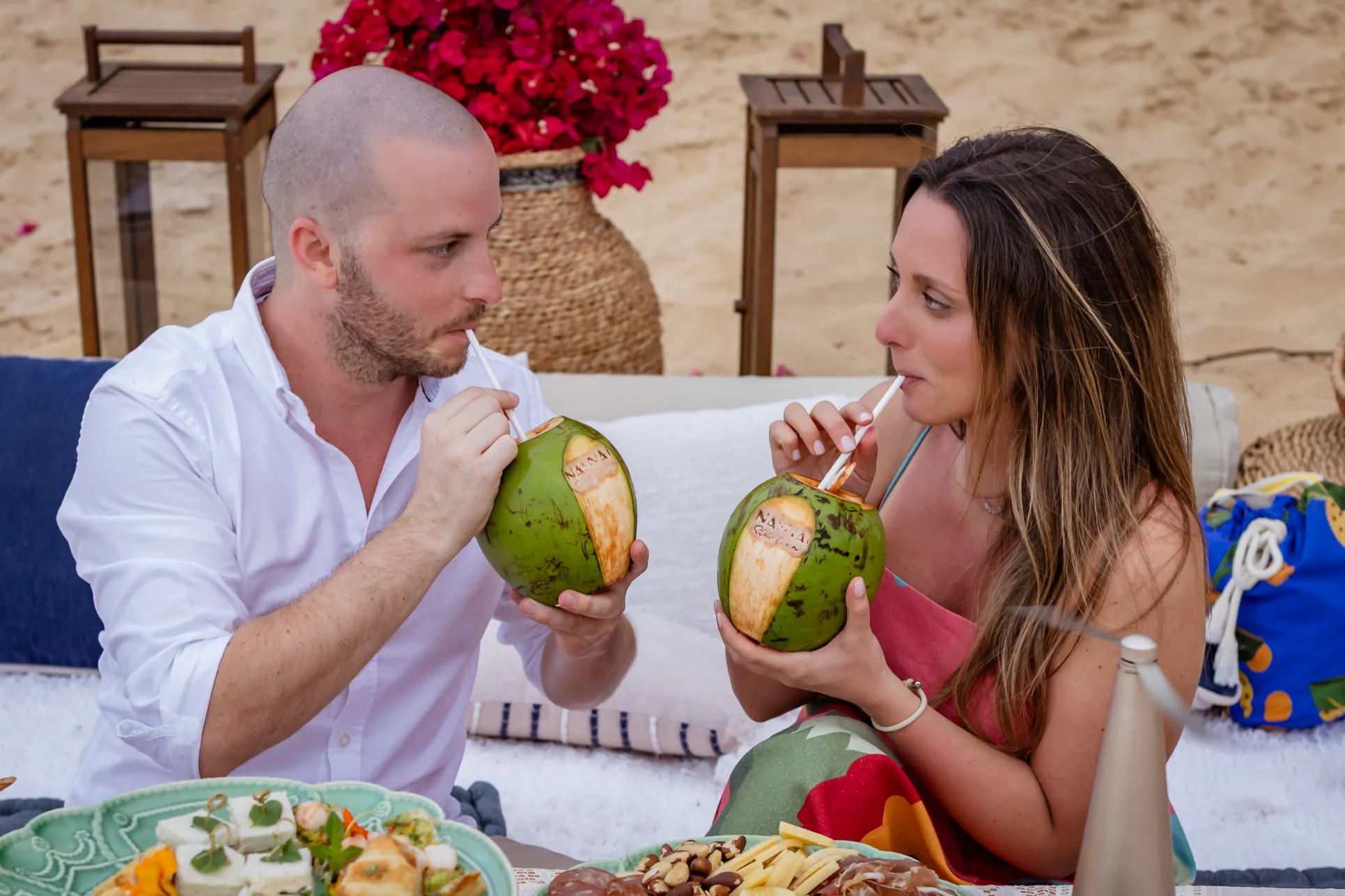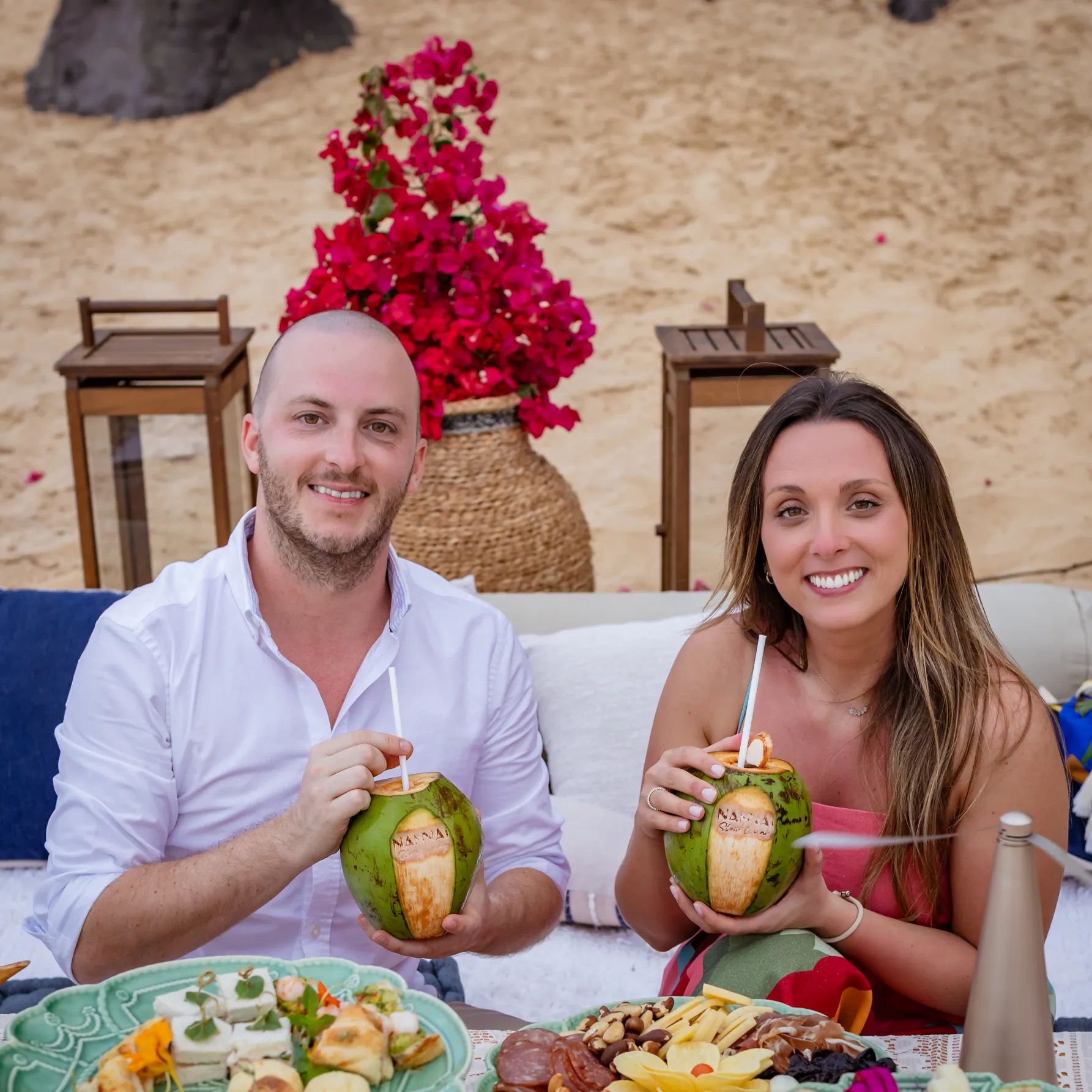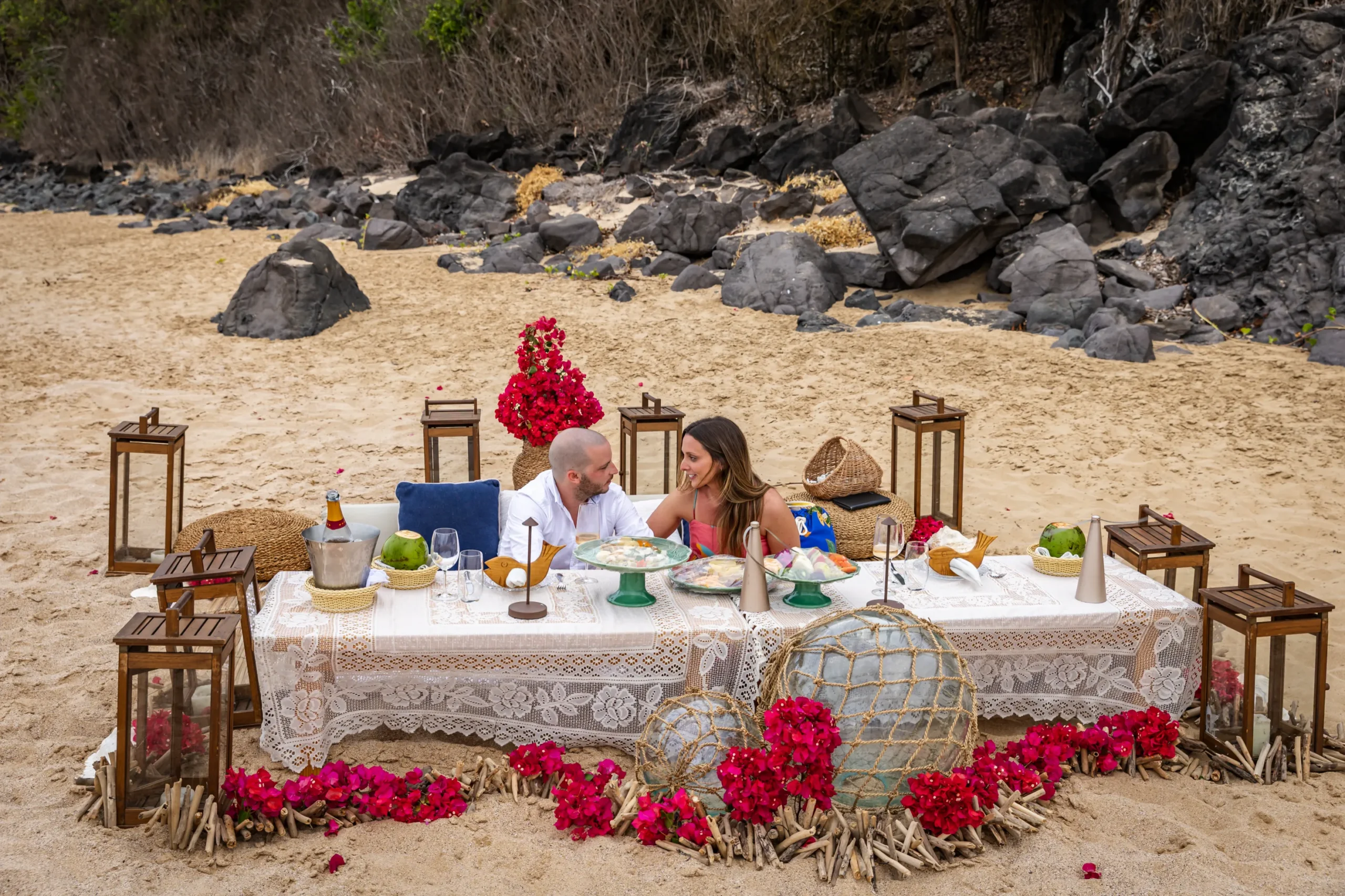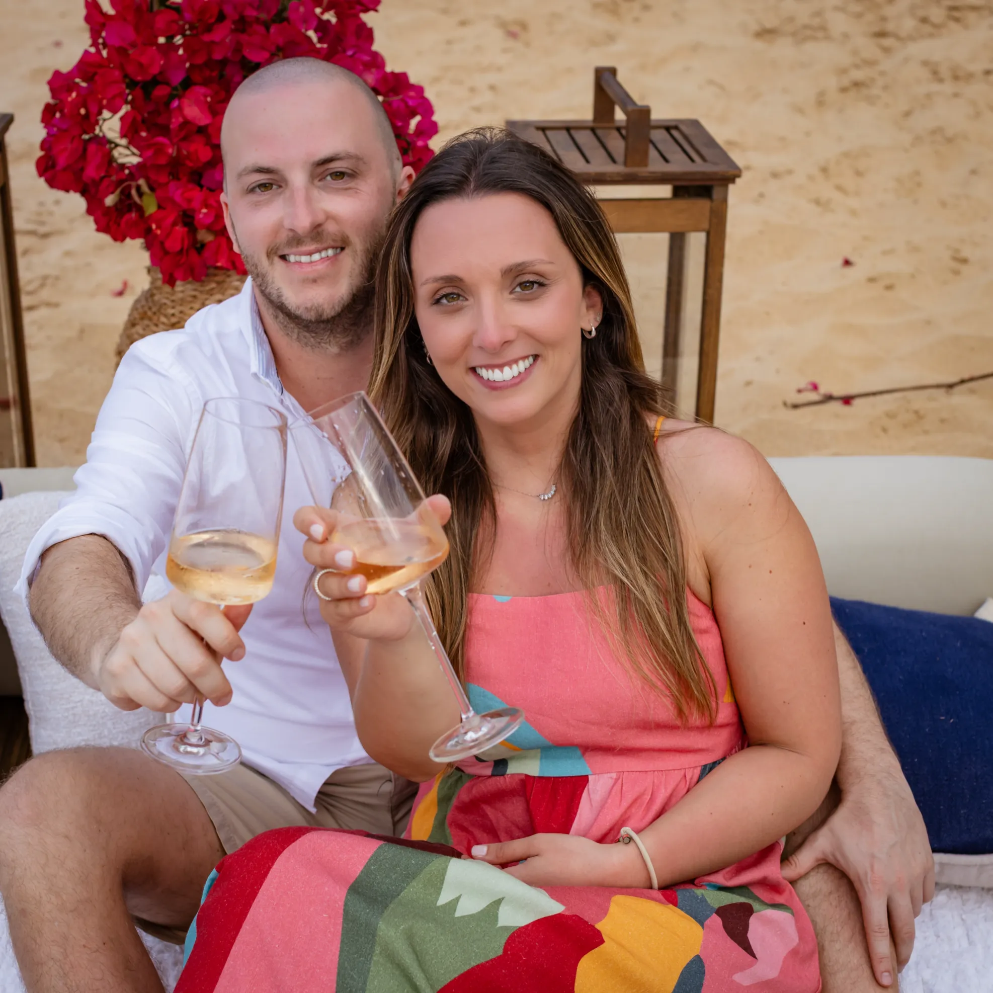 Contudo, a magia estava longe de terminar. Após a forte emoção vivida no mirante, o casal desceu em direção à areia dourada da Praia da Cacimba do Padre. Lá, uma nova surpresa aguardava a Filipa: uma mesa de piquenique luxuosa e delicadamente decorada, preparada com todo o carinho e acompanhada por espumante para celebrar a nova etapa.