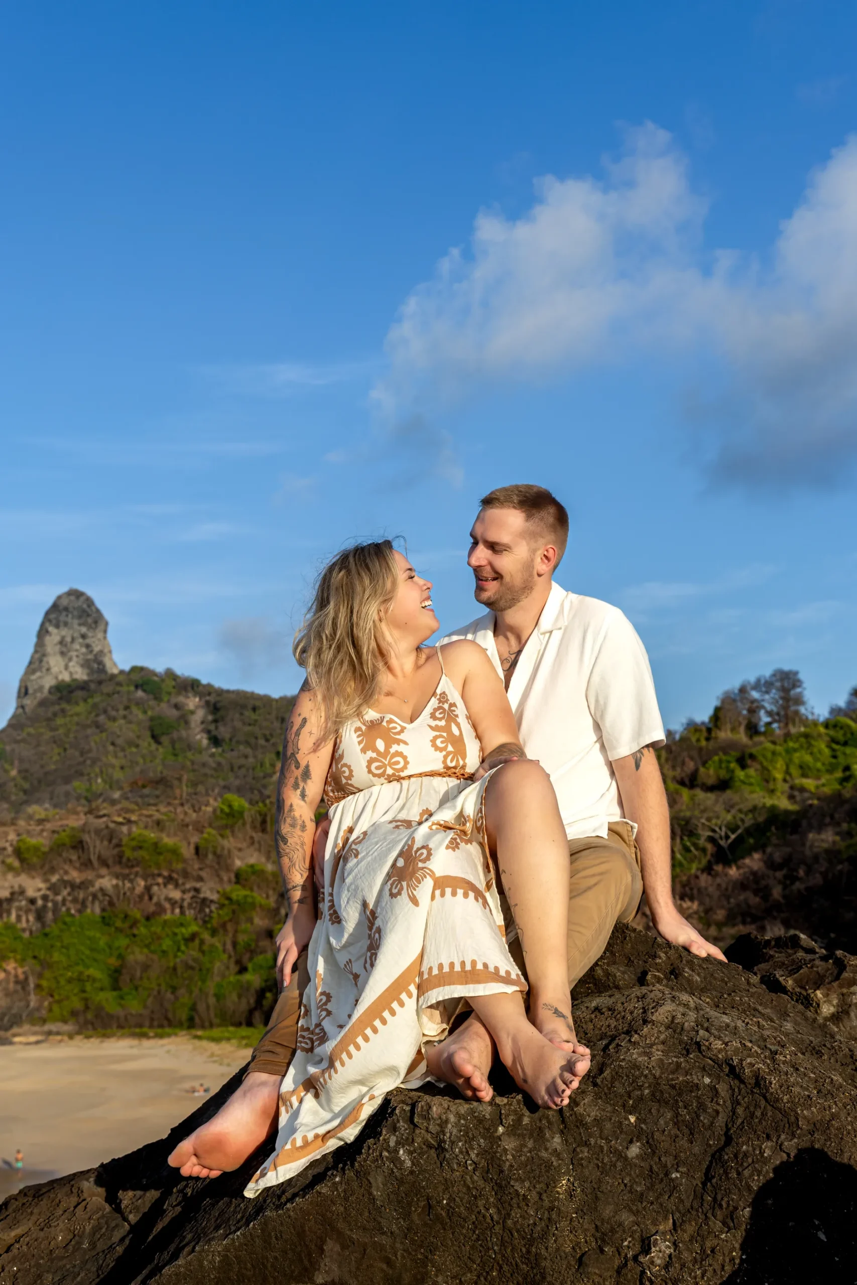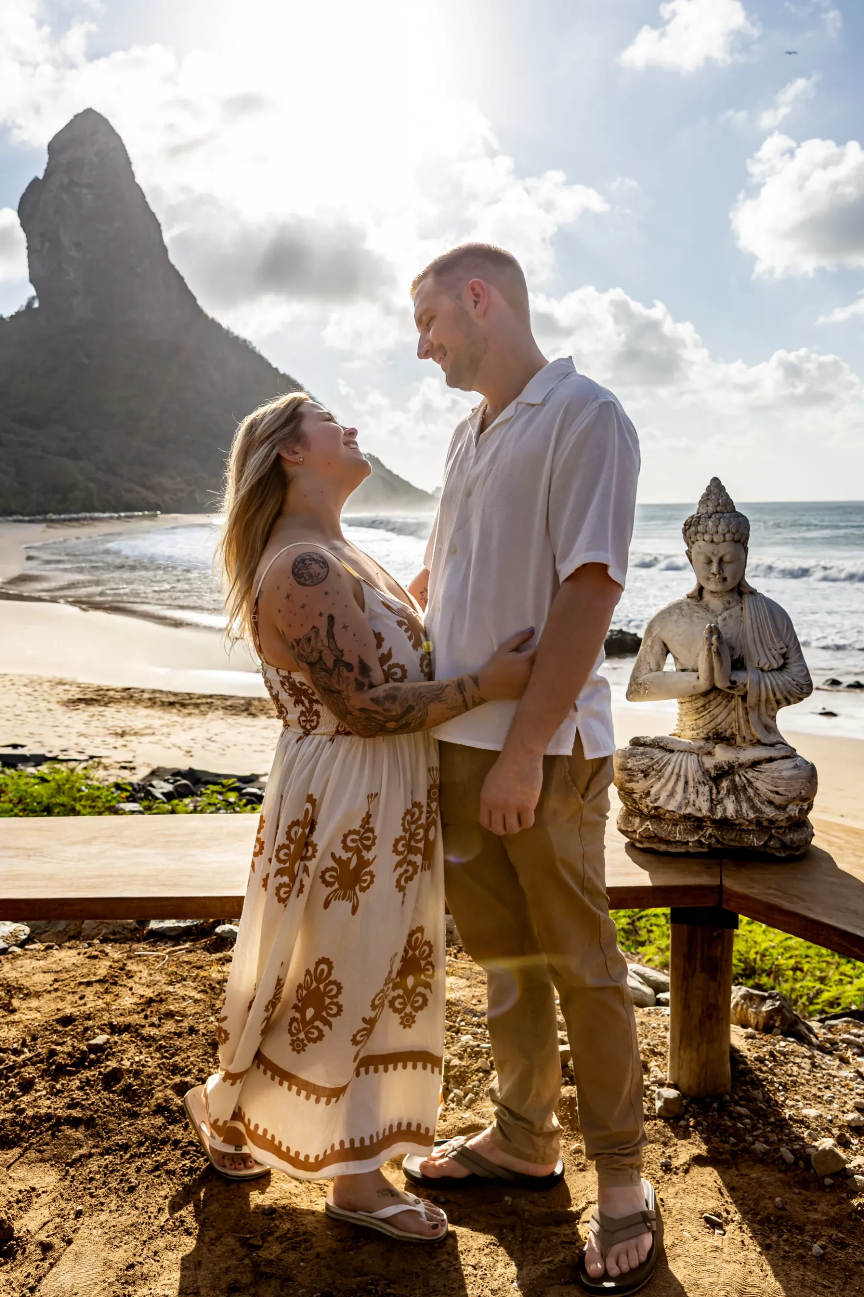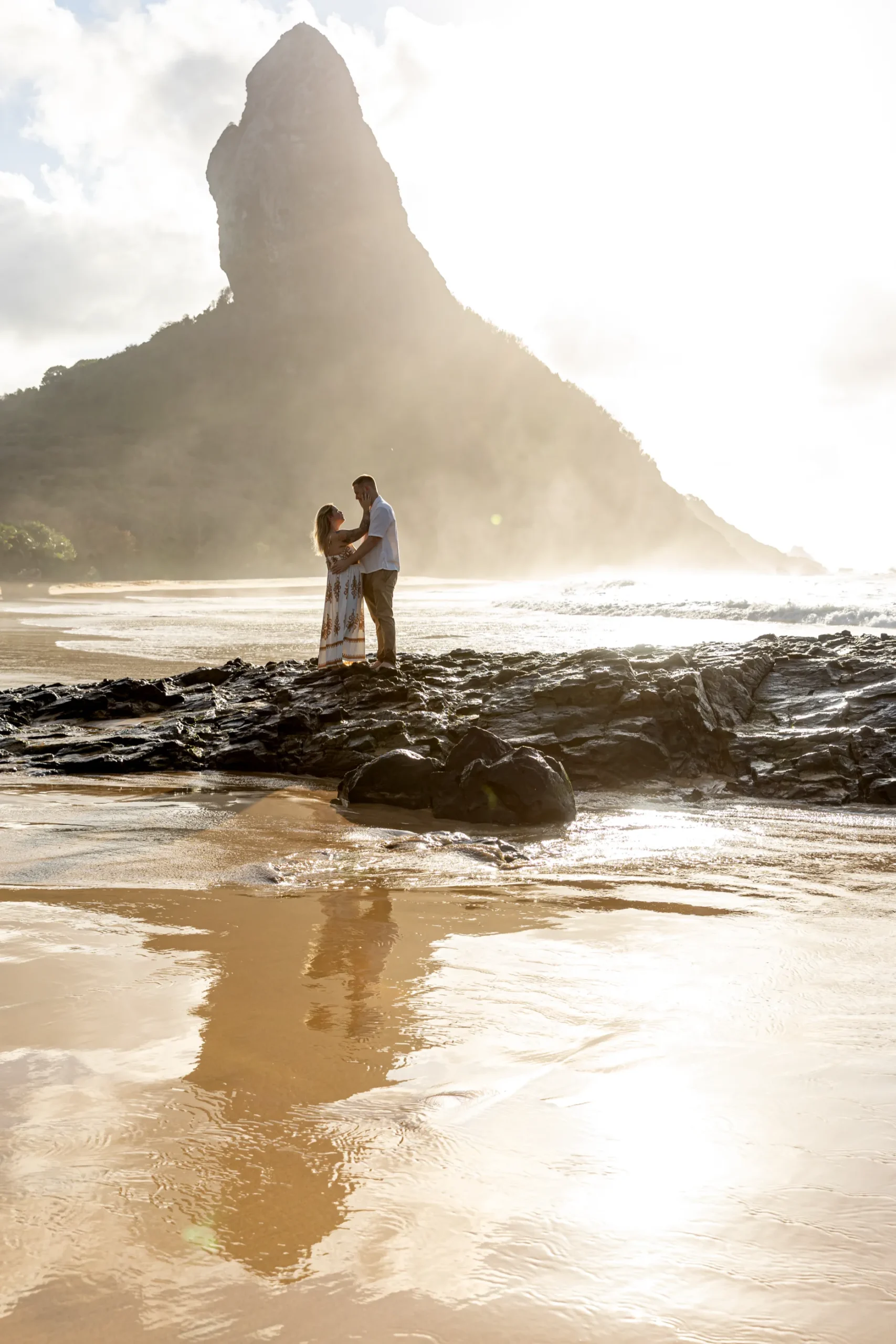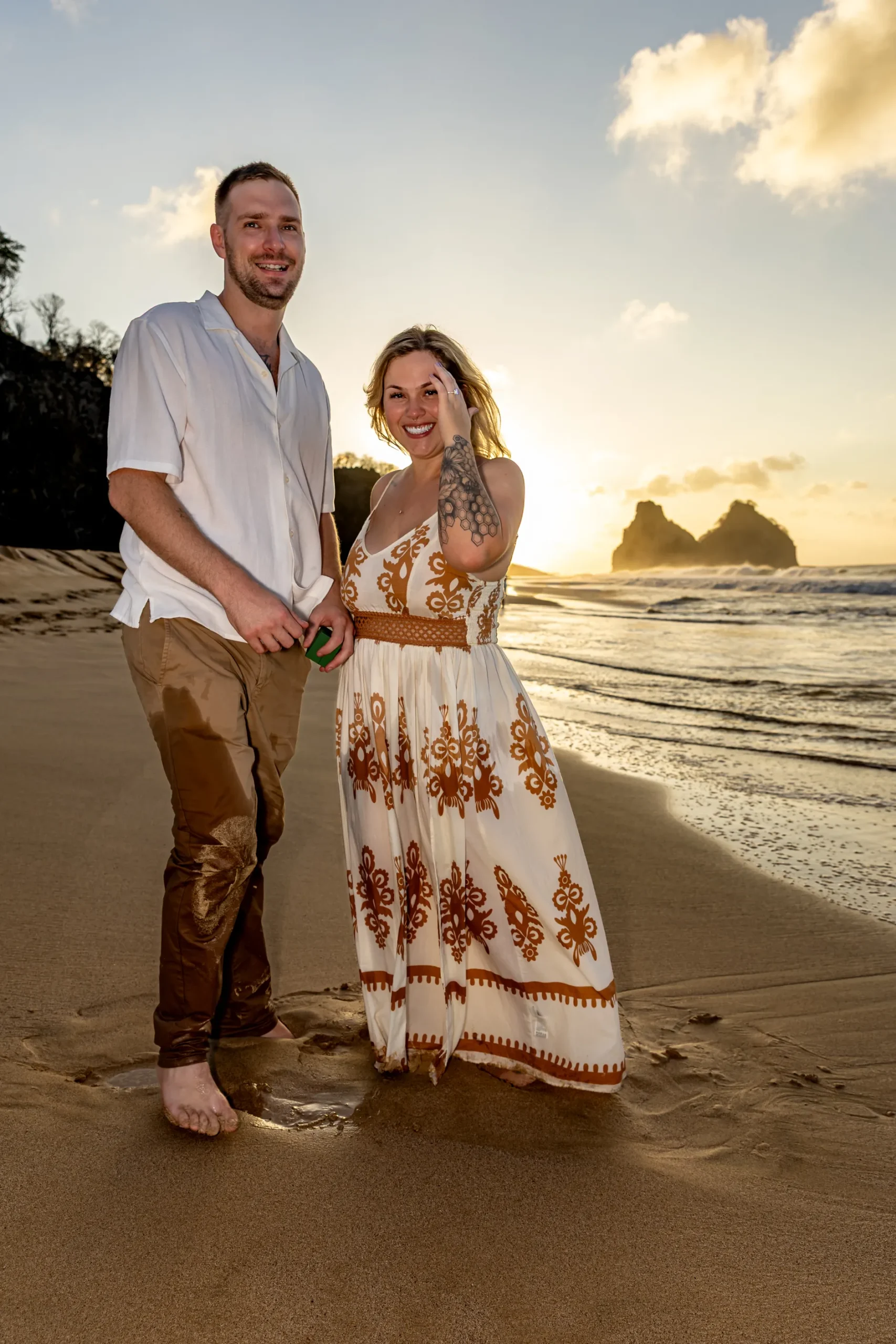 Começamos os cliques próximos ao Bar do Meio, um local que exala a vibração de Noronha. Ali, o Morro do Pico ao fundo emoldurava o sorriso dos dois, enquanto eles caminhavam pela areia. O que a Lexi ainda não sabia era que aquele ensaio “comum” era apenas o prelúdio para algo muito maior que o Brett vinha planejando com carinho.