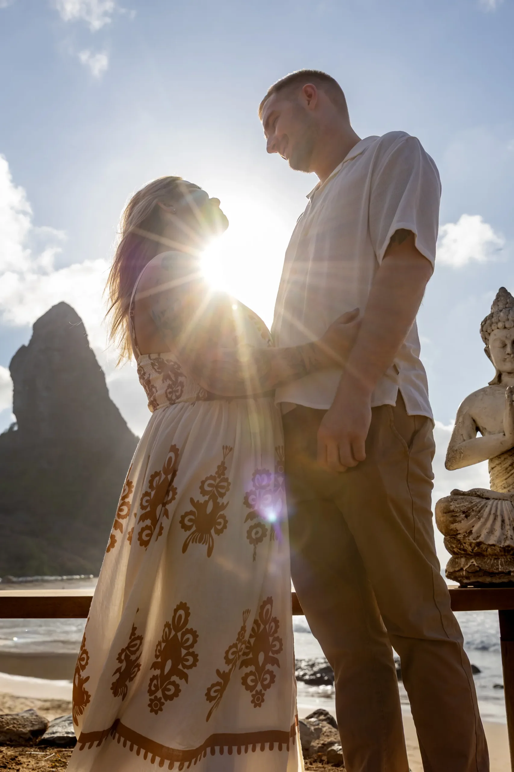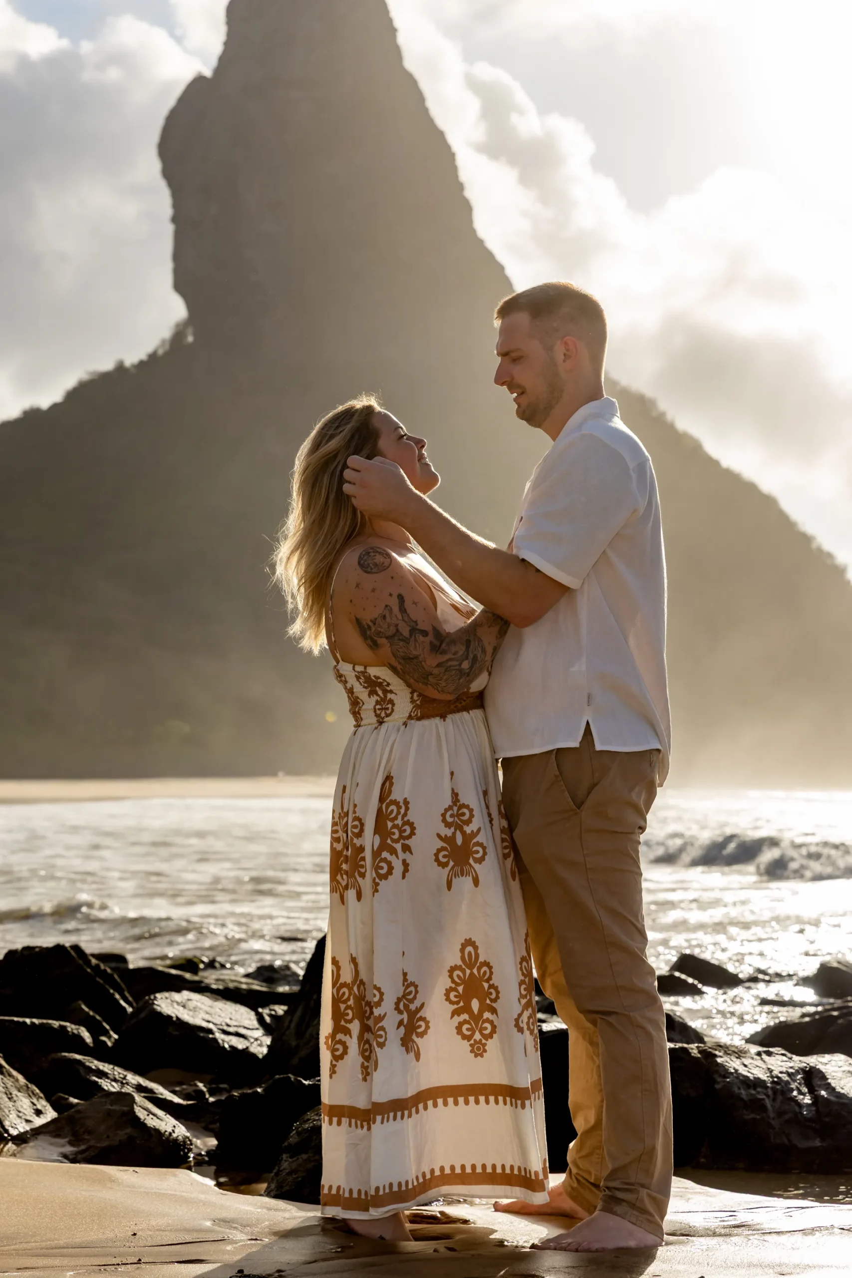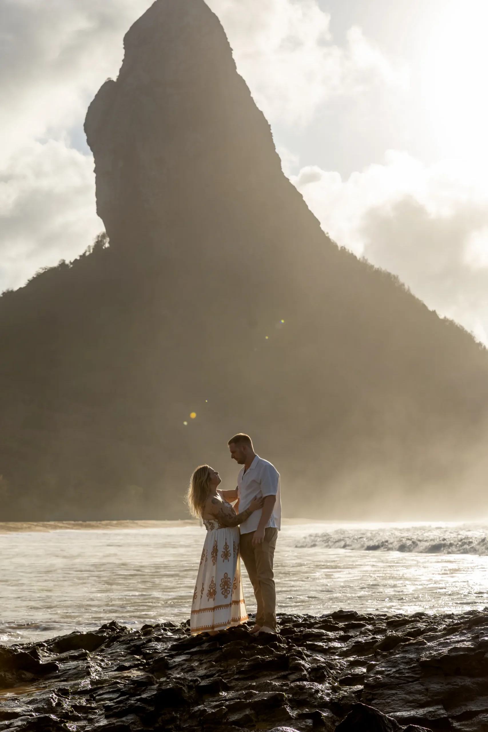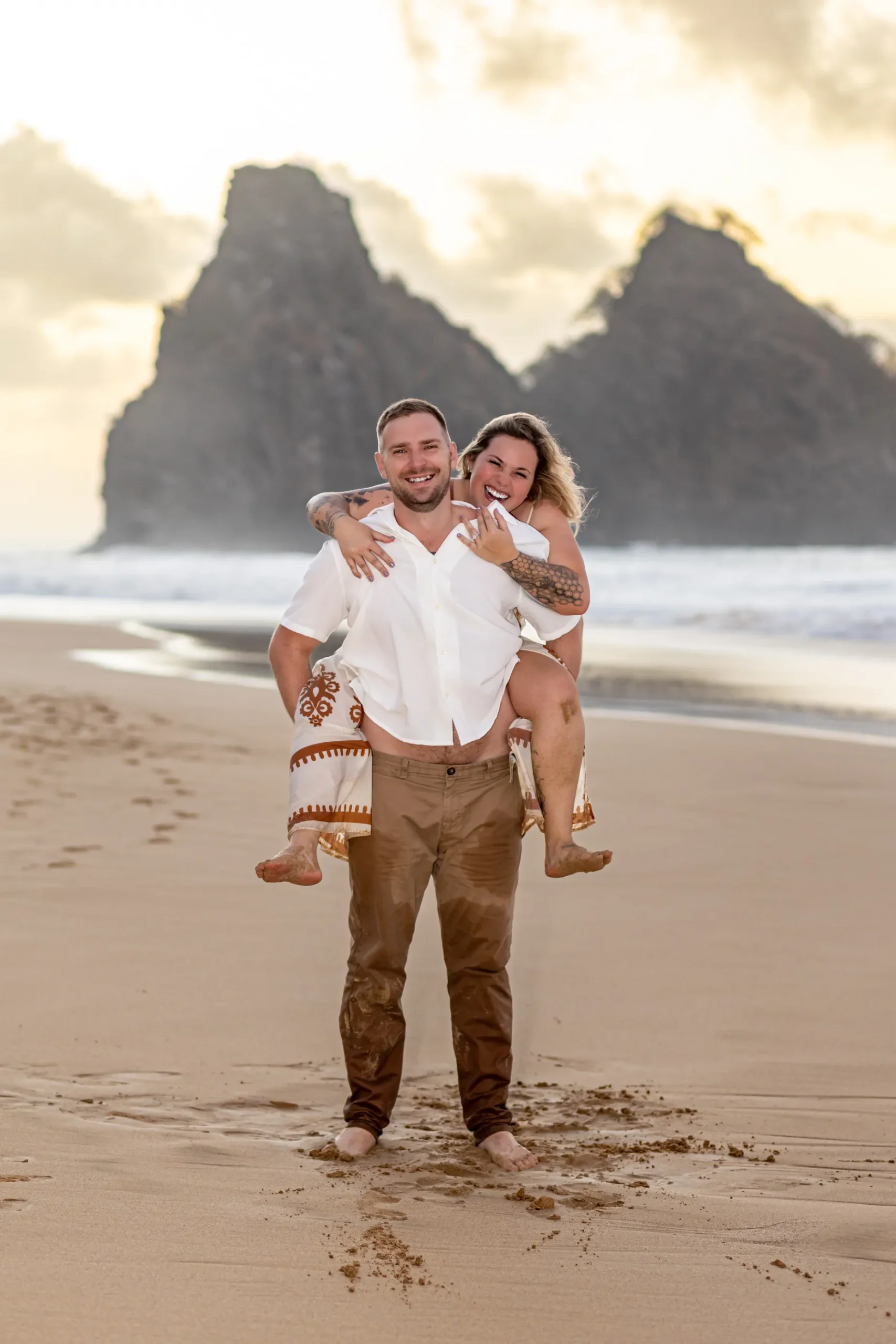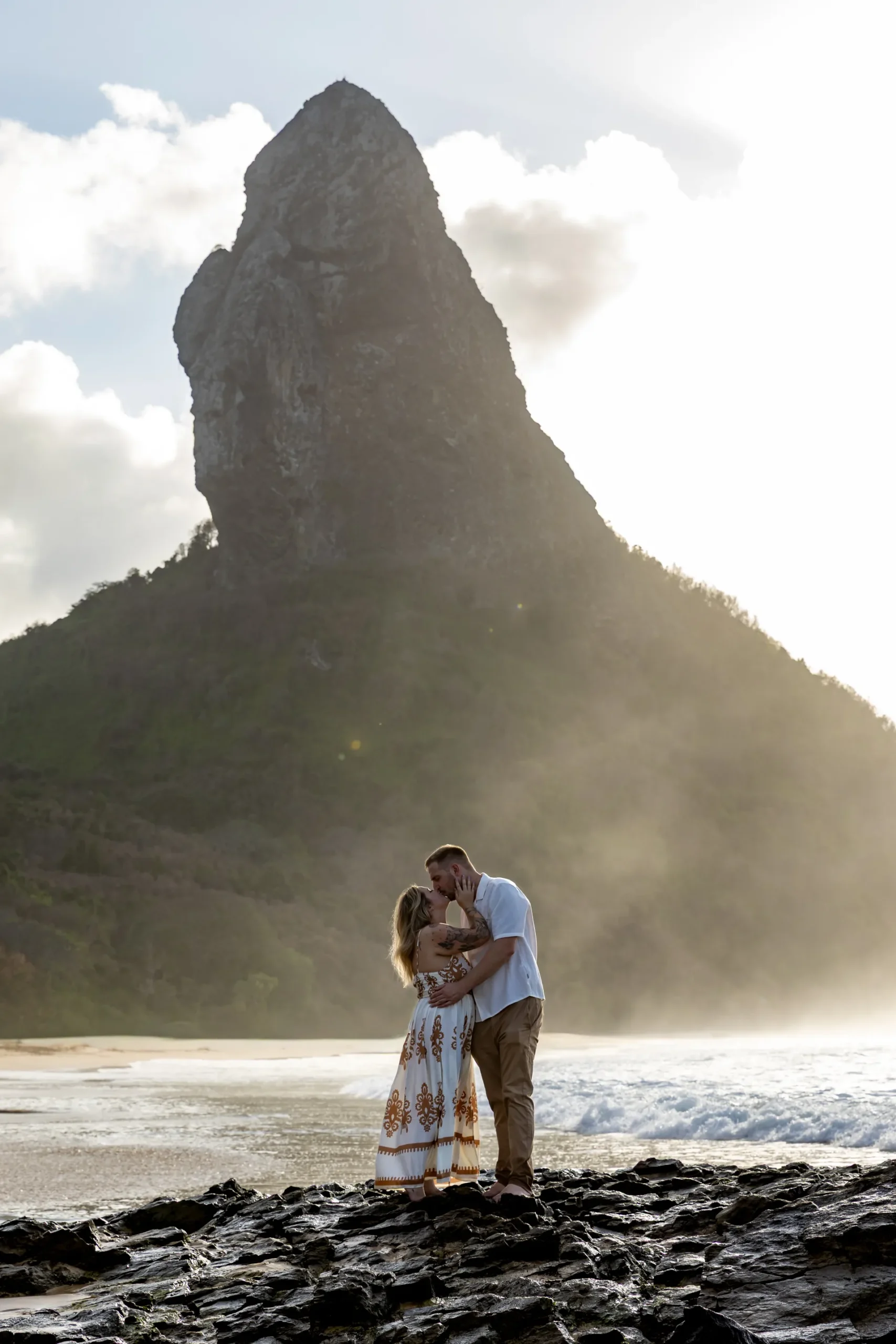 Começamos os cliques próximos ao Bar do Meio, um local que exala a vibração de Noronha. Ali, o Morro do Pico ao fundo emoldurava o sorriso dos dois, enquanto eles caminhavam pela areia. O que a Lexi ainda não sabia era que aquele ensaio “comum” era apenas o prelúdio para algo muito maior que o Brett vinha planejando com carinho.