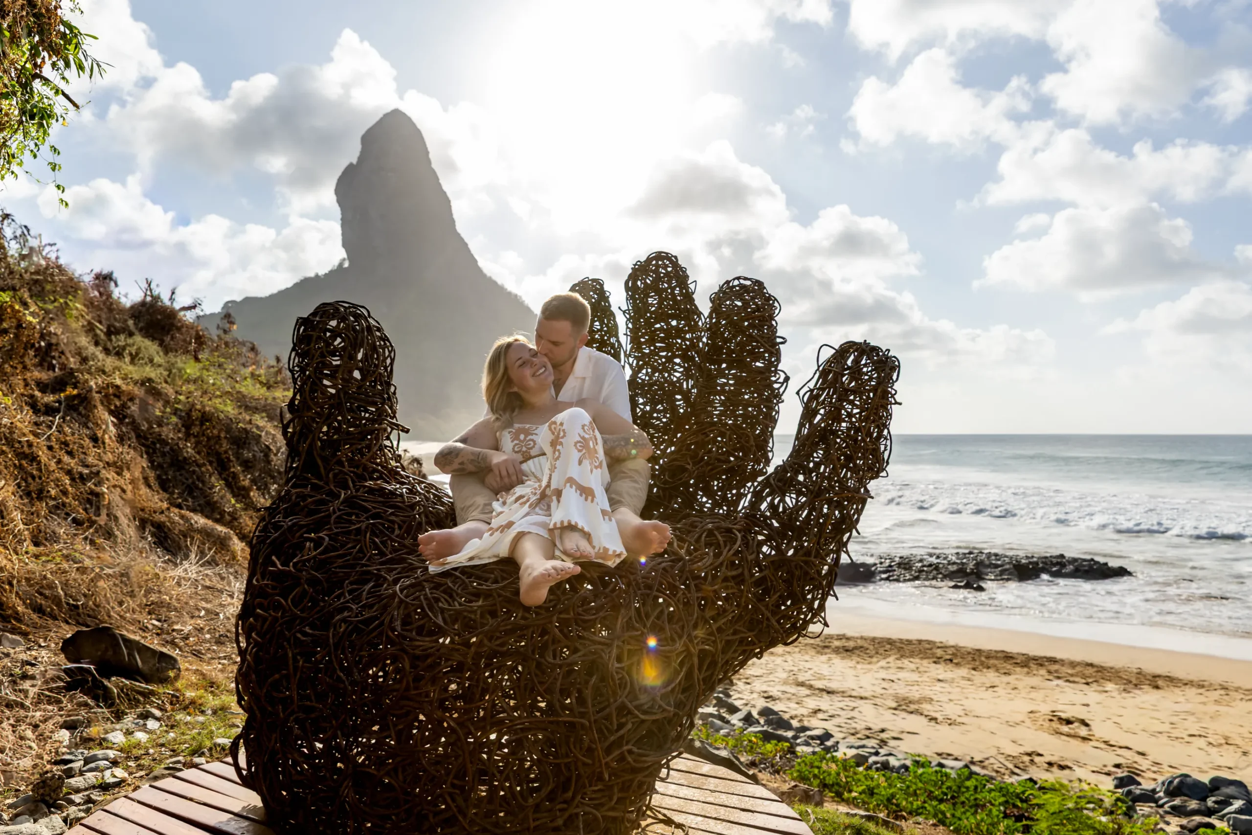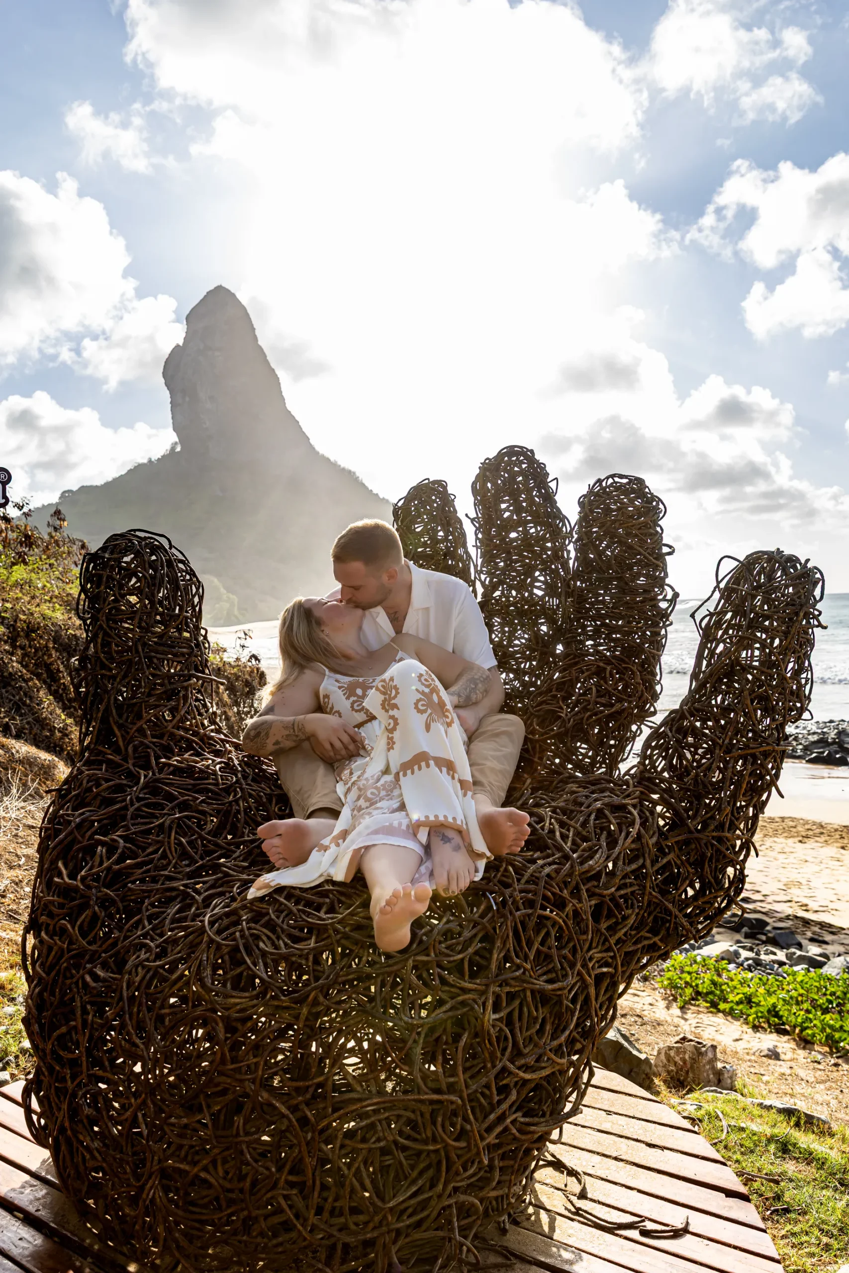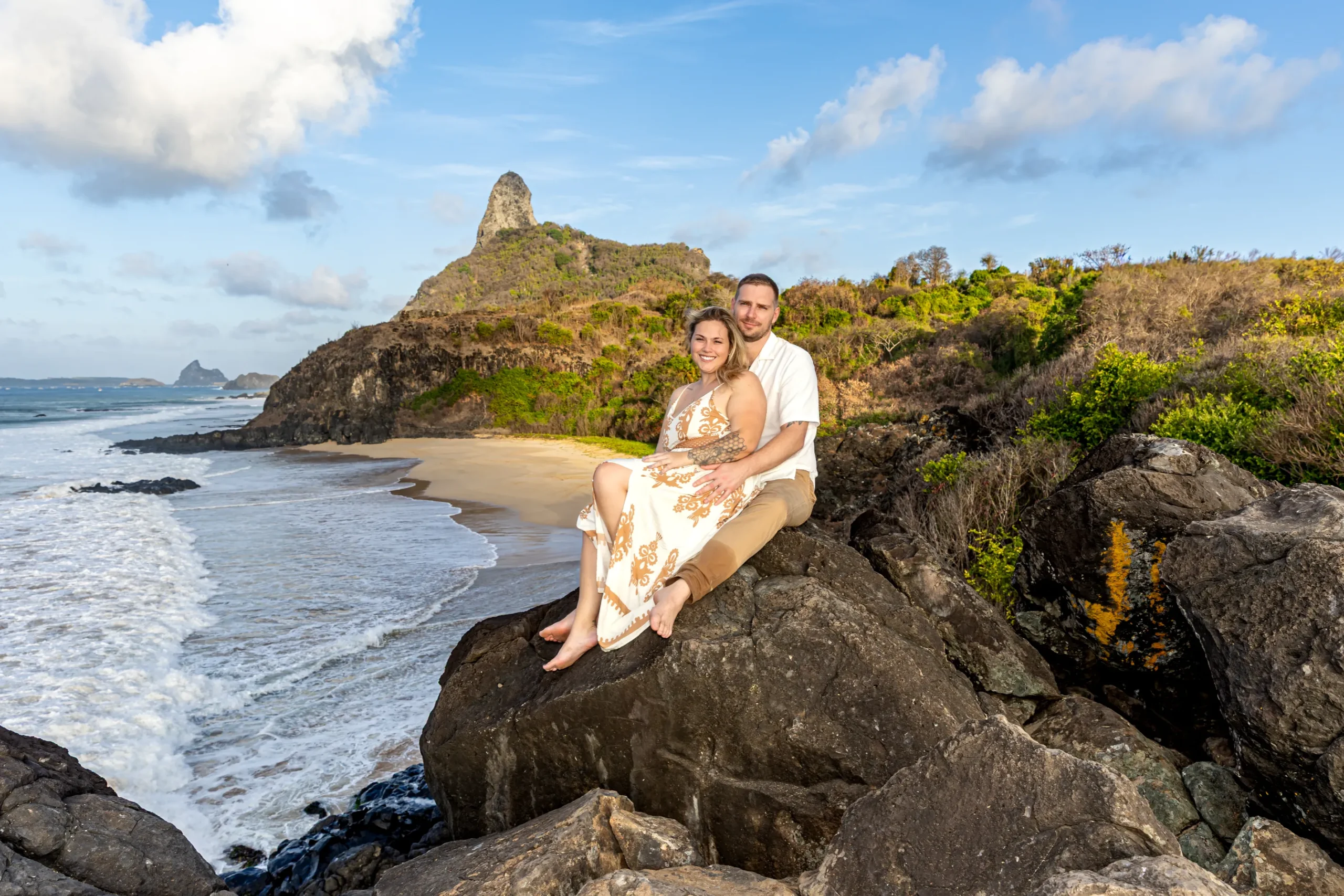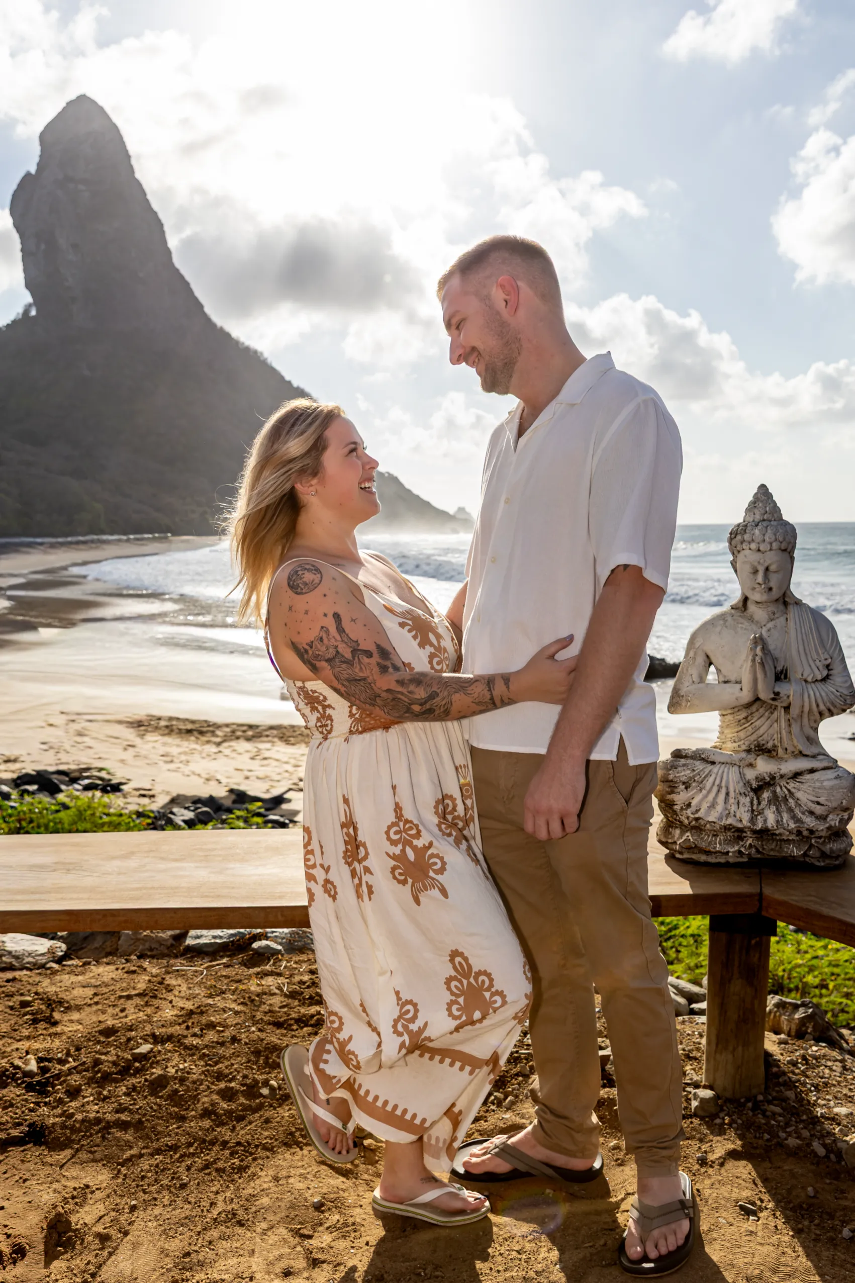 Começamos os cliques próximos ao Bar do Meio, um local que exala a vibração de Noronha. Ali, o Morro do Pico ao fundo emoldurava o sorriso dos dois, enquanto eles caminhavam pela areia. O que a Lexi ainda não sabia era que aquele ensaio “comum” era apenas o prelúdio para algo muito maior que o Brett vinha planejando com carinho.