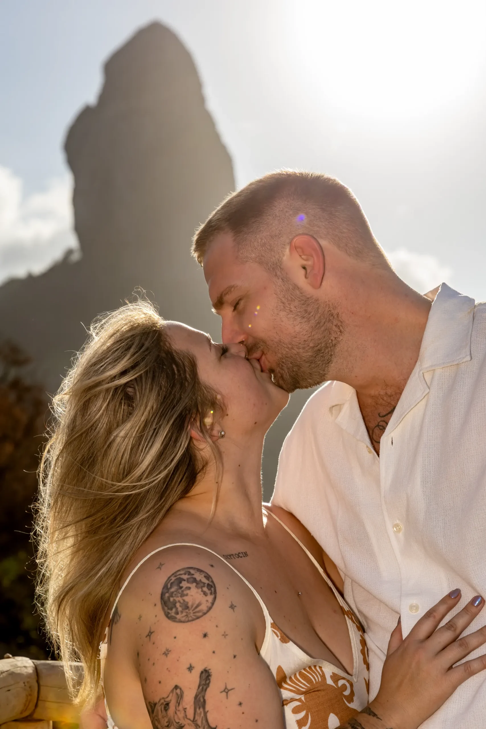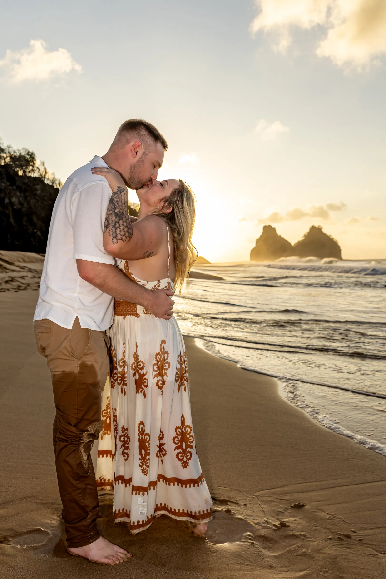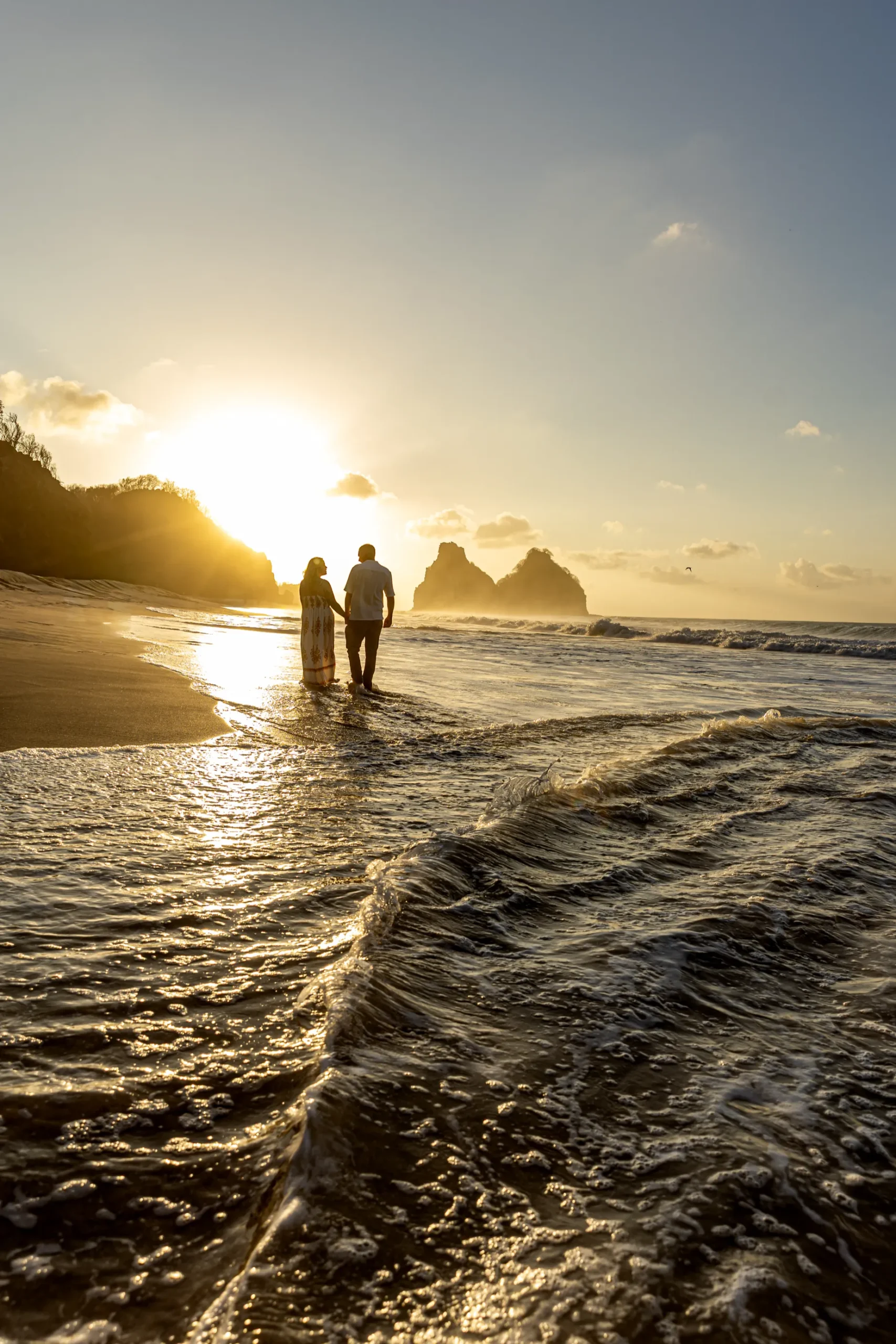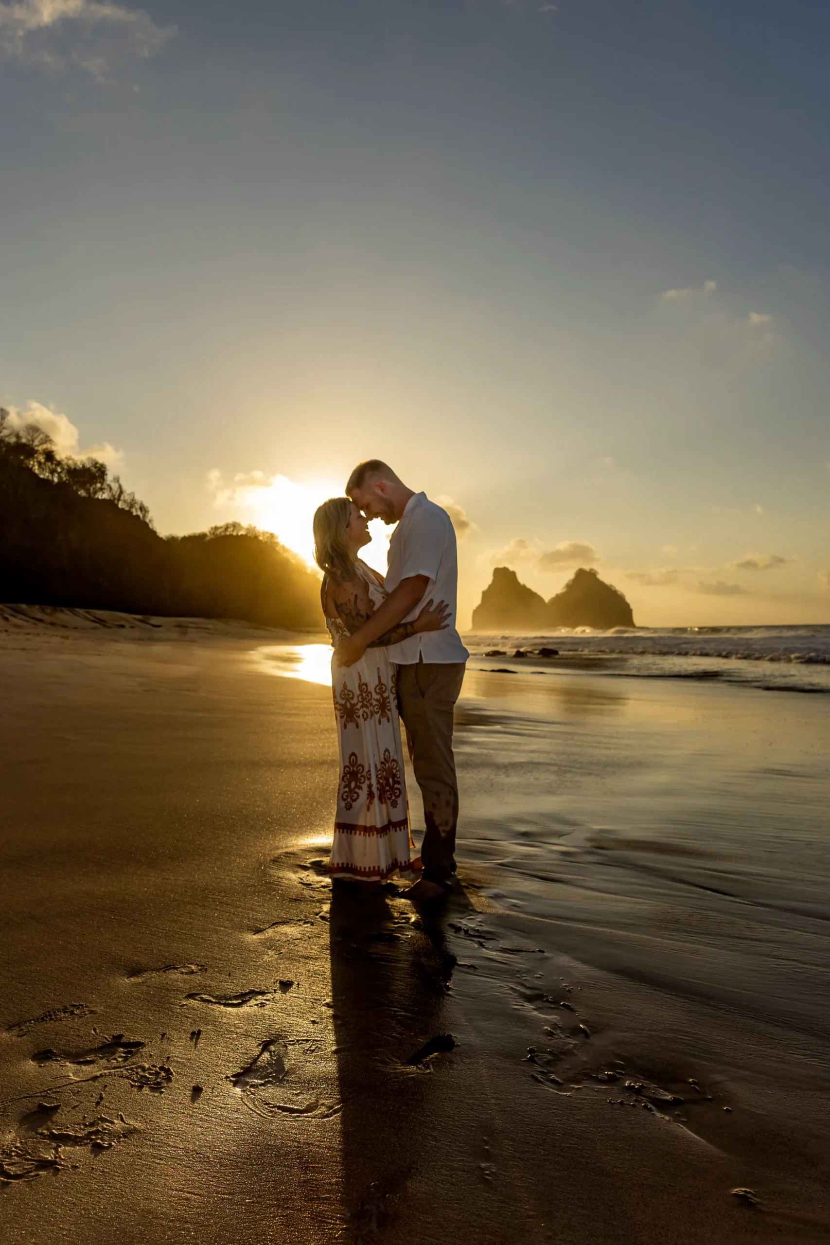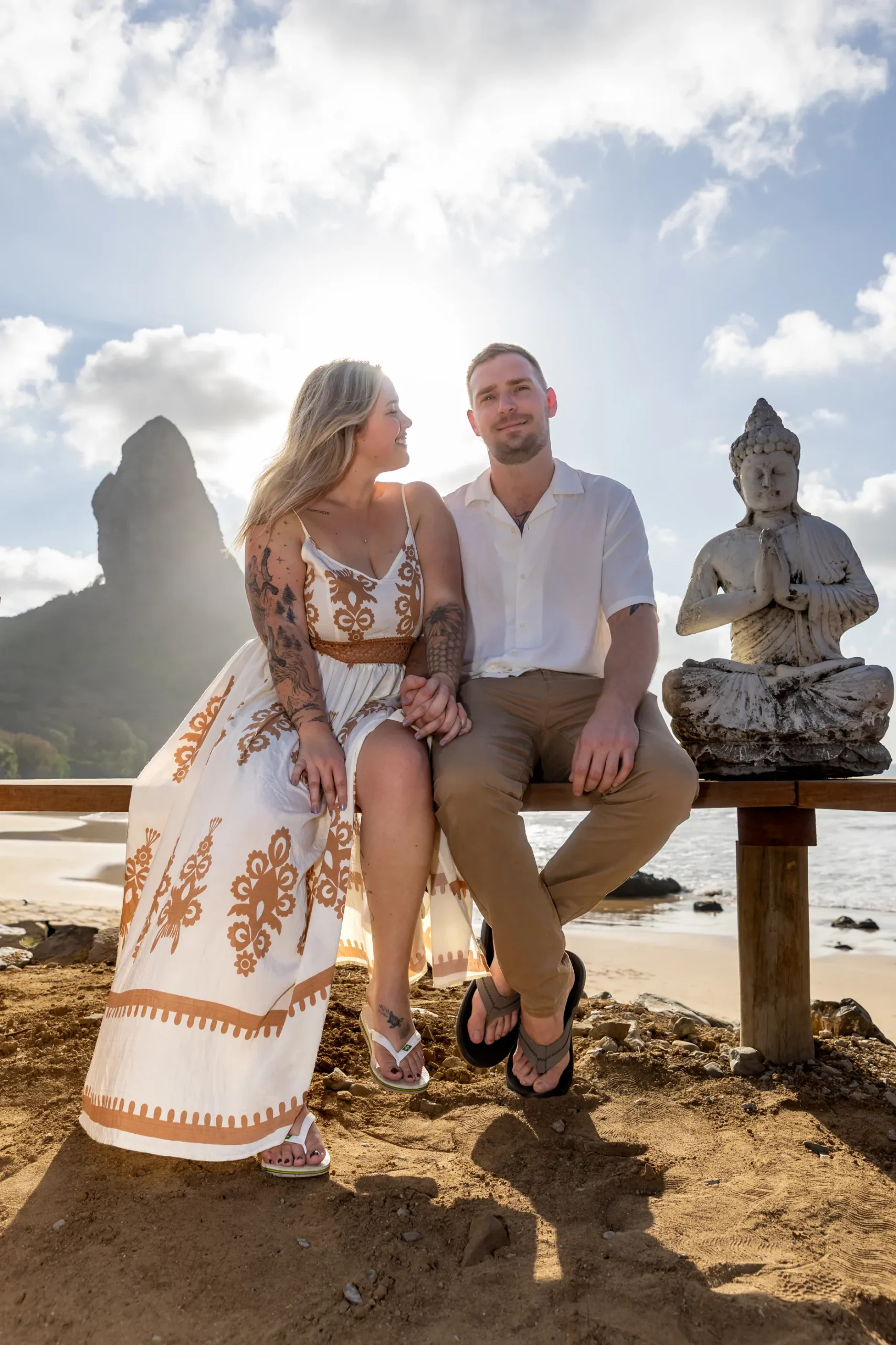 Começamos os cliques próximos ao Bar do Meio, um local que exala a vibração de Noronha. Ali, o Morro do Pico ao fundo emoldurava o sorriso dos dois, enquanto eles caminhavam pela areia. O que a Lexi ainda não sabia era que aquele ensaio “comum” era apenas o prelúdio para algo muito maior que o Brett vinha planejando com carinho.
