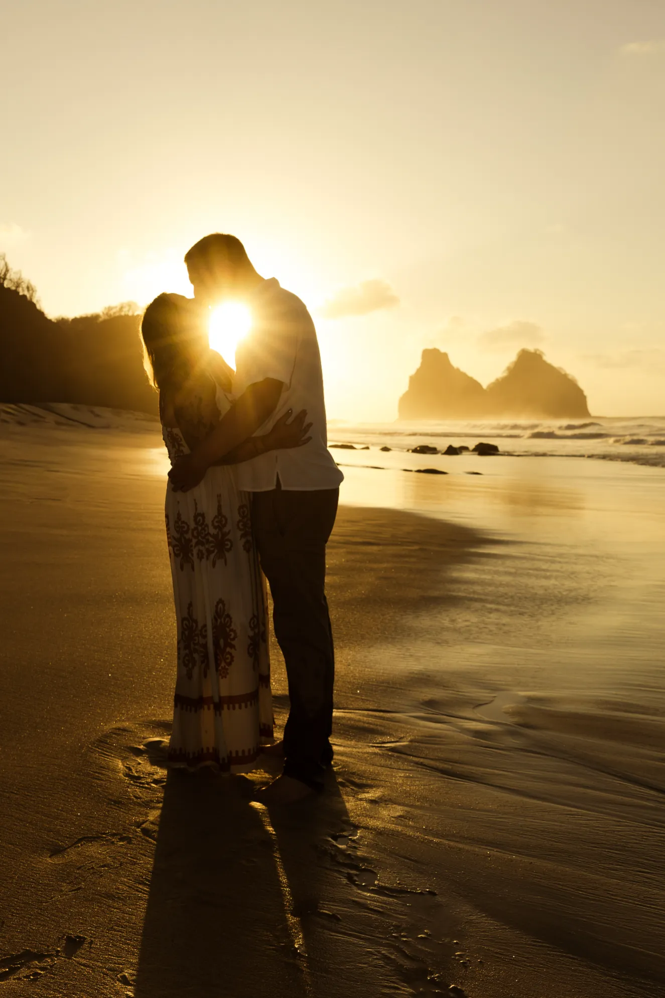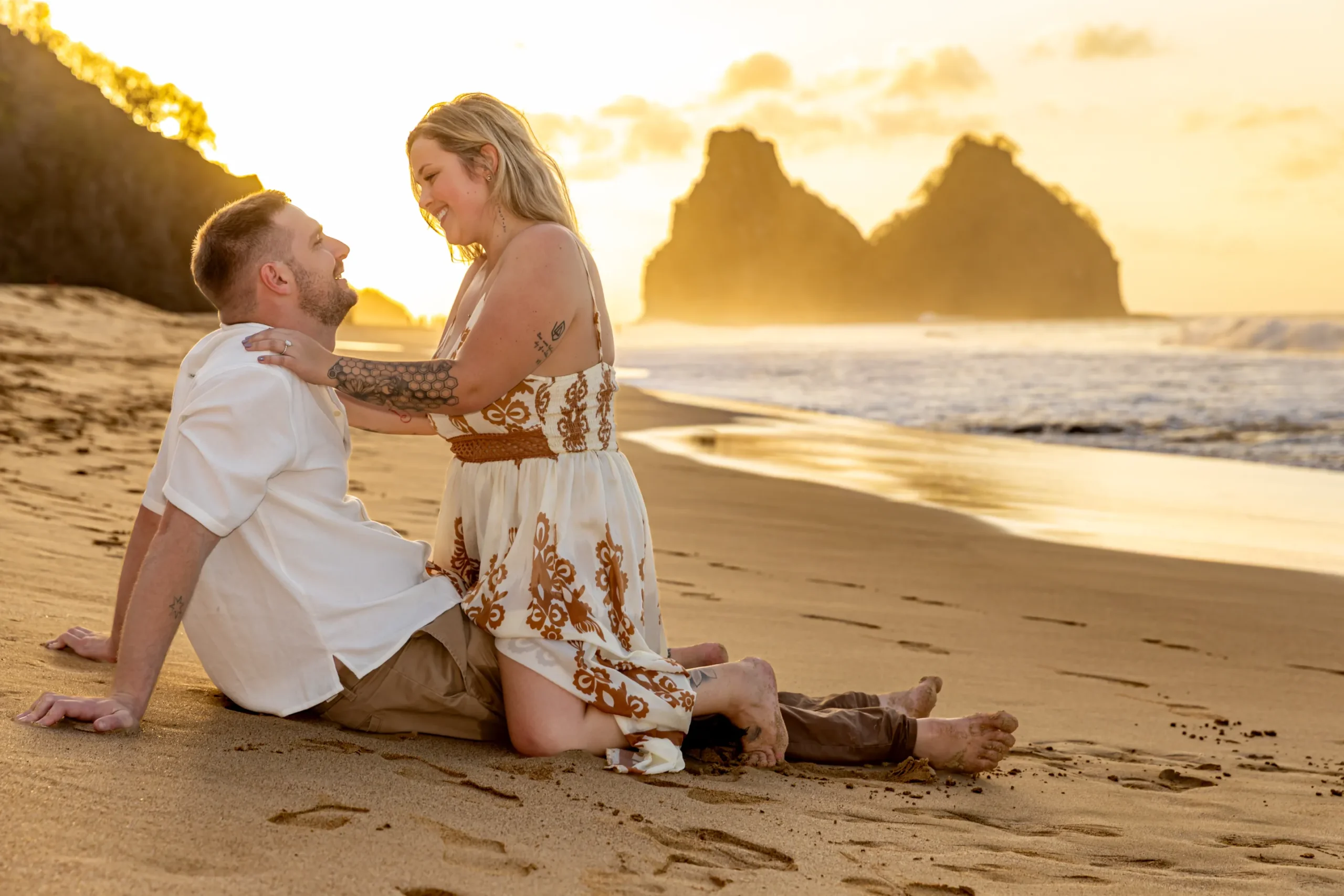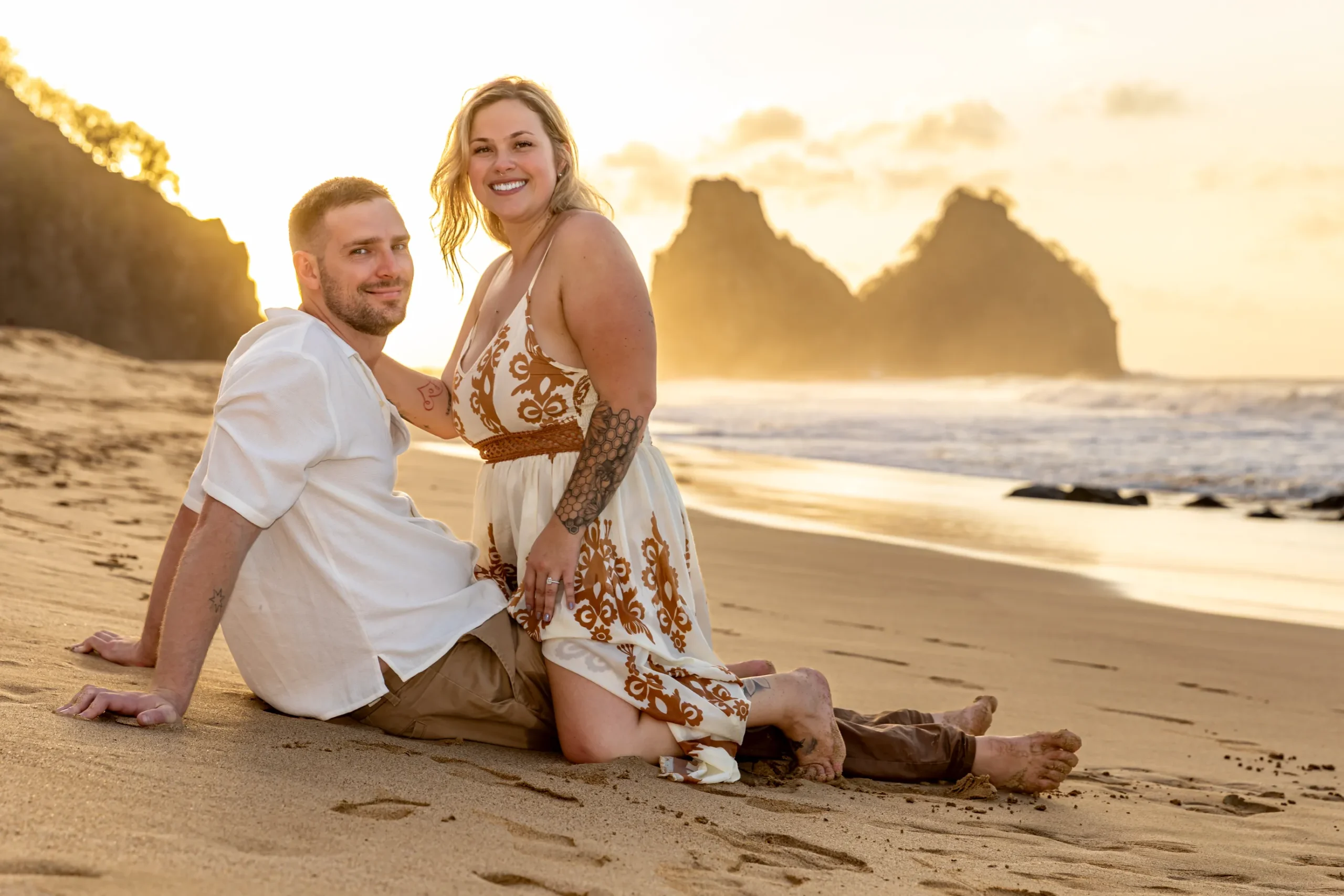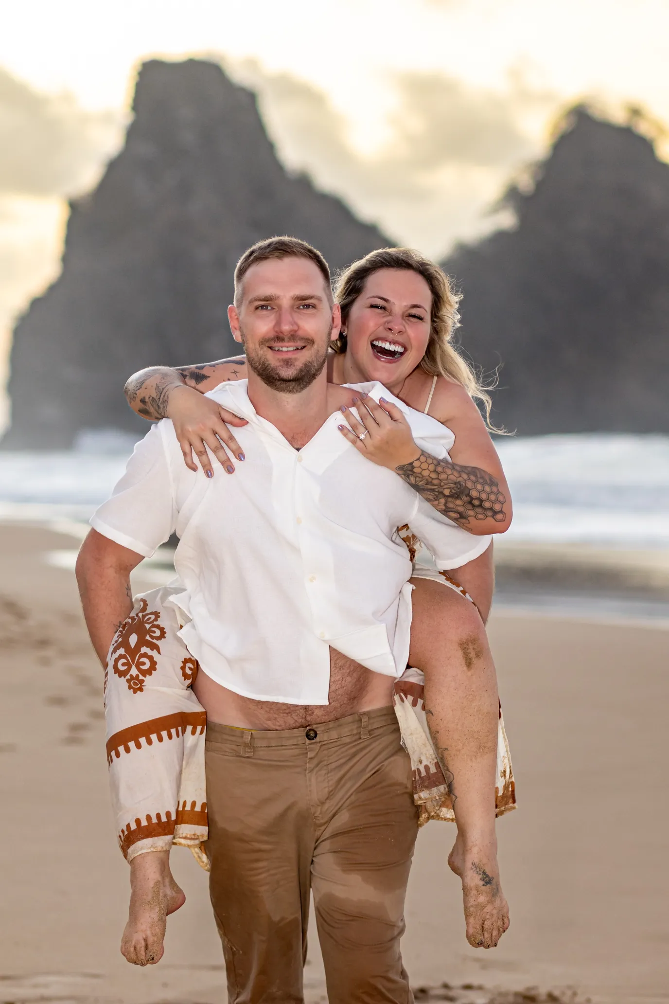 Começamos os cliques próximos ao Bar do Meio, um local que exala a vibração de Noronha. Ali, o Morro do Pico ao fundo emoldurava o sorriso dos dois, enquanto eles caminhavam pela areia. O que a Lexi ainda não sabia era que aquele ensaio “comum” era apenas o prelúdio para algo muito maior que o Brett vinha planejando com carinho.