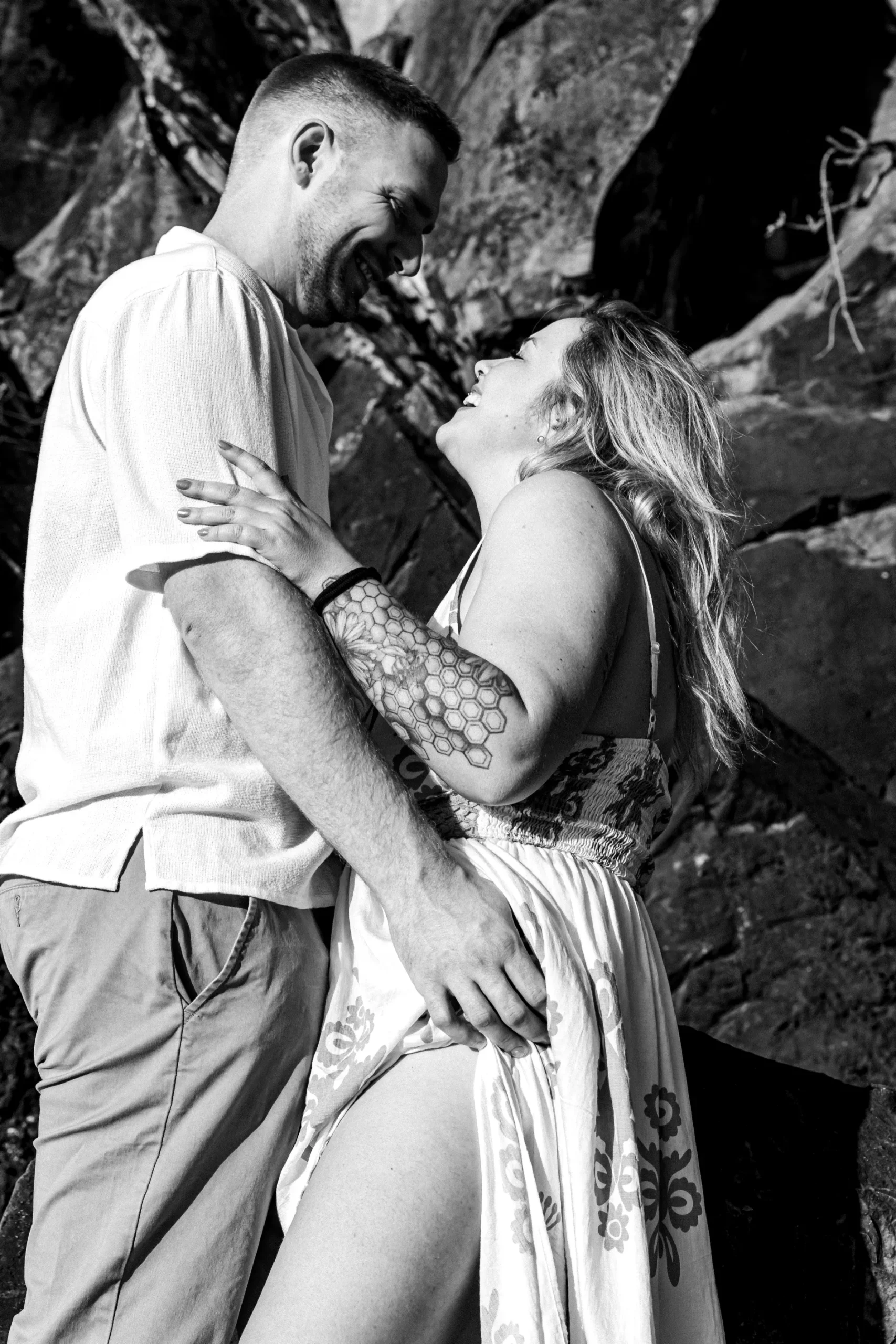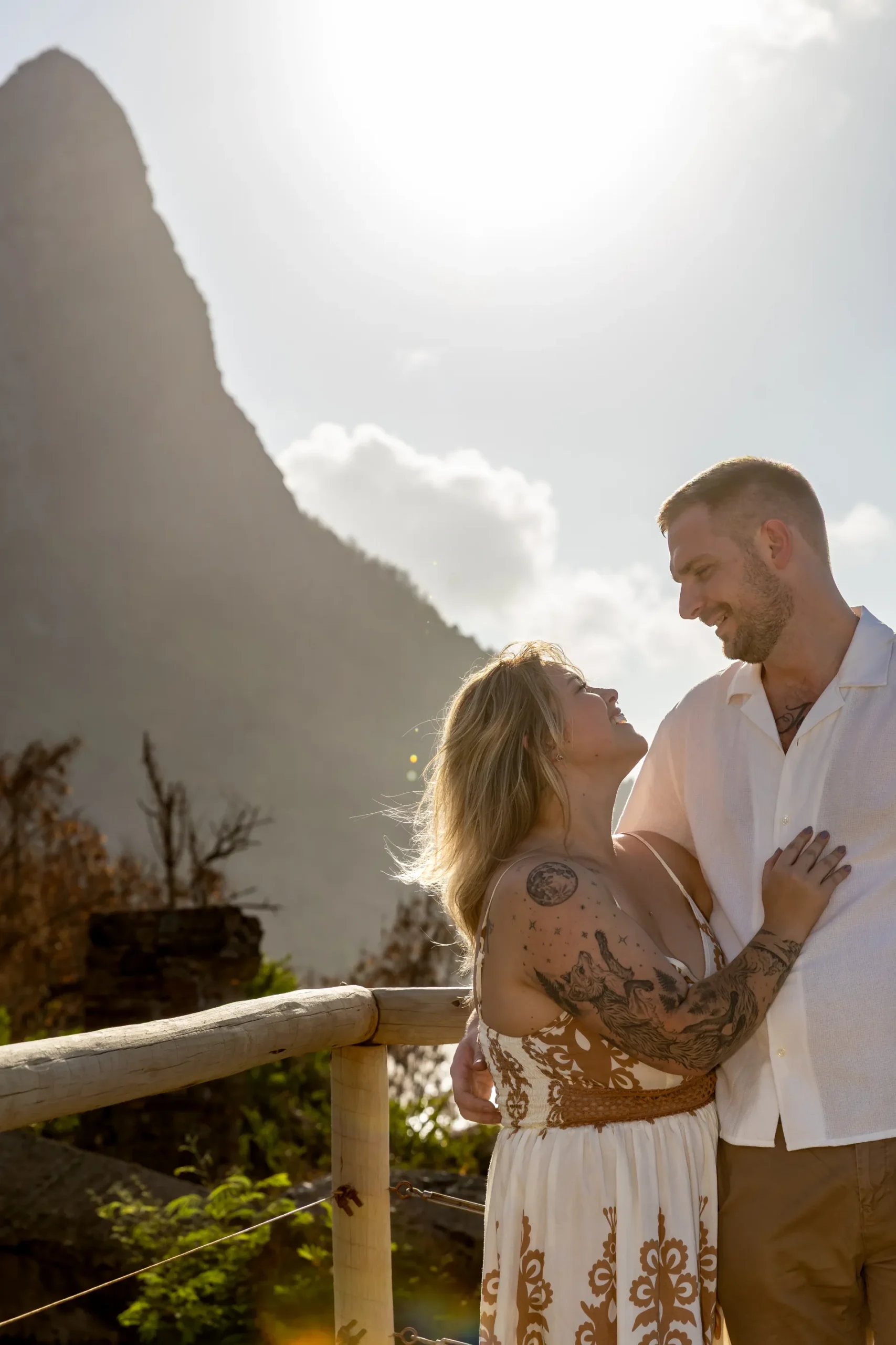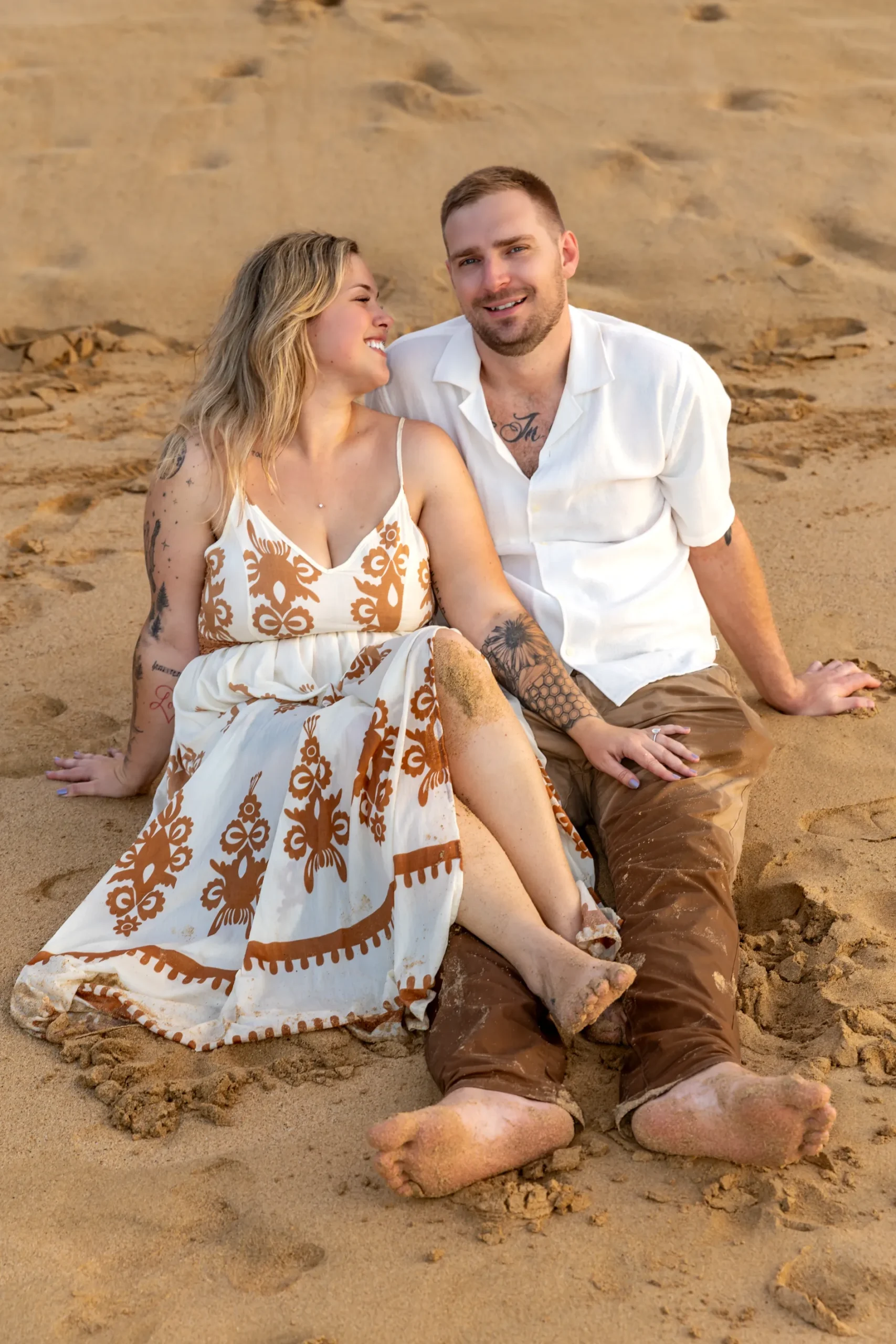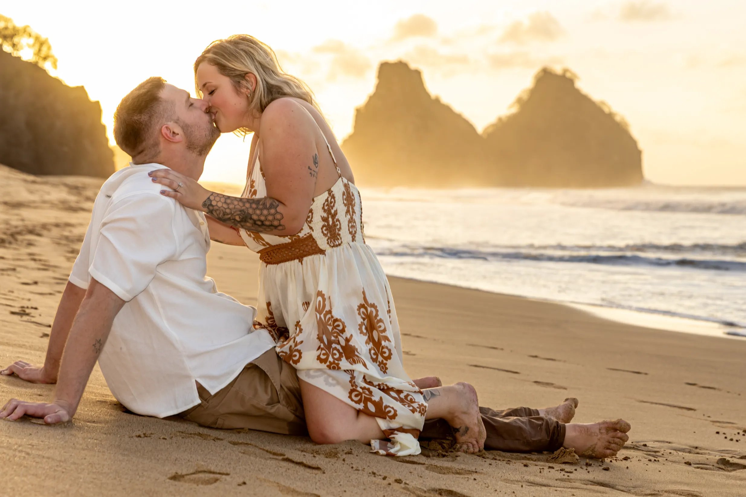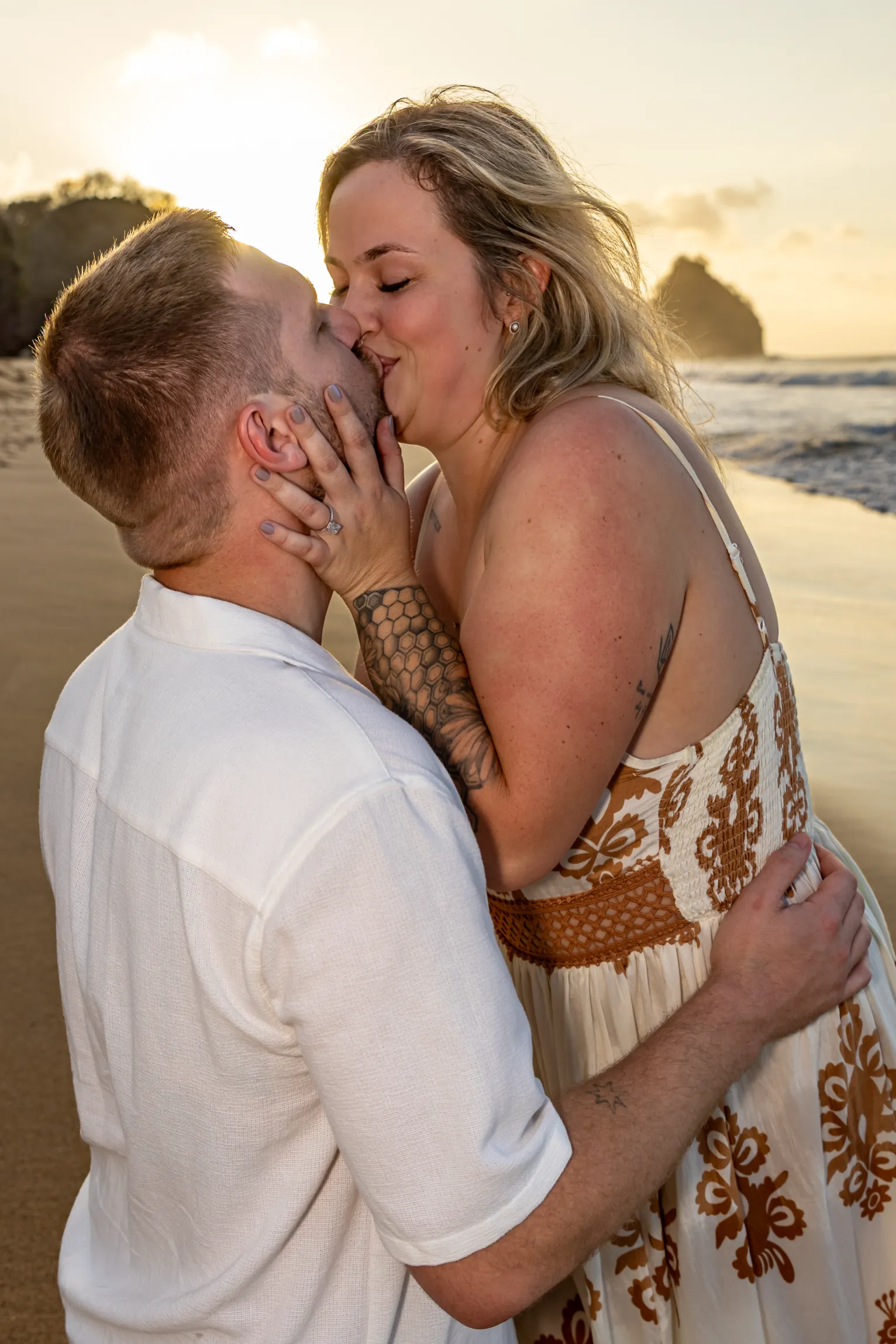 Começamos os cliques próximos ao Bar do Meio, um local que exala a vibração de Noronha. Ali, o Morro do Pico ao fundo emoldurava o sorriso dos dois, enquanto eles caminhavam pela areia. O que a Lexi ainda não sabia era que aquele ensaio “comum” era apenas o prelúdio para algo muito maior que o Brett vinha planejando com carinho.