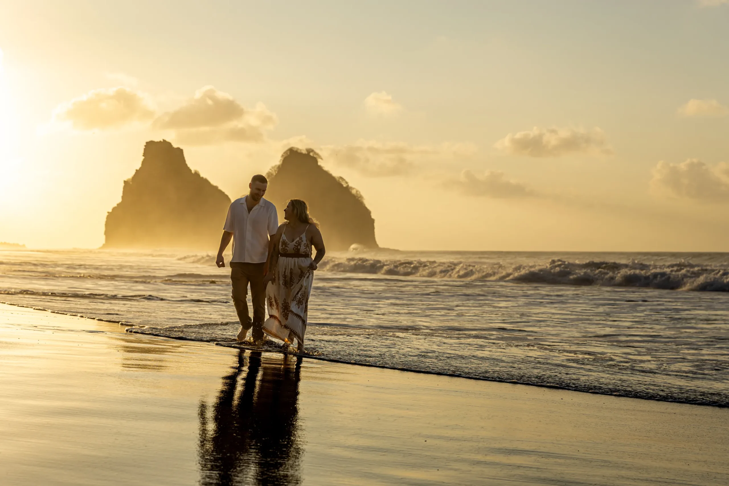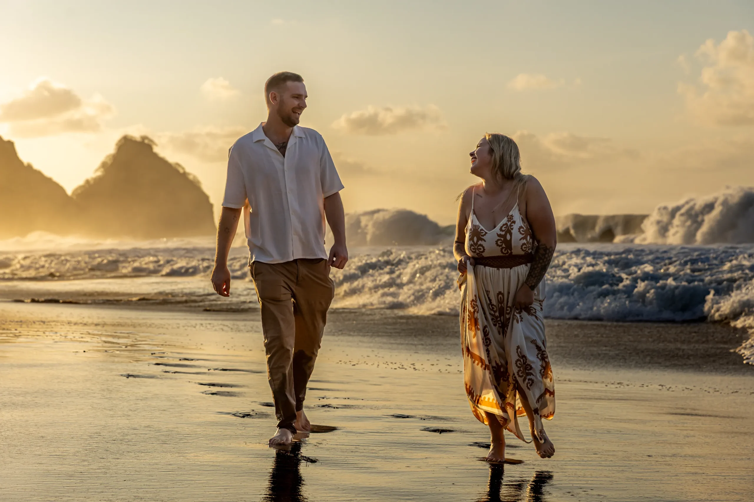 Nosso encontro começou em um dos pontos mais icônicos da ilha: a Praia da Conceição. O clima era de total descontração. Lexi, brasileira, e Brett, australiano, queriam registrar a conexão do casal em meio àquela imensidão azul, aproveitando a luz suave do final de tarde.