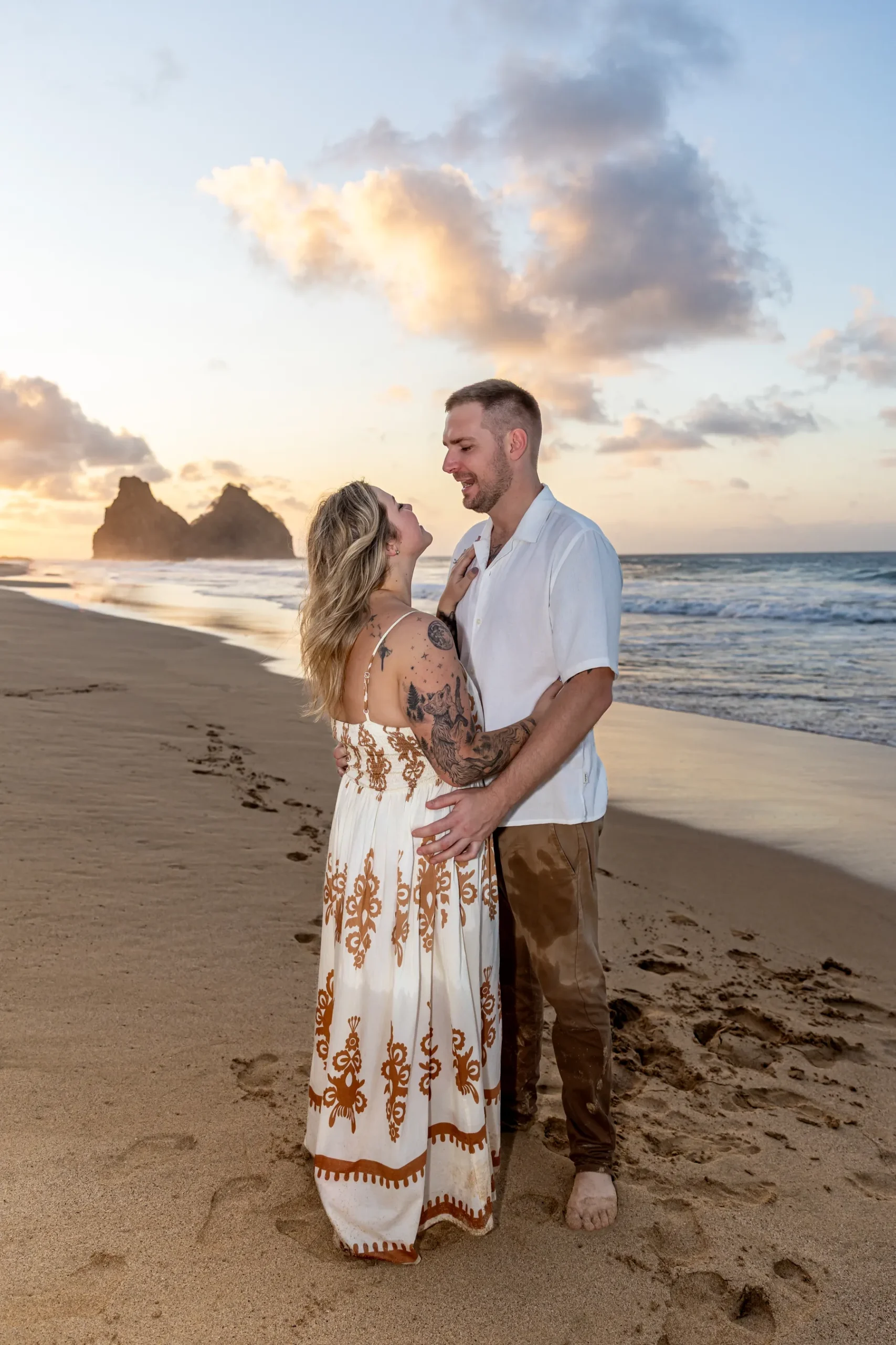 À medida que o sol começava a baixar, seguimos para a Praia do Bode. Essa é uma escolha estratégica para quem busca um pouco mais de privacidade e um visual selvagem. O caminho entre as praias de Noronha oferece texturas e ângulos que valorizam cada fotografia, permitindo que o casal esqueça a câmera e foque apenas um no outro.
